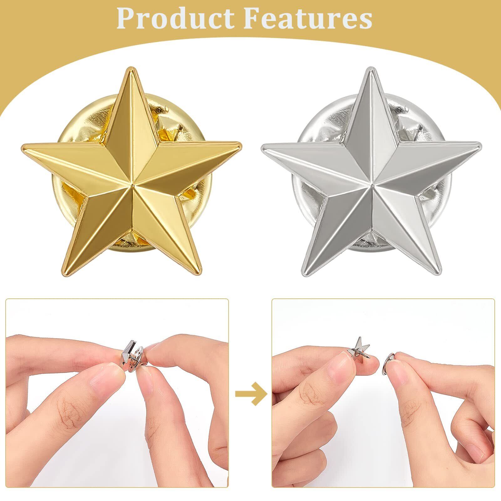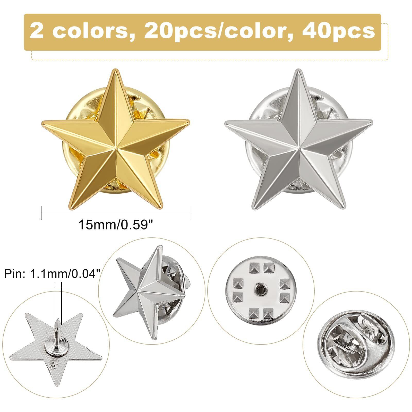 お得な2色40個セット:セットにはプラチナとゴールドのスターピンバッジ各20個を含めます。合計40個です。スターピンバッジの幅約15mm、ピン約1.1mmです。2色と40個の数で、より多くの選択肢を提供します。