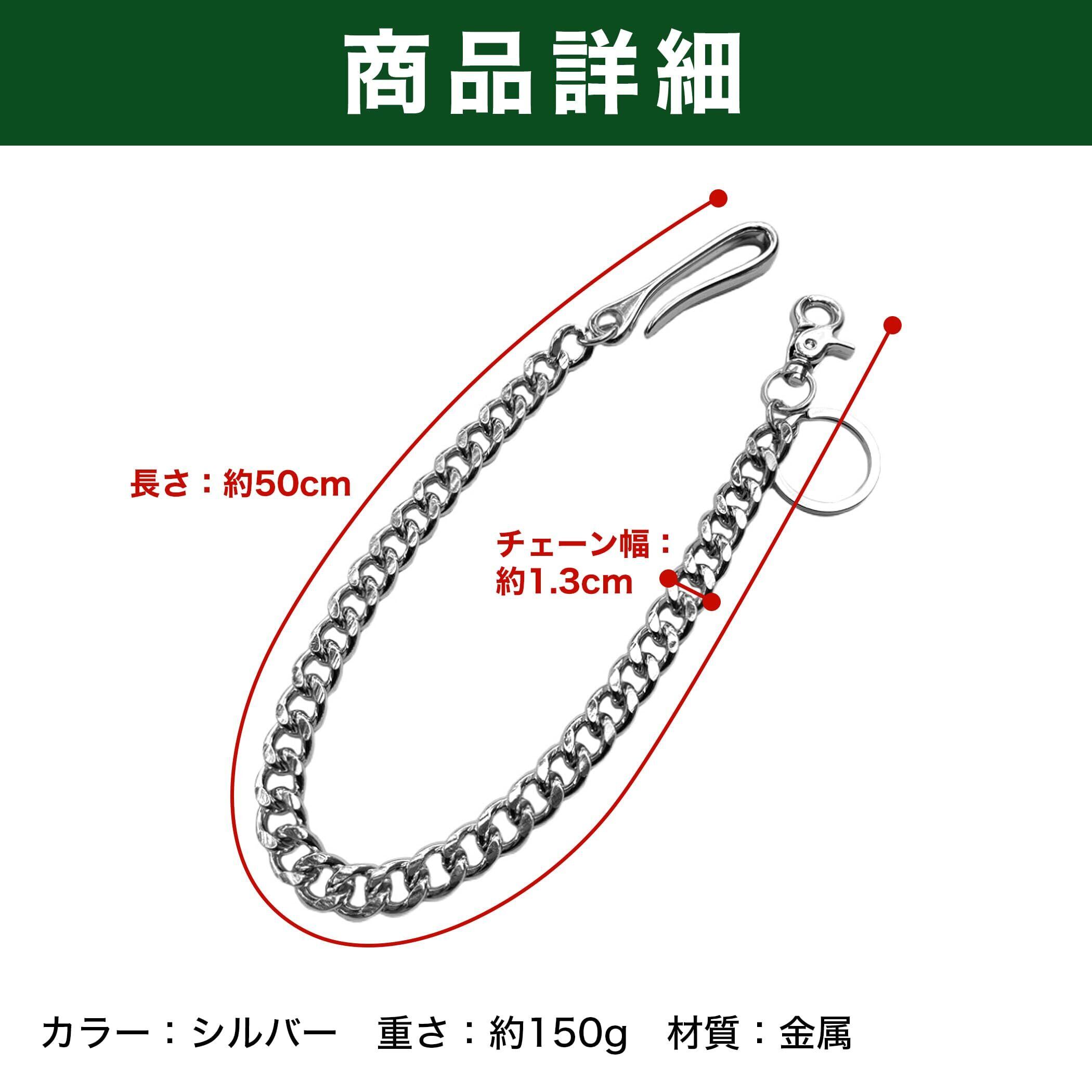 長さ:約50cm チェーン幅:約1.3cm カラー:シルバー 重さ:約150g 材質:金属 ※モニターの環境等により、色の見え方に若干差が生じる場合がございます。