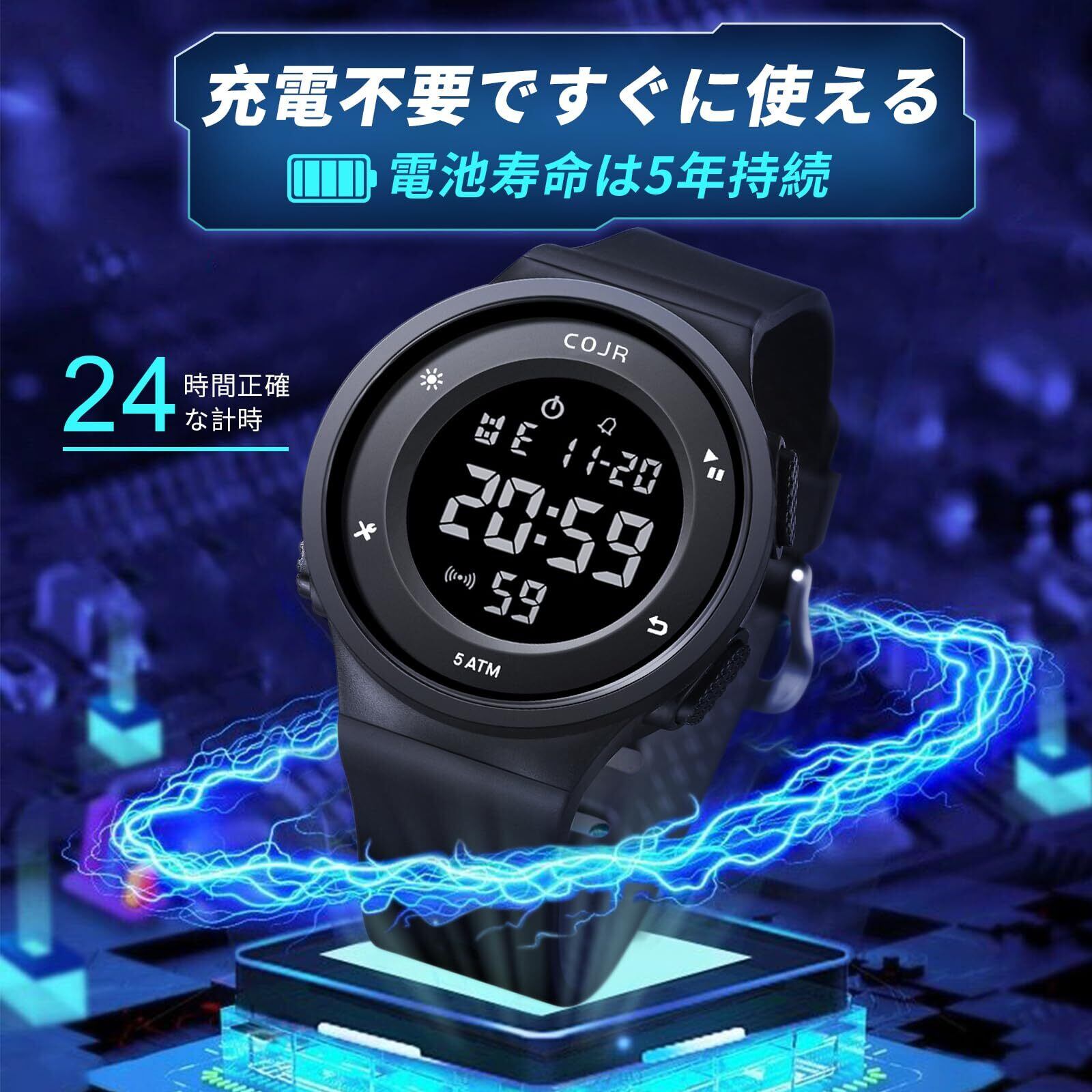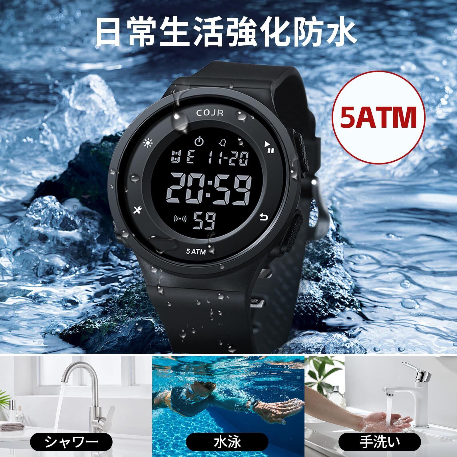 【5ATM防水性能】このデジタル 腕時計は、5ATM防水性能を備え、日常の汗や雨だけでなく、水泳や軽い水仕事にも対応可能です。ただし、温泉やサウナといった高温多湿な場所では、腕時計 メンズ デジタルを保護するため、外すことをお勧めします。