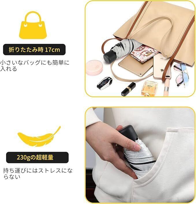 【超軽量&携帯便利】この男女兼用折りたたみ日傘はコンパクトのデザインで、折りたたみ時のサイズは18×5×5cm、重量は約230g、とても小さくて軽いです。バッグに簡単に入れることができ、通学、通勤、遠足、旅行,出張など幅広くご利用できます。