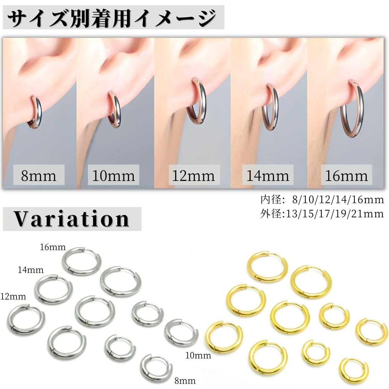 【シーン】定番のリング型のフープピアスです。男女兼用のフープピアス、シンプルなデザインで、日常 デート パーティー等、色々なファッションに合わせることができます。5サイズからお選びいただけますので、様々なシーンで使い分けることができます。