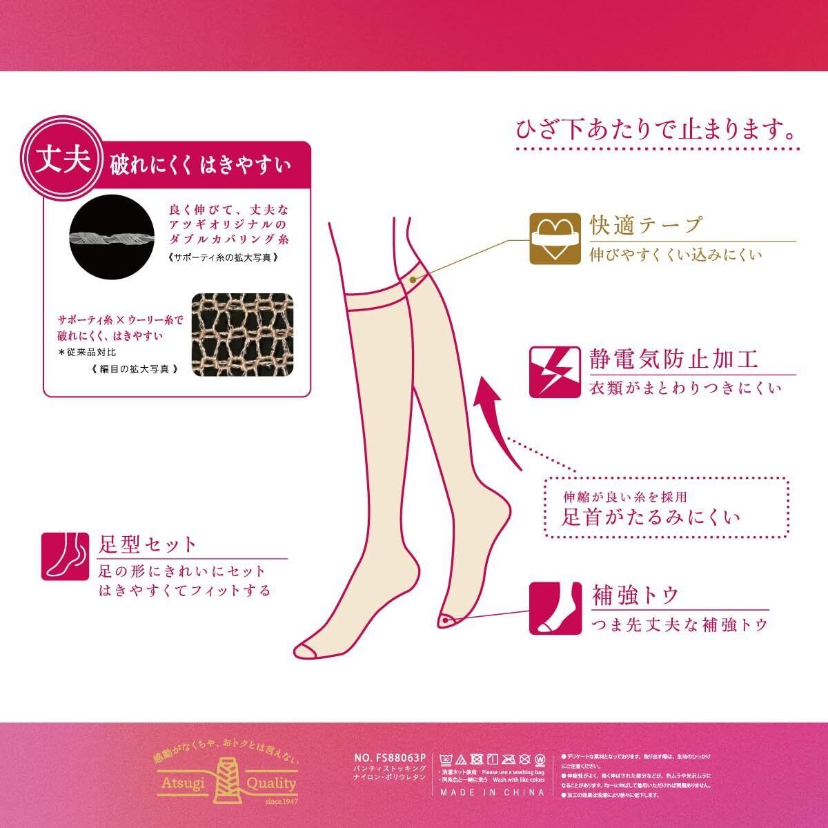 良く伸びて丈夫なアツギオリジナルの糸で編んでいるので脚にきれいにフィット!