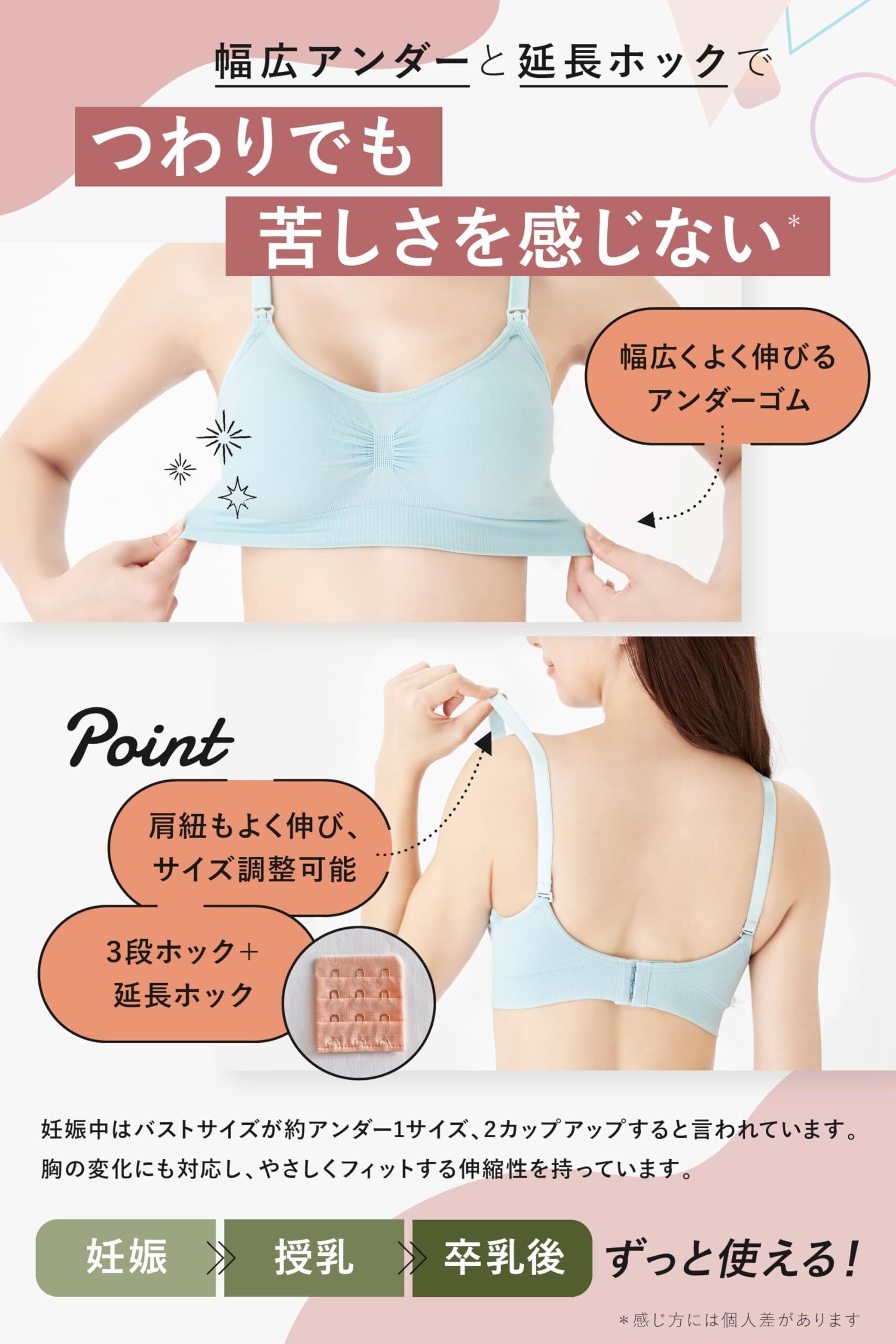 【つわりでも苦しさを感じない】幅広くよく伸びるアンダーゴムを採用、肩紐もよく伸びサイズ調整可能、背中のホックは3段+延長ホック(ブラエクステンダー)が付いているので、身体に合わせてサイズ調整できます。