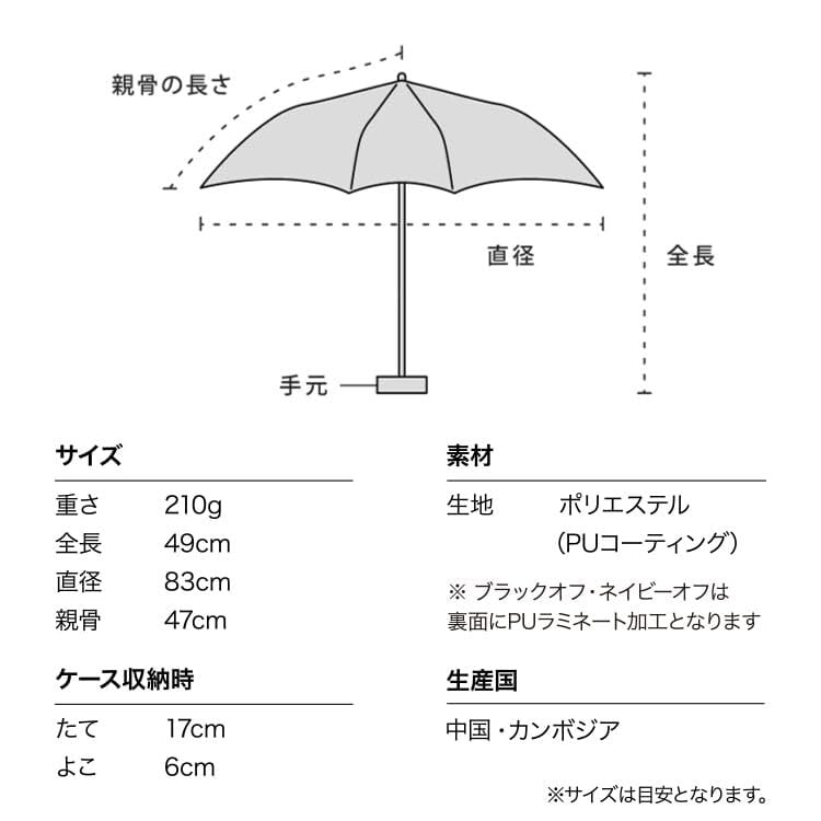【雨の日も使える日傘(晴雨兼用)】 この製品は日傘としてお使い頂くことを主としていますが、はっ水防水加工を施しているため雨傘としてもお使いいただけます。 ※激しい雨や長時間の雨傘としてのご使用は雨漏りや色落ちの原因となる可能性がございます。 またデザインの特性上、完全な防水はっ水加工が難しい場合があり、雨が染み込むことがありますのでご注意ください。