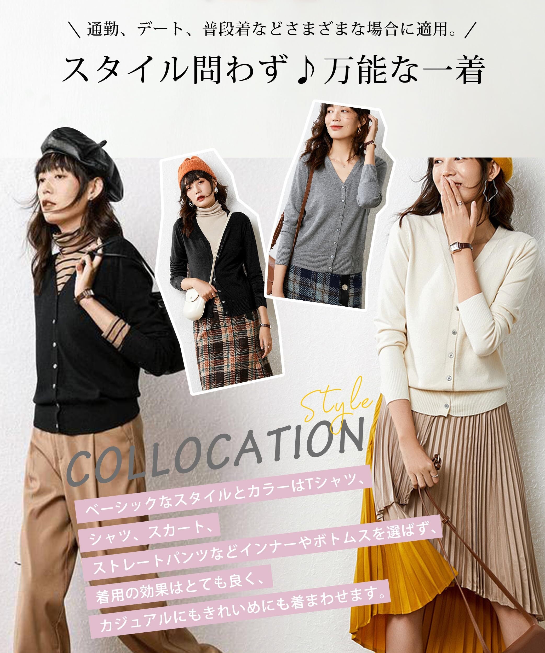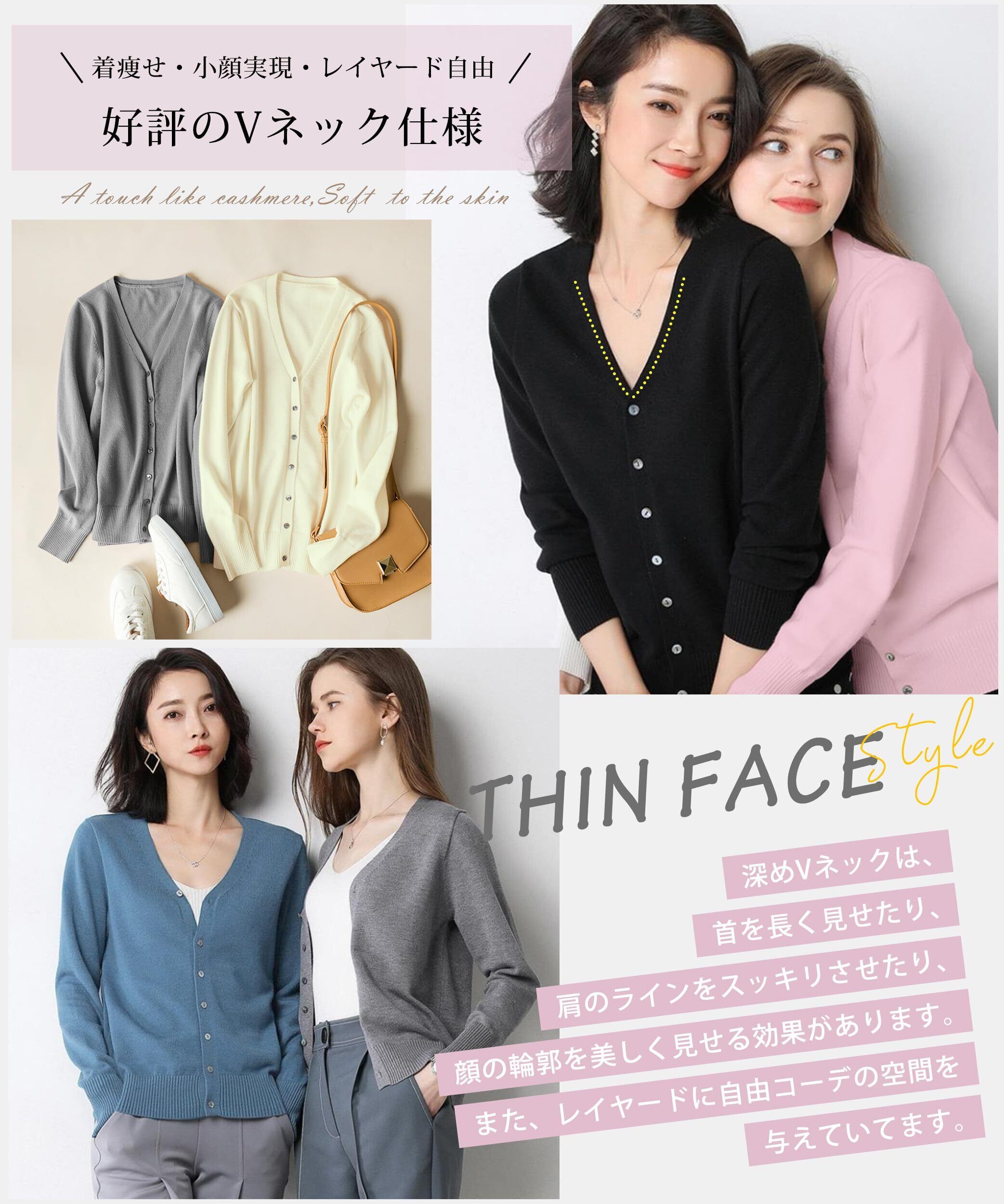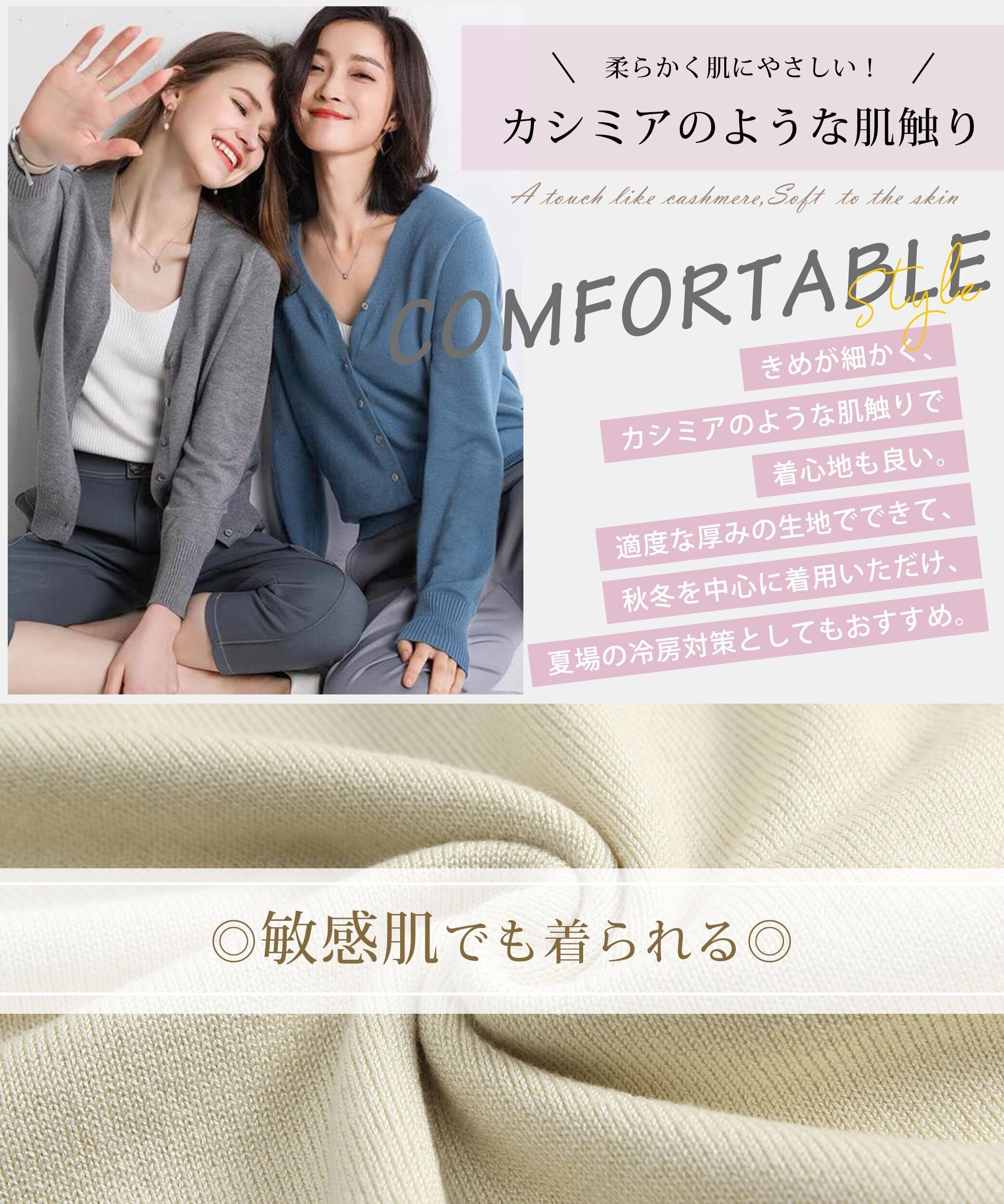 【着回せるヘビロテ必須なアイテム】カーディガンとして羽織りにしたり、ボタンを留めてプルオーバーとしても着回せるヘビロテ必須なアイテム。フロントにはこだわりのシェルボタンをあしらい上品で女性らしい雰囲気に。ベーシックなシルエットにアクセントをプラス。首元はフェミニンな深めのVネックです。デコルテラインをきれいに見せて女性らしさを際立たせます。裾と袖口はリブで切り替えられているので、腰回りや手首はスッキリとしています。