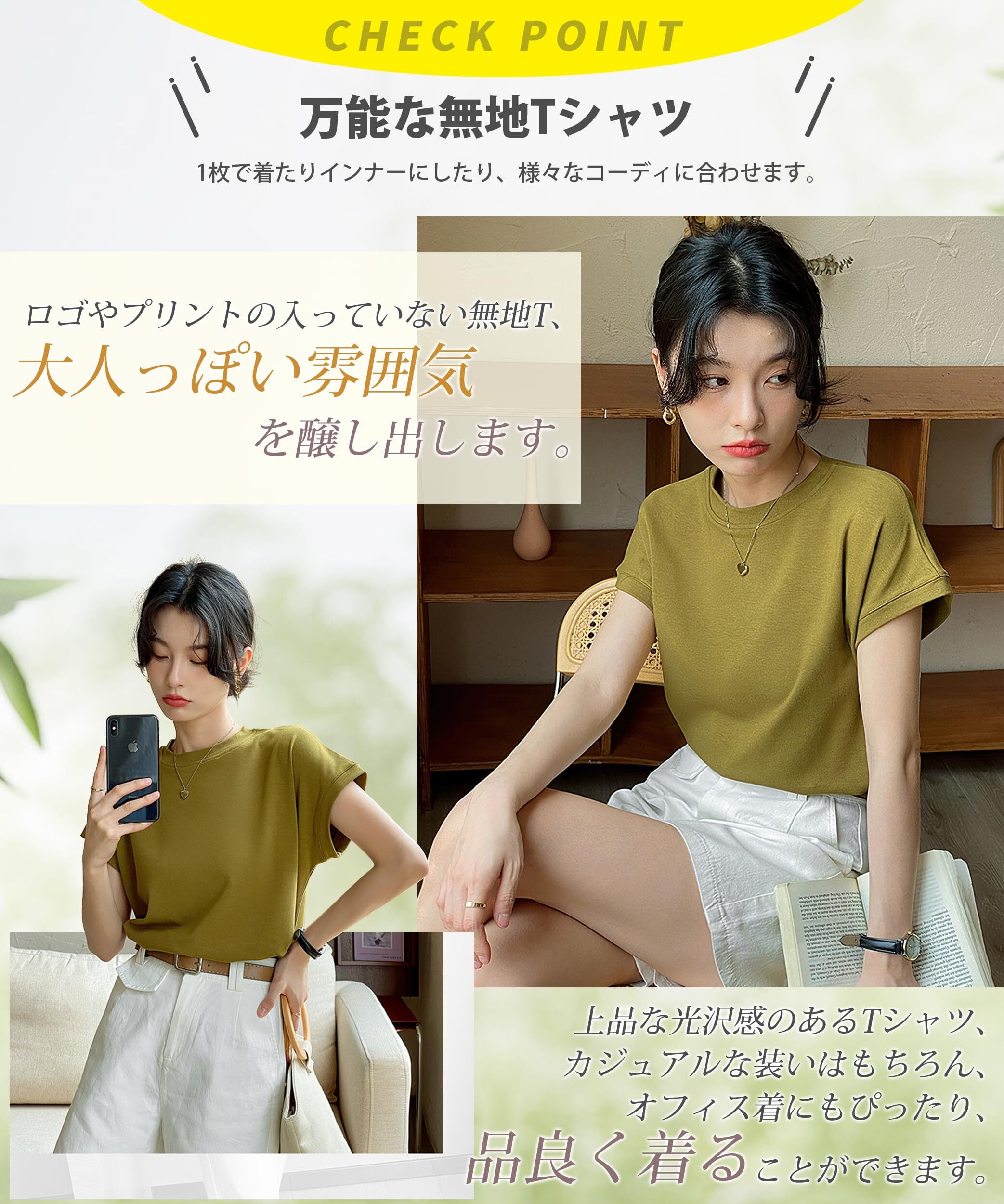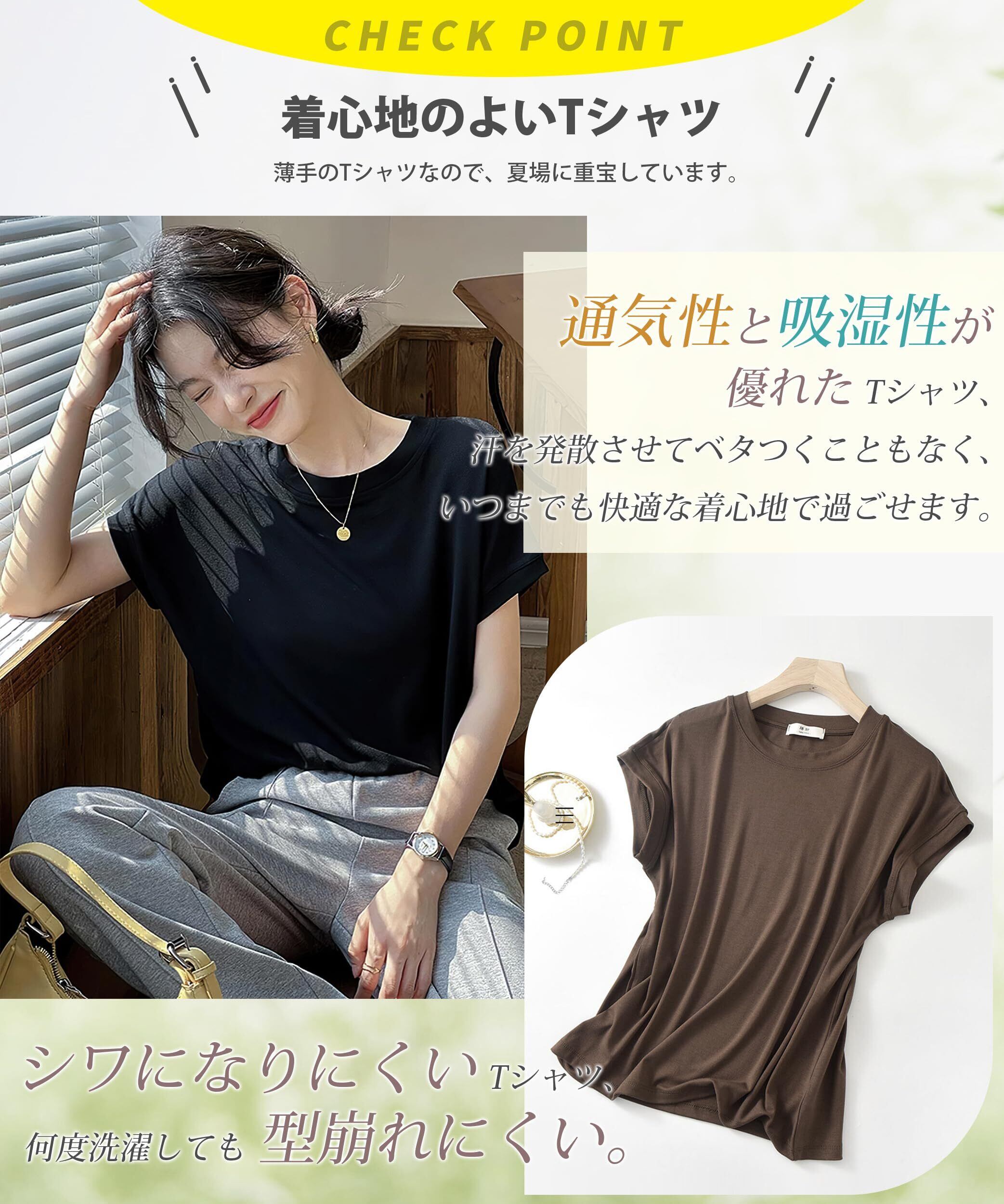 【ソフトな着心地】ソフトな肌触りの生地を採用しており、フィット感満点のTシャツ。柔らかな着用感で、素肌に優しく、チクチク感がありません。快適さと上質さを兼備したTシャツ、体のラインを拾いにくい。爽やかな印象を与えたTシャツ、美シルエットに。スラックスやスカートと合わせれば、すっきり着こなすことができます。