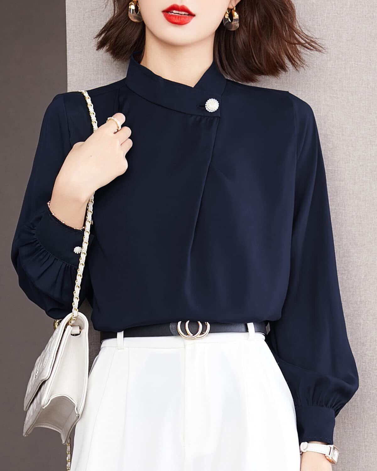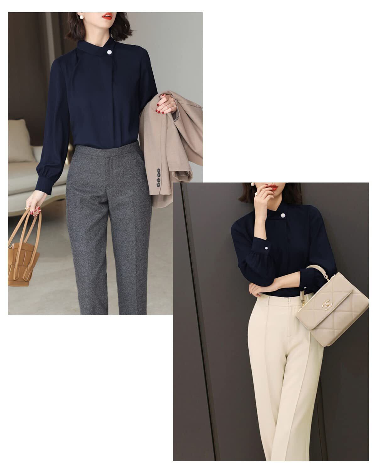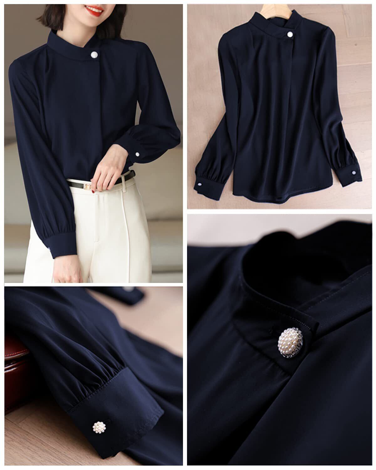 パール風の優しさを主役として、底に高級感あるダイヤ風と合わせ、1つボタンだけでセンスをアップしたブラウスがこの秋に新登場しました。すっきりとした立ち襟、ユニークなボタン掛けデザイン、全身に立体感を作り出すタック加工、という3POINTの組み合わせは普通のシャツをワンランク上にして、知的で上品なレディーになります。落ち感の生地で体型問わず、着痩せ効果が抜群です。