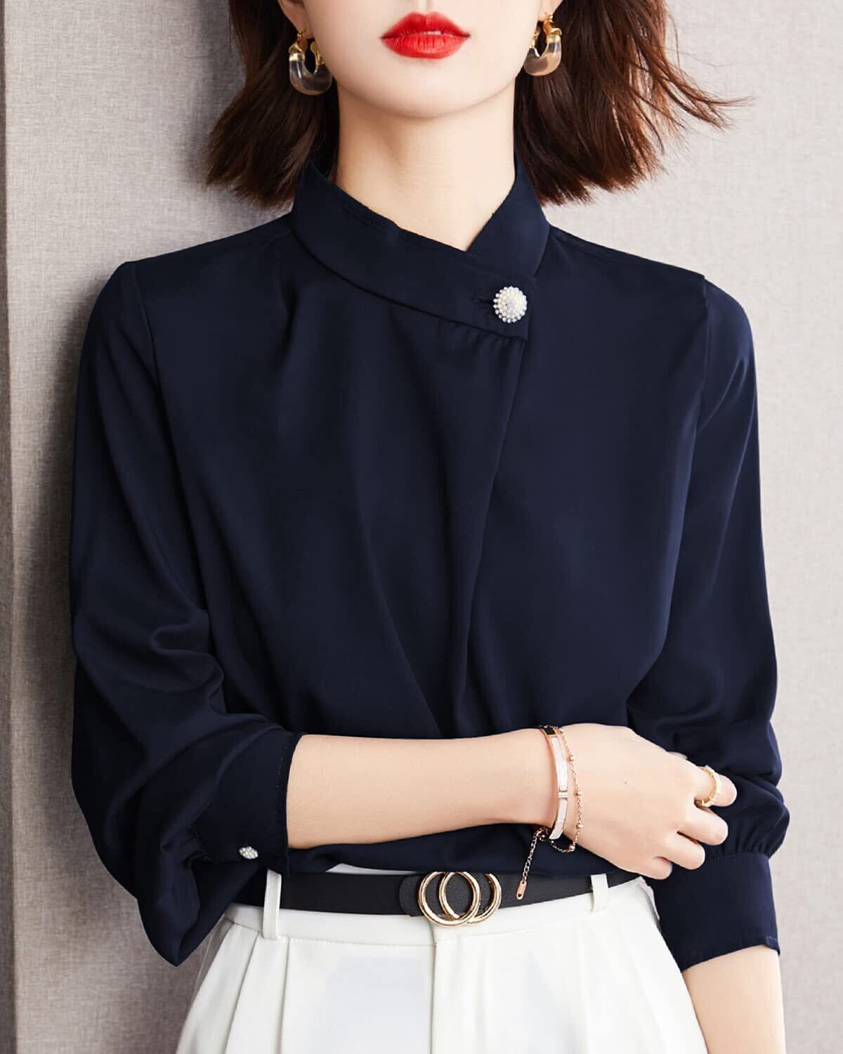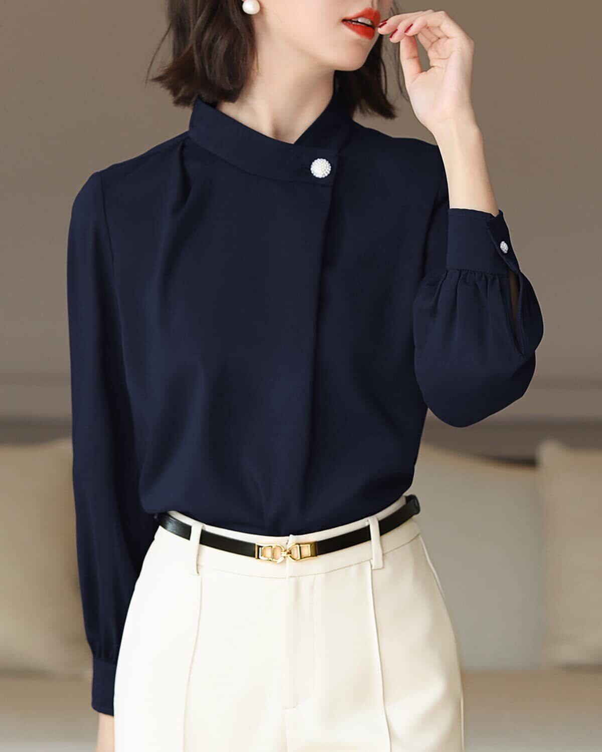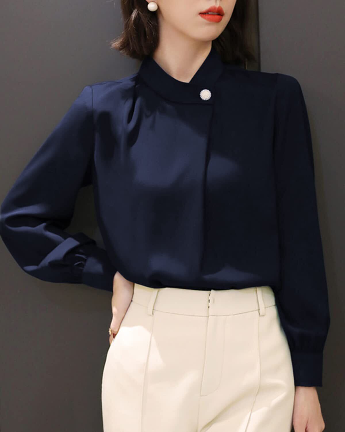 パール風の優しさを主役として、底に高級感あるダイヤ風と合わせ、1つボタンだけでセンスをアップしたブラウスがこの秋に新登場しました。すっきりとした立ち襟、ユニークなボタン掛けデザイン、全身に立体感を作り出すタック加工、という3POINTの組み合わせは普通のシャツをワンランク上にして、知的で上品なレディーになります。落ち感の生地で体型問わず、着痩せ効果が抜群です。