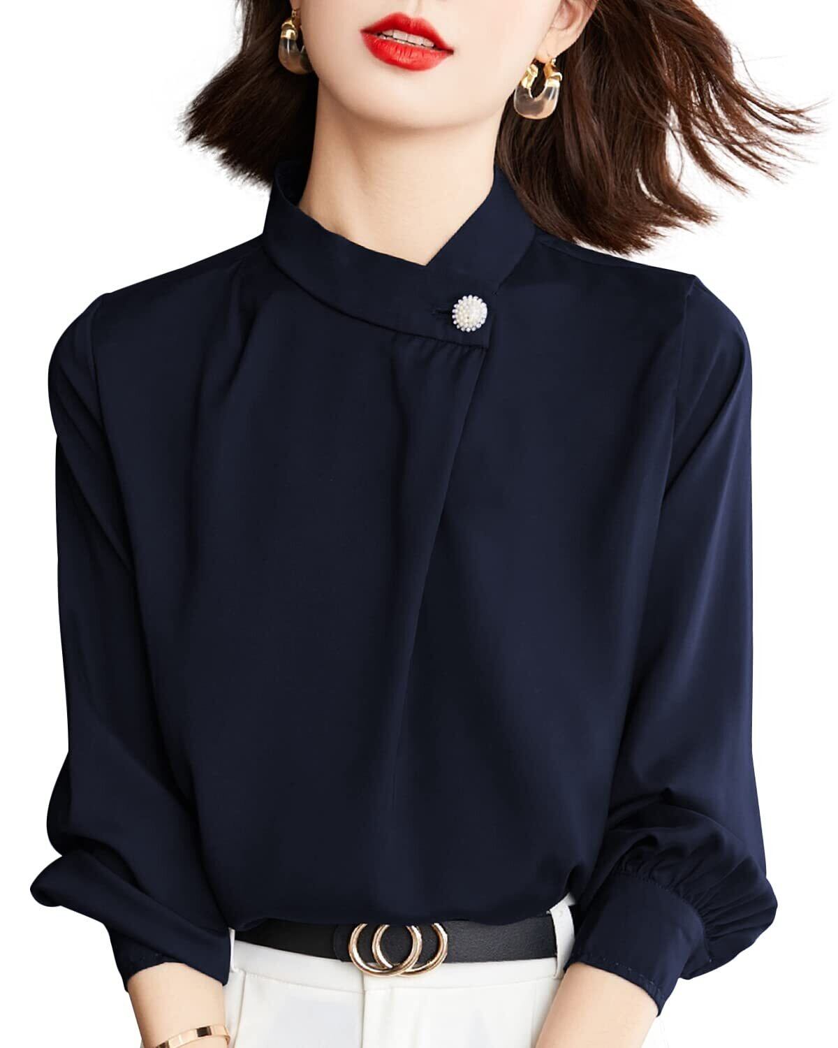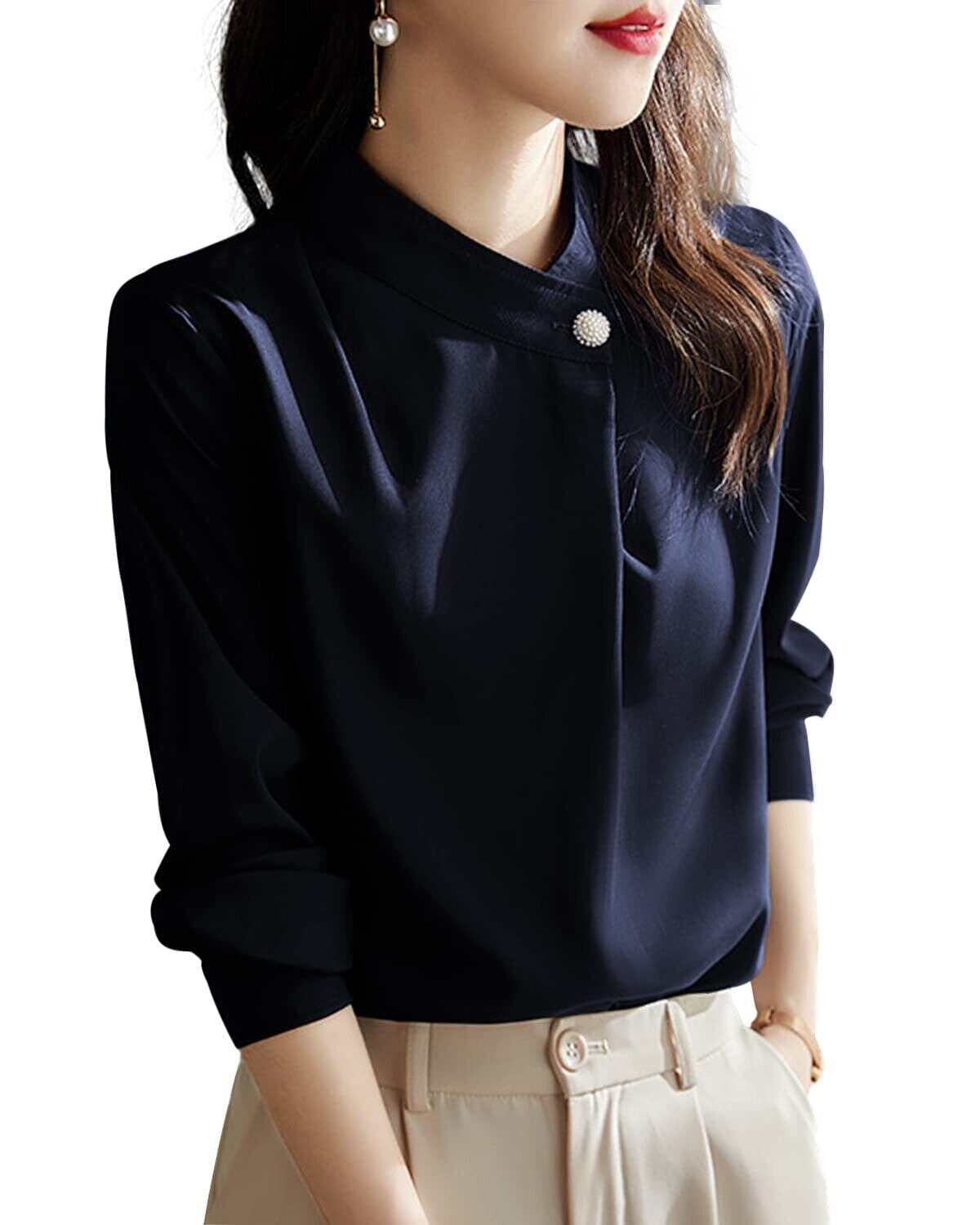 [Sueeya] スイーヤ シャツ ブラウス レディース パール 立ち襟 長袖 タック 知的 ギャザー 上品 着やせ 体型カバー おしゃれ エレガント 着回し デート ビジネス 通勤 トップス 秋 冬