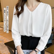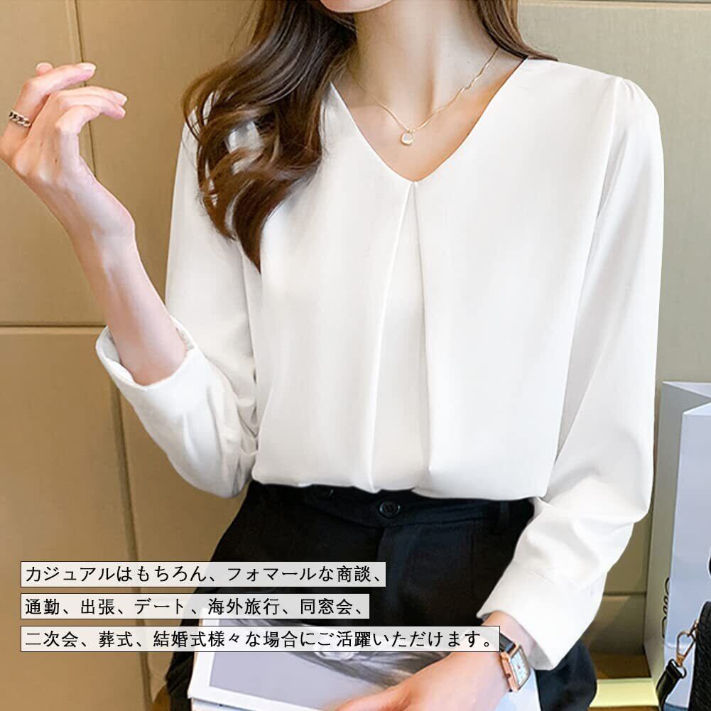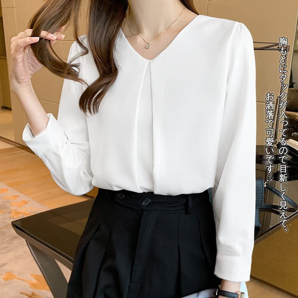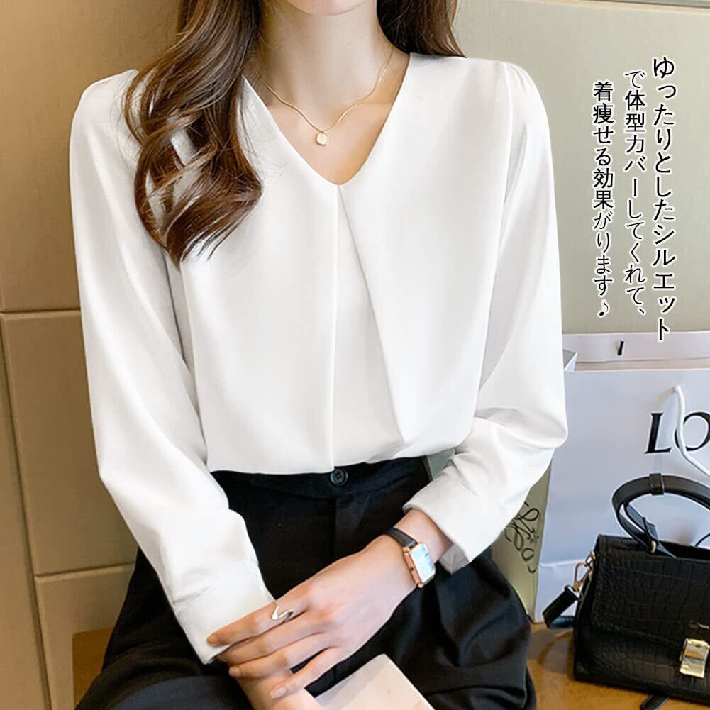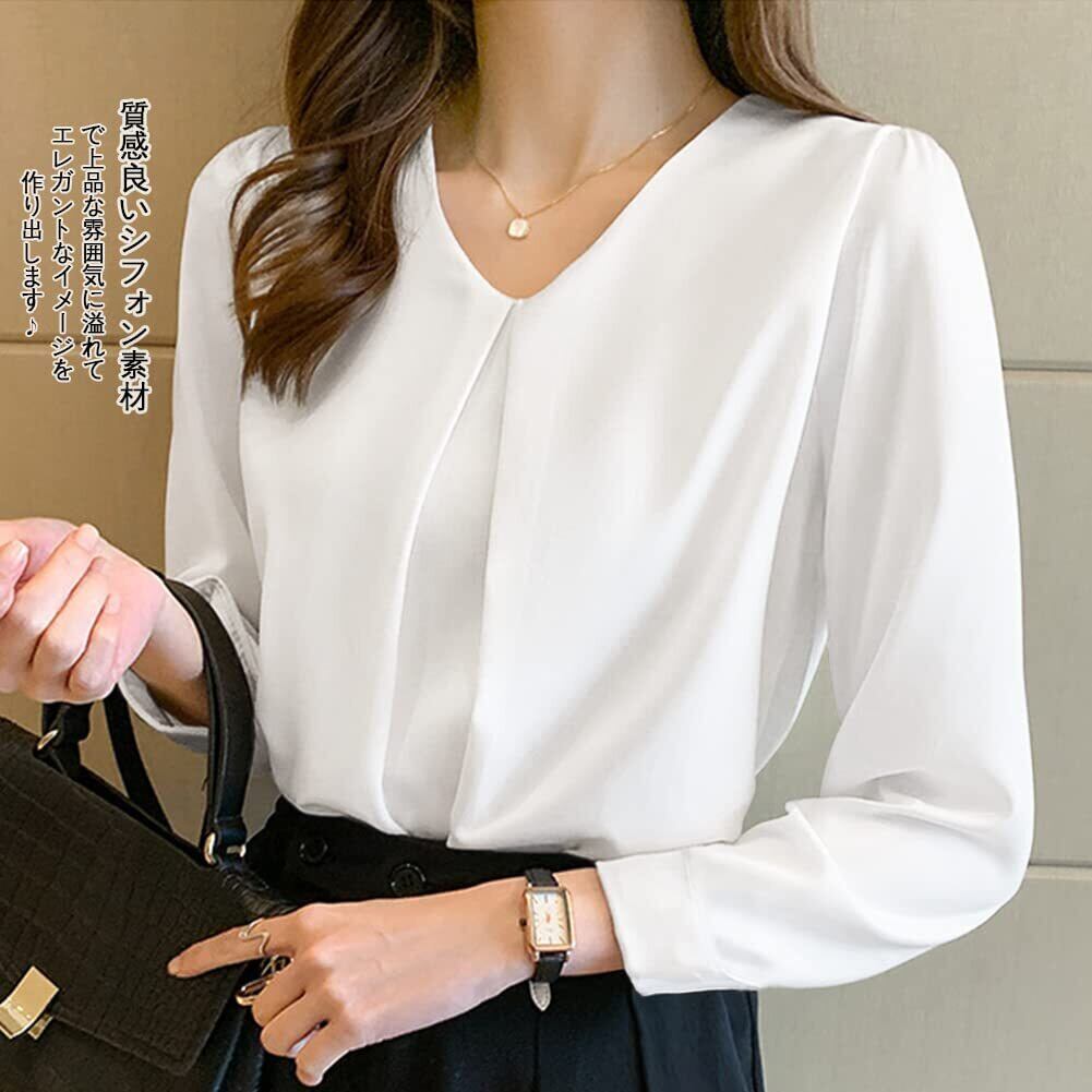 ◎レディース長袖のブラウスです。Vネックなので首周りがスッキリ見えて小顔効果があって女性らしい魅力を引き出します。質感良いシフォン素材で上品な雰囲気が溢れてエレガントなイメージを作り出します。ゆったりとしたシルエットで体型カバーしてくれて、着痩せる効果が期待できます。長袖なので肌寒い日に着用できます。これからの秋と冬にご愛着いただけるトップスです。