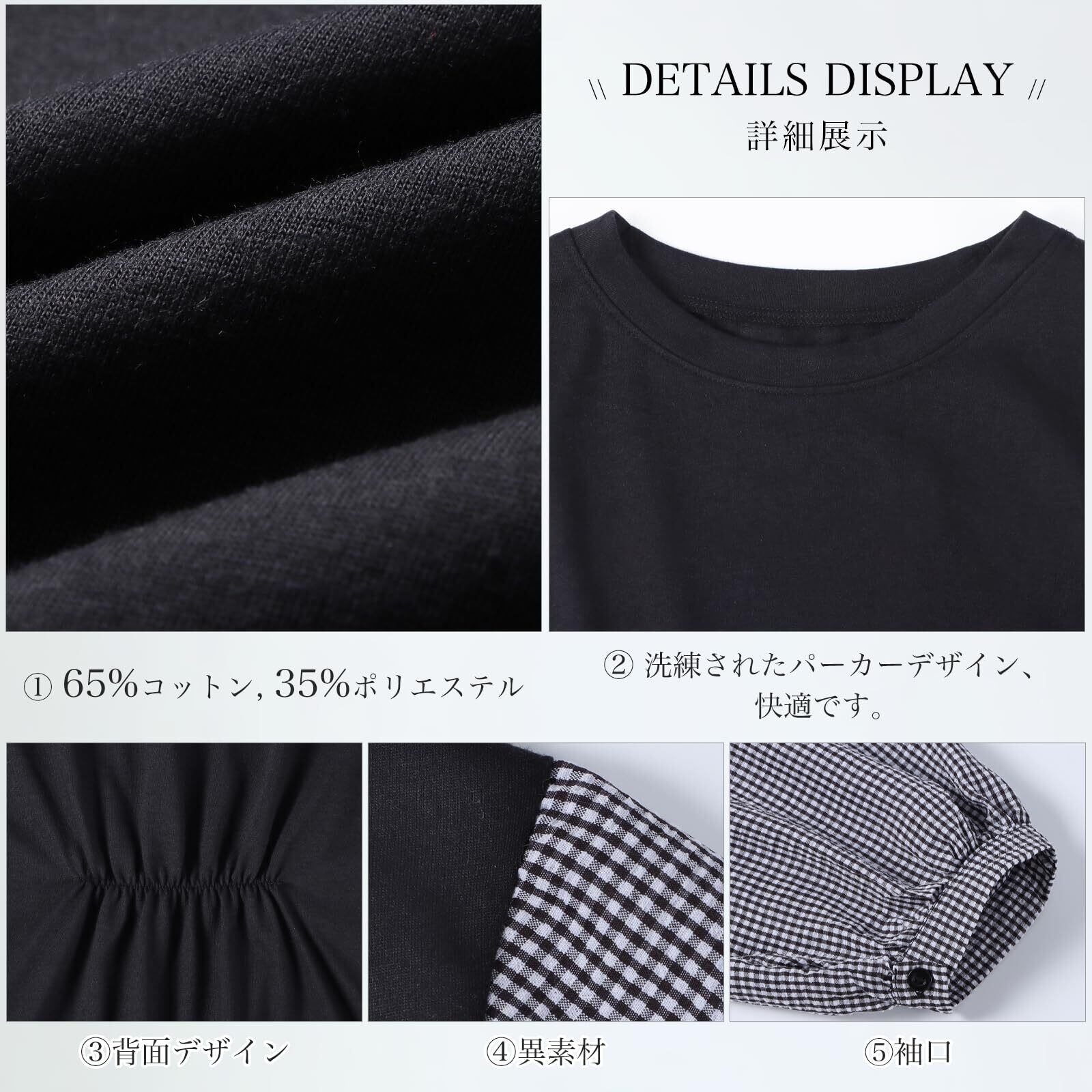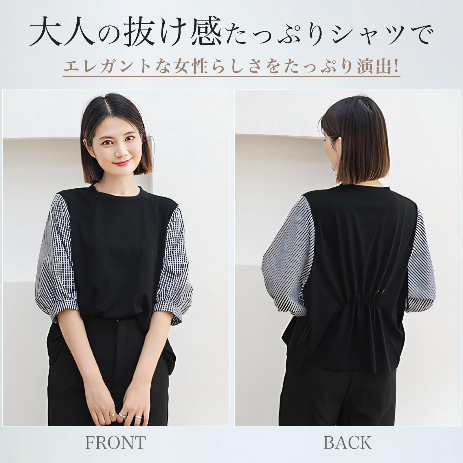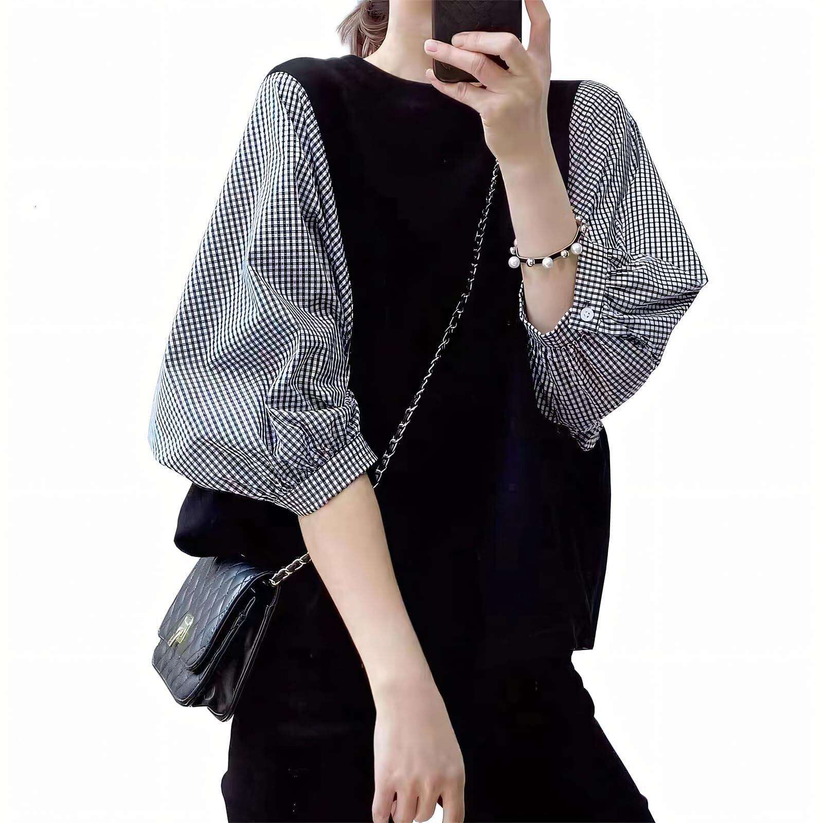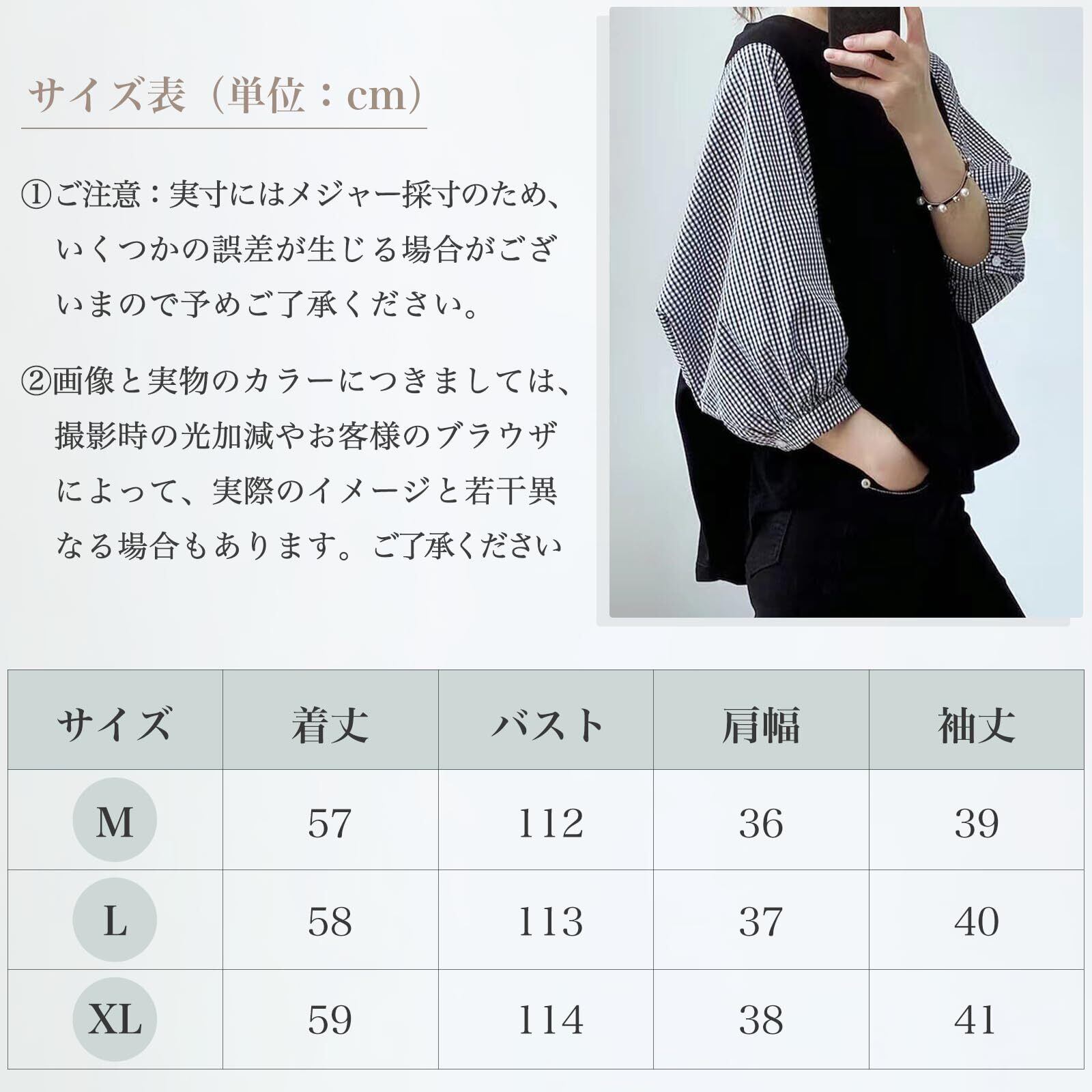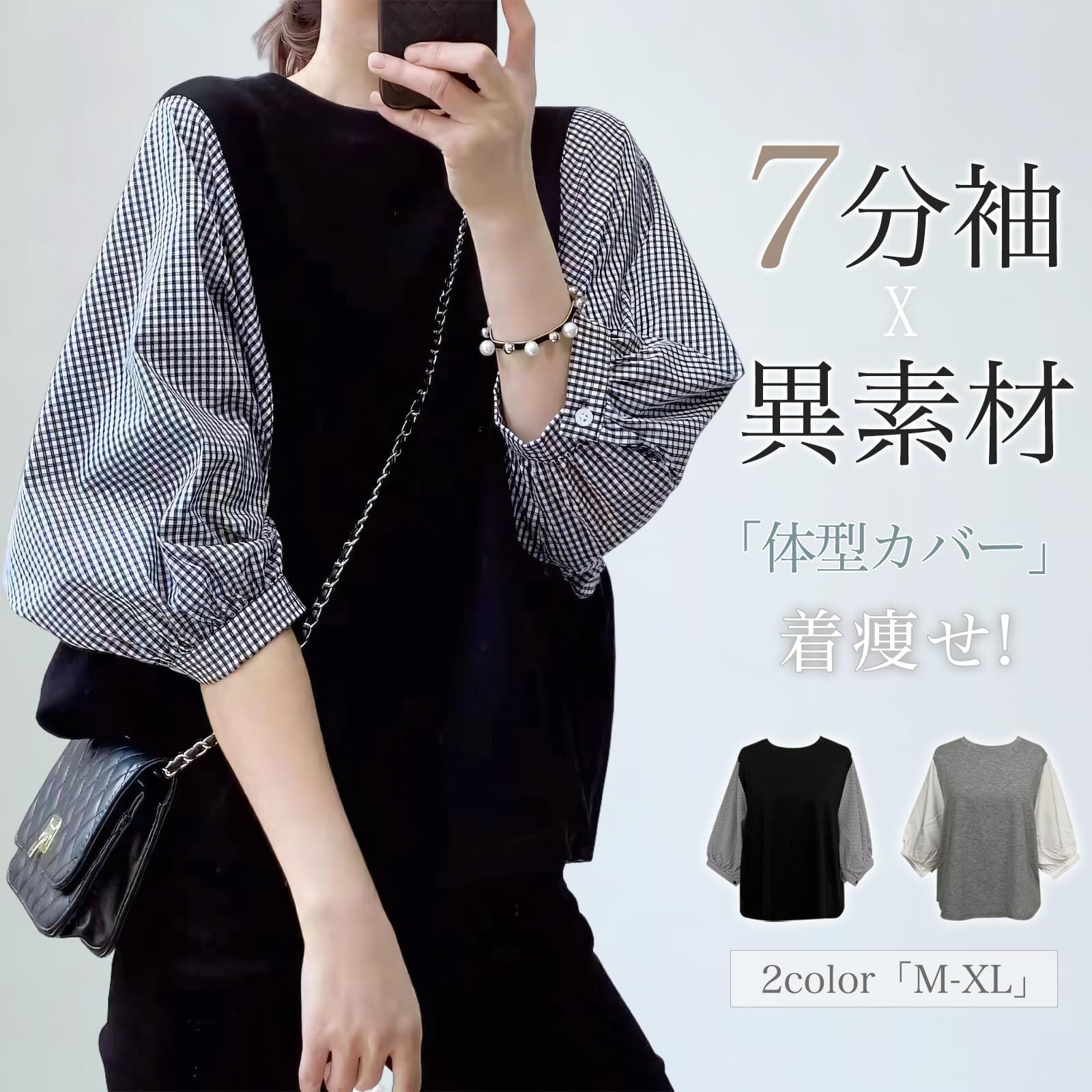 【オシャレなデザイン】パフスリーブ、異素材切り替えデザイン。チェック柄の切り替えがパッと目を惹くポイントになっています。ゆったりとした七分袖が軽やかな印象を与えて、気になる両腕を隠すこともできます。ブラウスの背面はゴムがあり、余計なゆったりを縮め、視覚的にスリムになる。