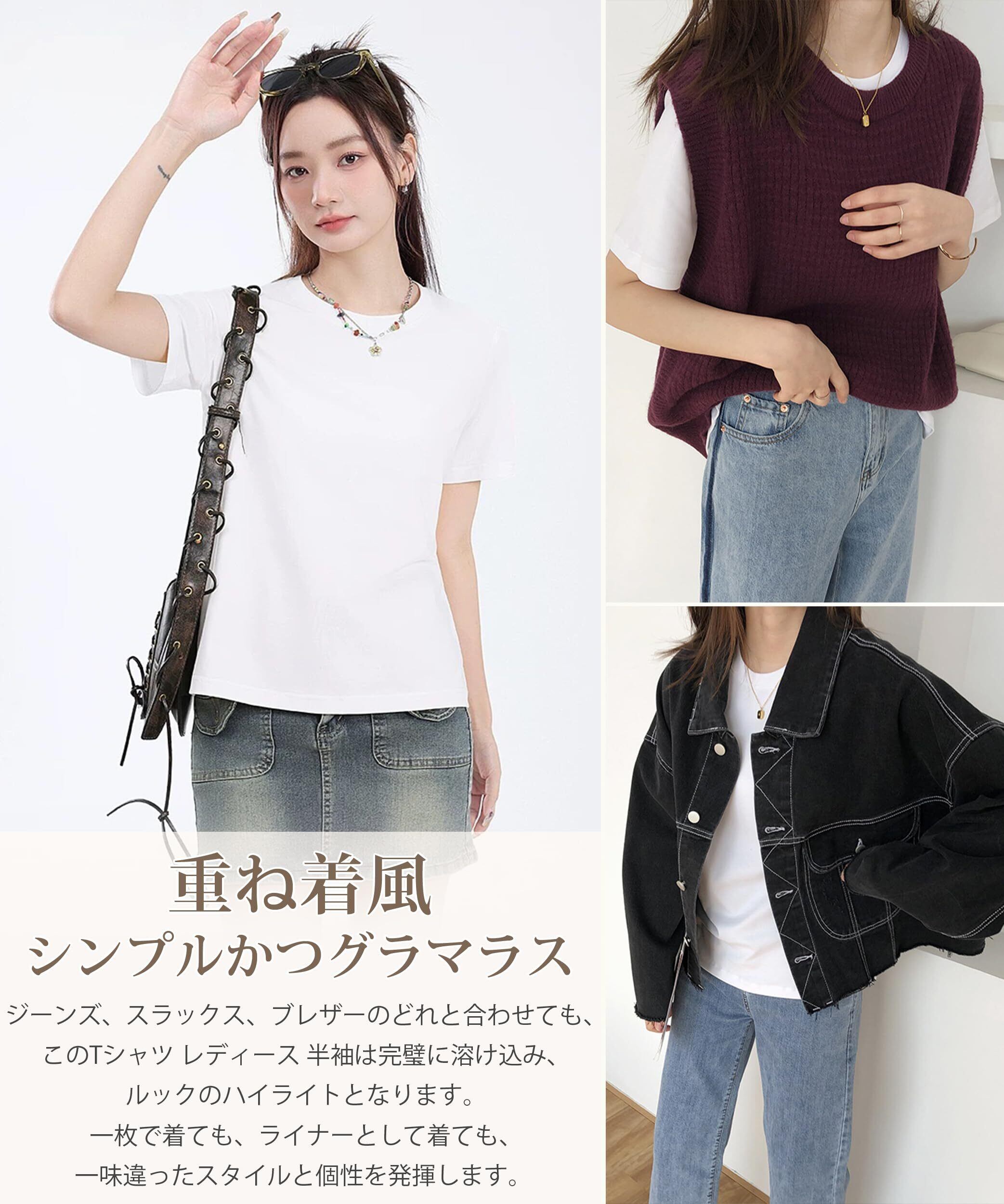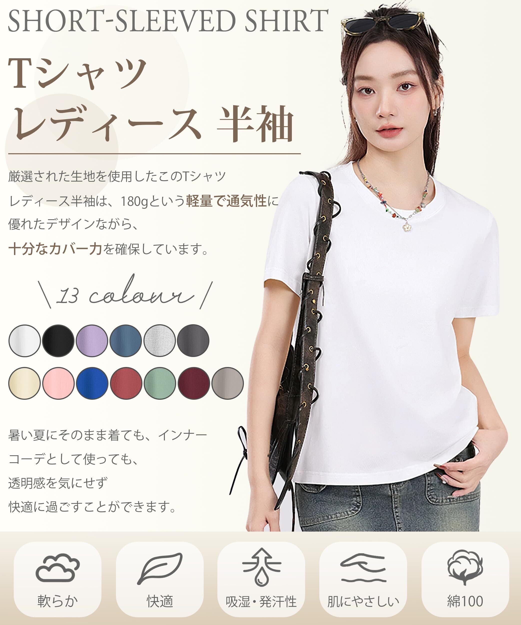 【数量限定】[EAXGO] 【6.35オンス x 綿100】 Tシャツ レディース 半袖 【フィット感の再定義・「独自ライン効果」で着痩せ】ティーシャツ シャツ トップス 重ね着 ゆったり 着回しカ 無地 透け防止 体型カバー おしゃれ | 無意味ステッカー