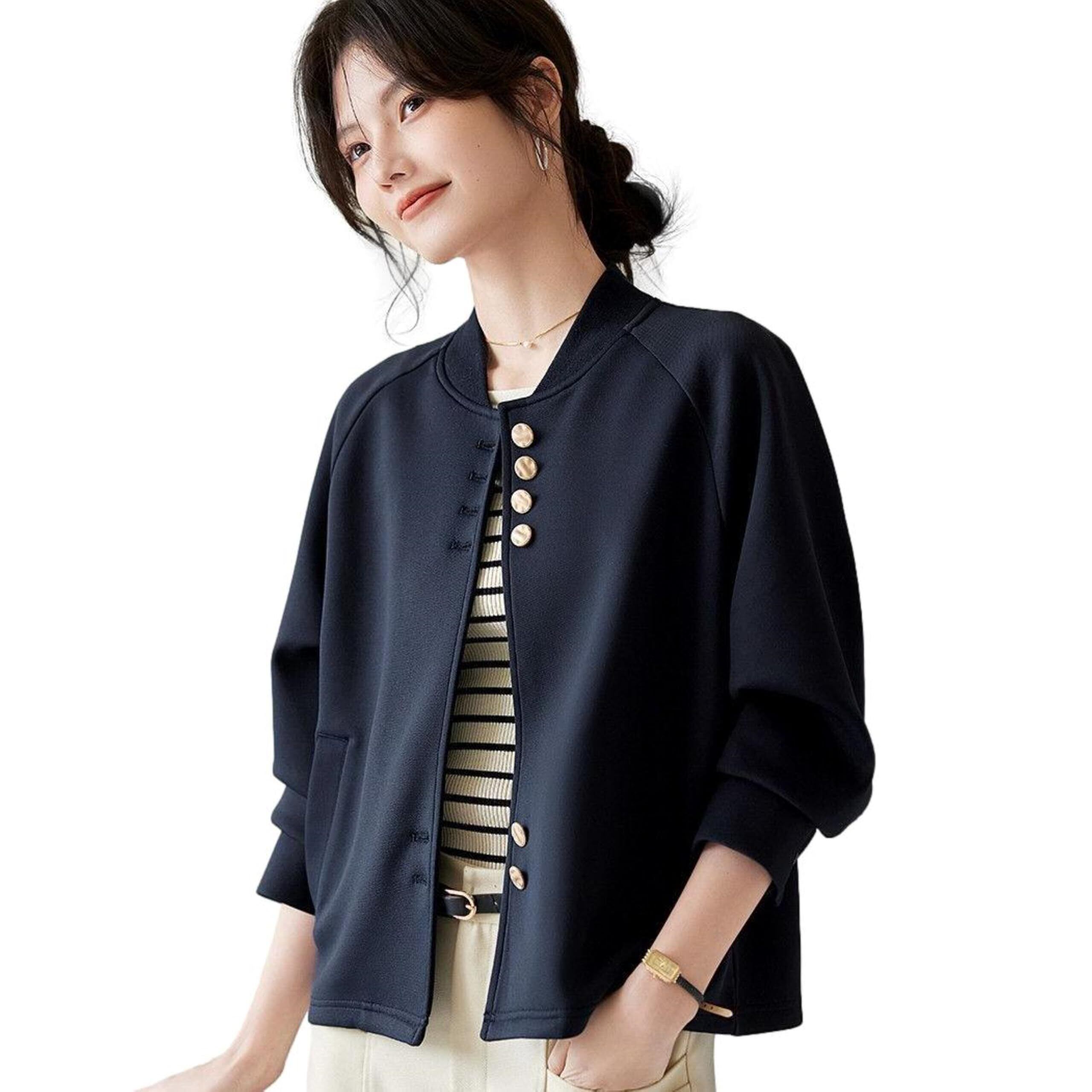 【ほんのりスポーティー×上品ディテールの良バランス】 ゆったりとした身幅を残しつつ抜け感のあるシルエットが、すっきりとした印象に導いてくれるアイテム。スタジャンのように、スタイルをカジュアルで軽やかな印象に仕上げてくれるラグランスリーブが、シルエットをすっきりと仕上げてくれます。変則的に並べられたゴールドのボタンが、上品でユニークなスタイルのアクセントになって。立体感を生む両サイドのポケットも、大人にはうれしいポイントです。