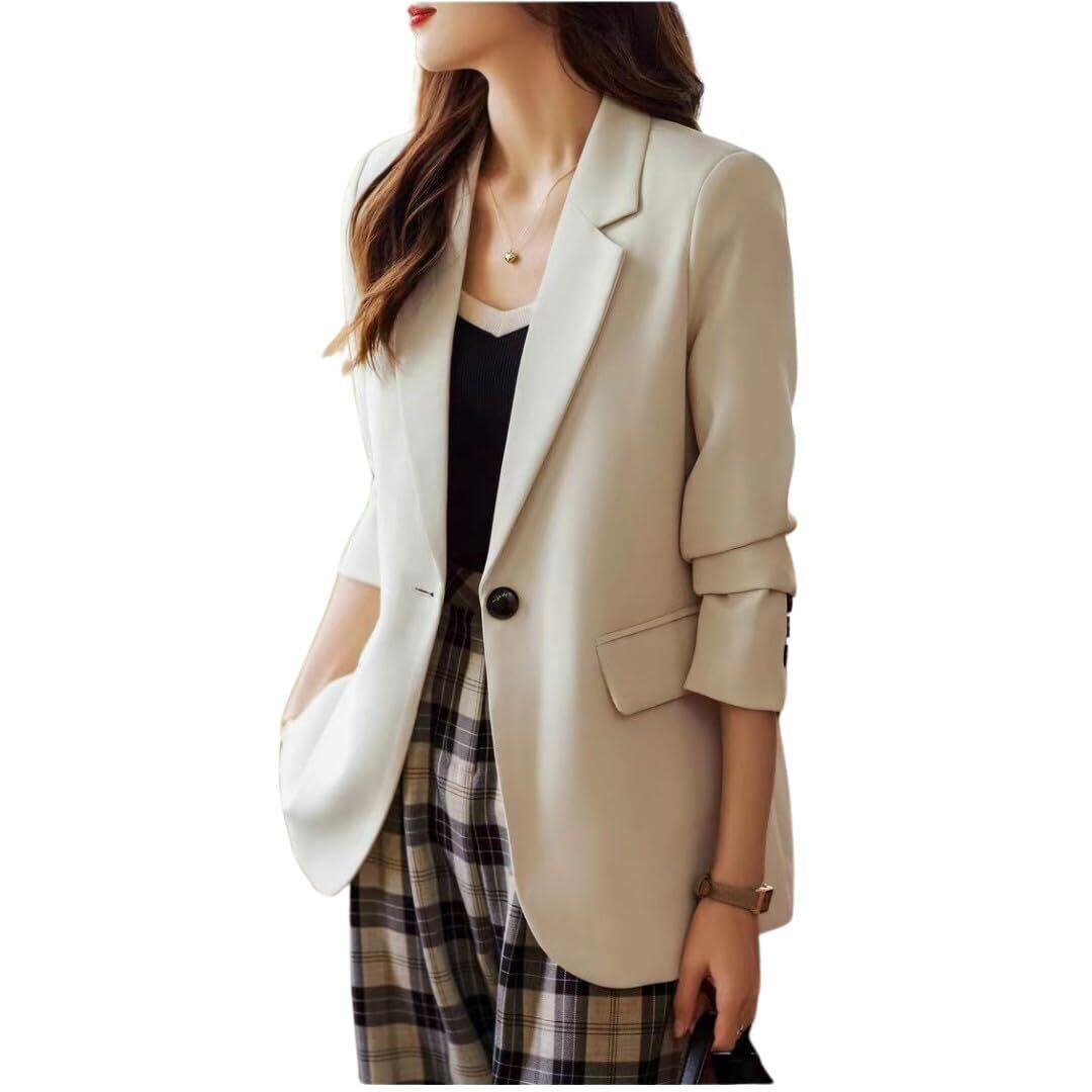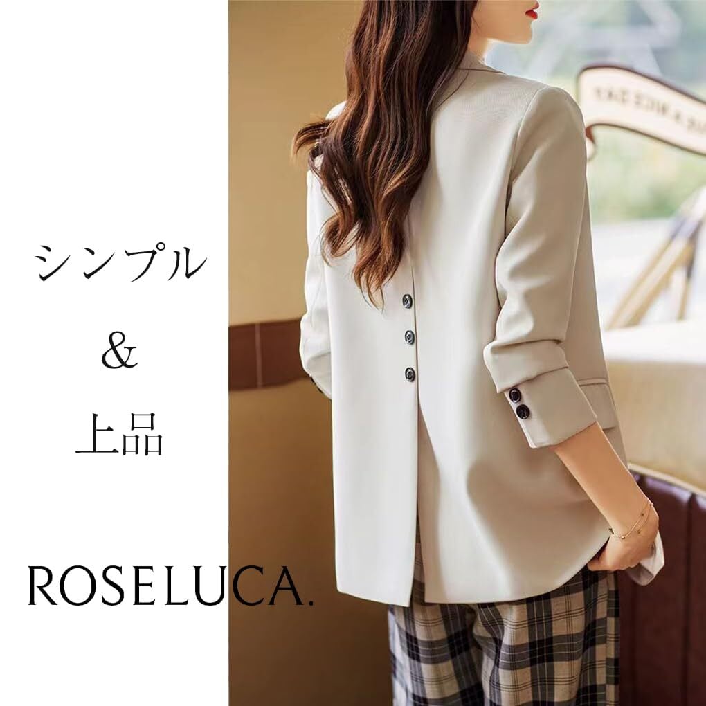通常のジャケットとは異なり、背中にボタンがあしらわれているユニークなデザインです。ボタン部分がスリットのようになっており、動きやすさと抜け感を演出しています。後ろ姿にもアクセントがありおしゃれな一着です。 しっかりとした質感の生地で、フォーマルにもオフィスカジュアルにも使える万能な春服のレディースジャケットです。