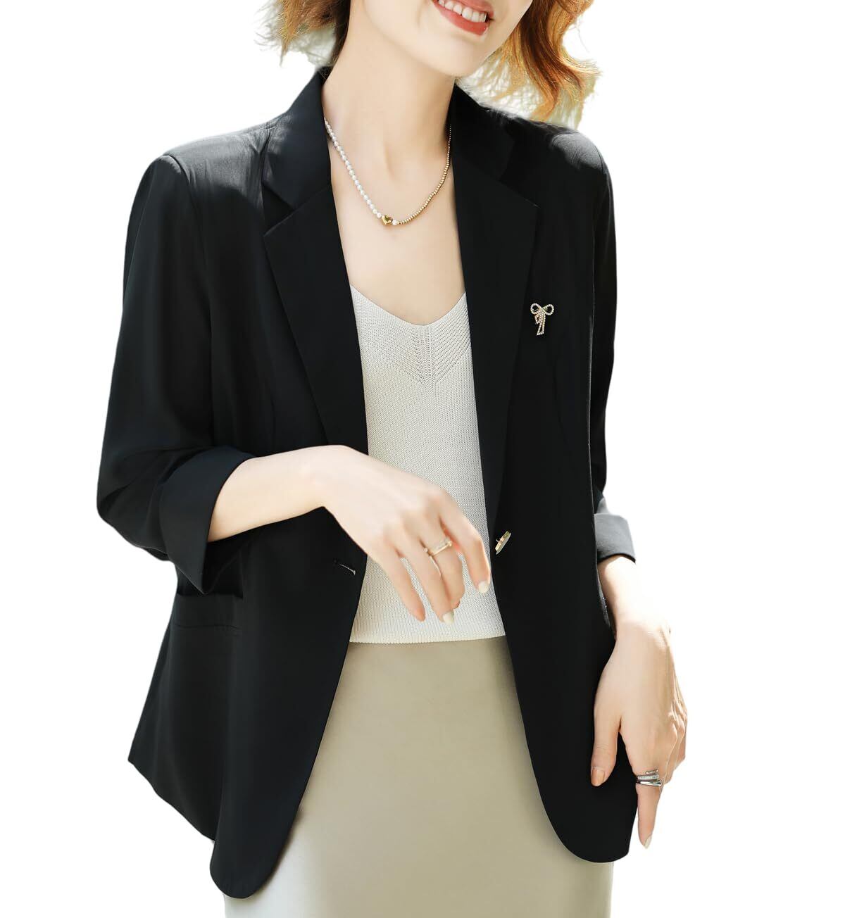 夏のオフィスやフォーマルシーンに最適な、エレガントな七分袖テーラードジャケットです。グレーの洗練された色合いと、薄手の冷感素材を採用し、暑い季節でも快適な着用感を実現しました。シンプルで上品なデザインは、オフィスウェアとしてはもちろん、様々なスタイリングに活用できます。フロントの一つボタンと胸元のリボンブローチがアクセントとなり、女性らしい柔らかな印象を演出します。サイドポケット付きで機能性も備えており、軽やかな着心地ながらもきちんとした雰囲気を保てる一着です。インナーを変えることで、カジュアルからビジネスまで幅広いシーンで活躍します。薄手素材でありながら、しっかりとした縫製で型崩れしにくく、長くご愛用いただけます。
