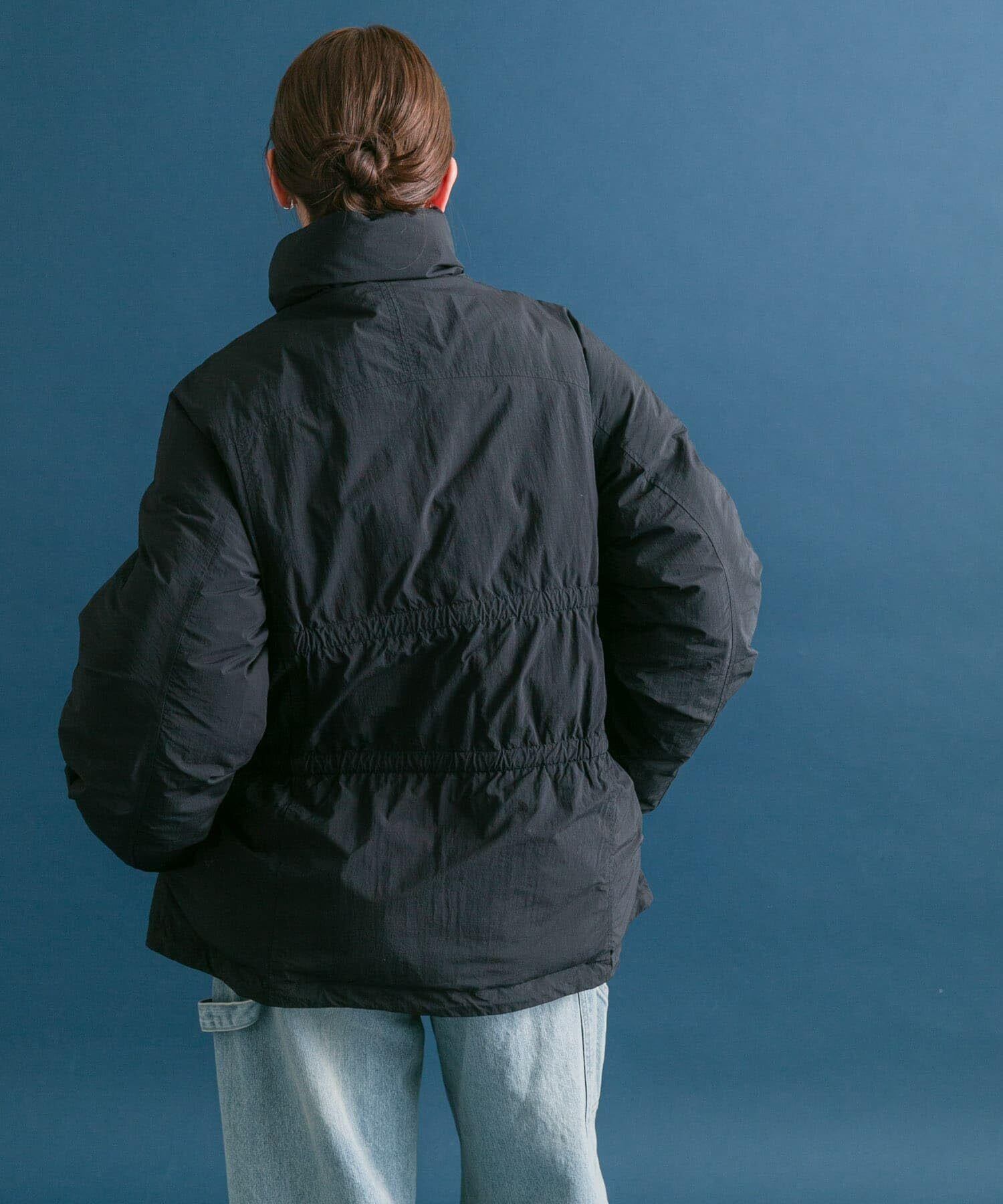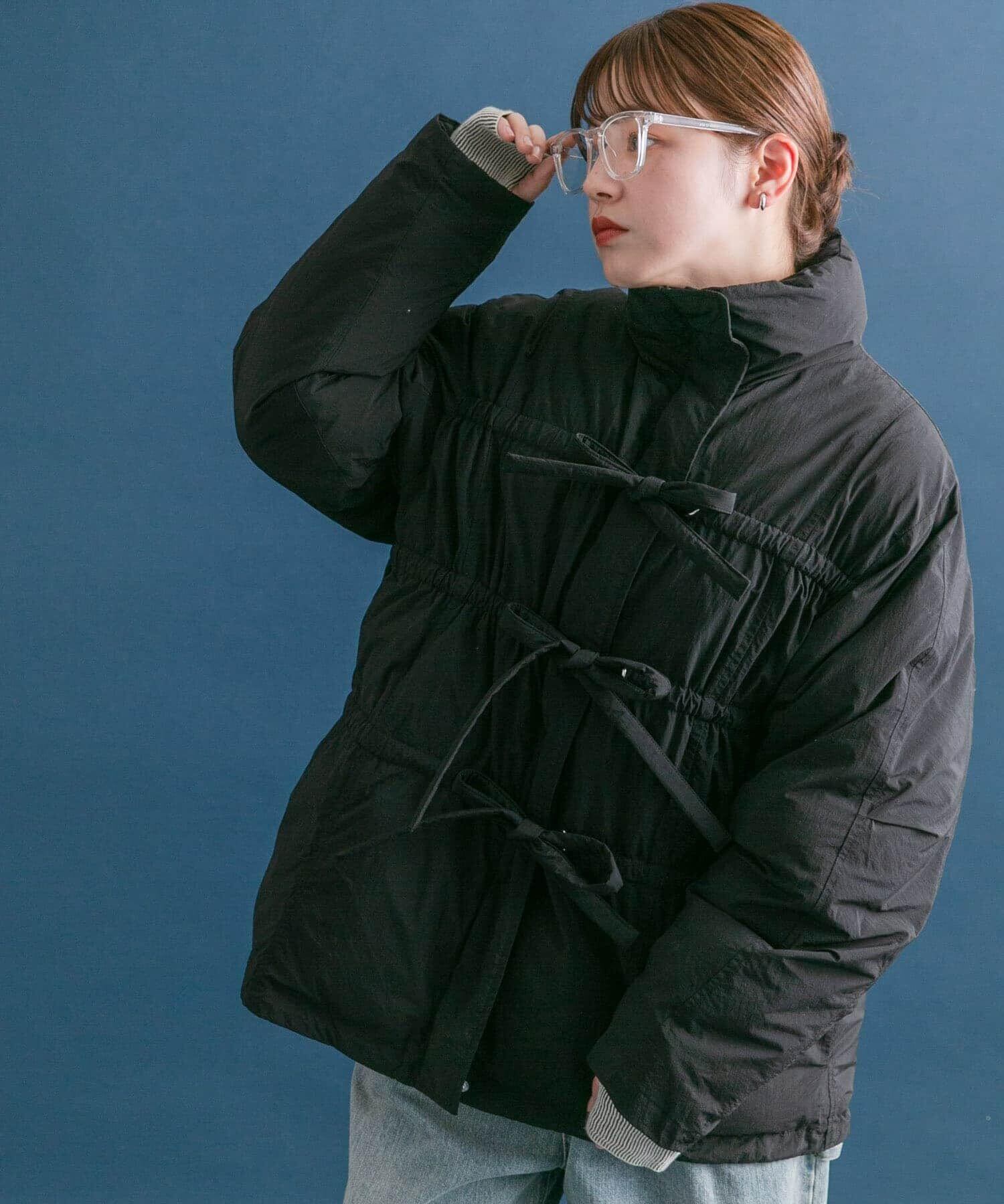 トレンドのリボンデザインをフロントに落とし込んだ中綿ジャケット。リボンは調整可能なのでお好きなシルエットに変更できます。ウエストシェイプできるデザインは着膨れせず、すっきりとした仕上がりにしてくれます。首元が暖かいスタンドカラー仕様も嬉しいポイント。カジュアルさと女性らしさを兼ね備えた1着です。