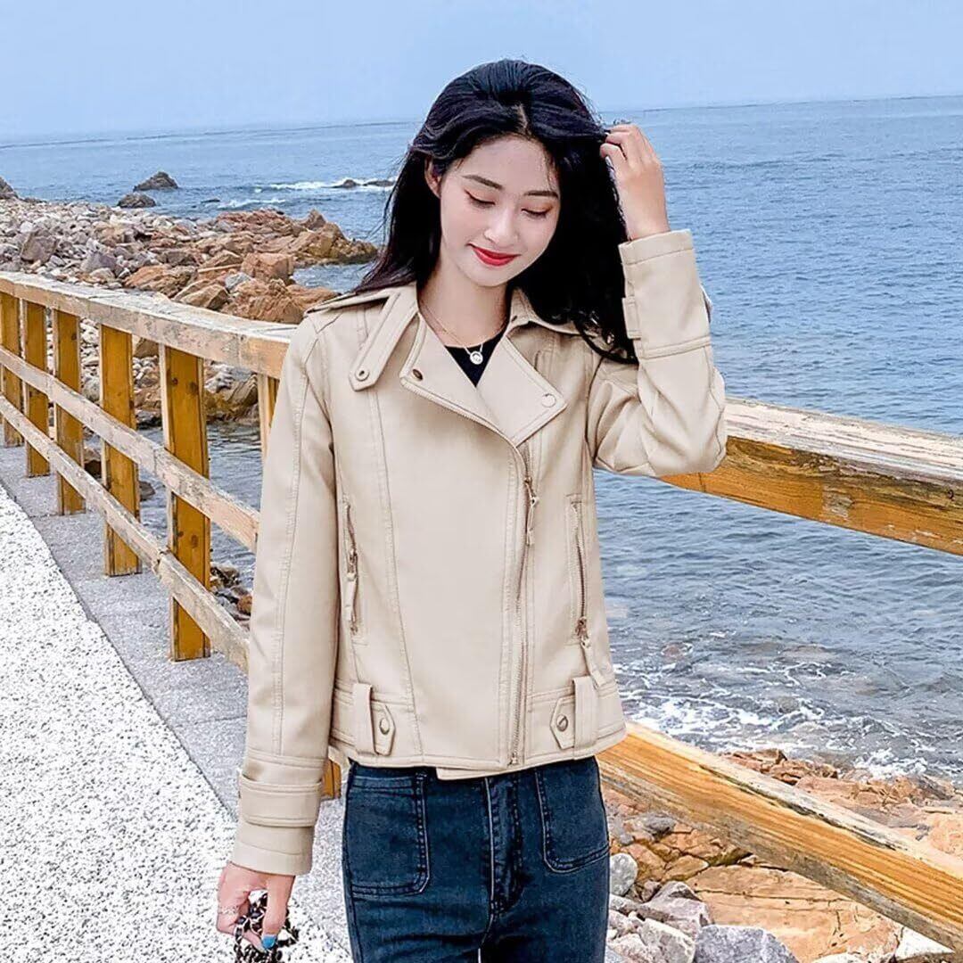 合皮でも上品な質感。柔らかなPUレザー生地で長時間使えて、手入れも簡単。革と違い雨の日に濡れても平気です。風も通さないのでロングシーズン、お天気が気になる日でも羽織っていける。環境にもやさしい、柔らかなンフトな質感のフェイクエコレザ一に洗い加工を施し、本革に近い風合い質感を再現。