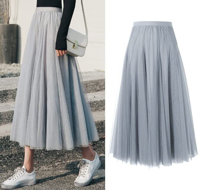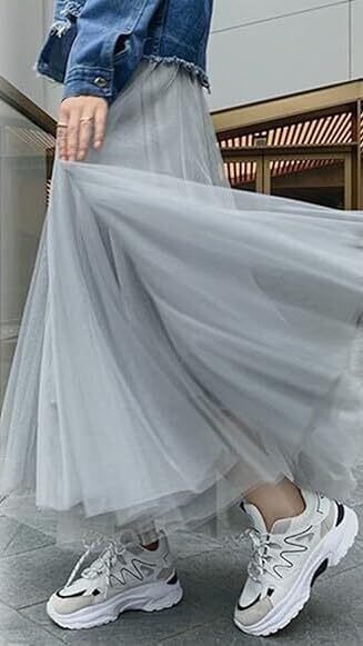 歩くたび美シルエットがふんわりと展開される。二重チュールの十分なプリーツが入っていて、おしゃれで可愛い雰囲気たっぷりしたロングスカートが登場しました。風になびくチュール素材の軽やかな風合いは落ち感と合わせて、魅力で女性らしさをそっと引き出してくれて嬉しいポイントです。しっかりとした柔らかい裏地が付いて安心に着用いただけて肌触りも快適になるスカートです。