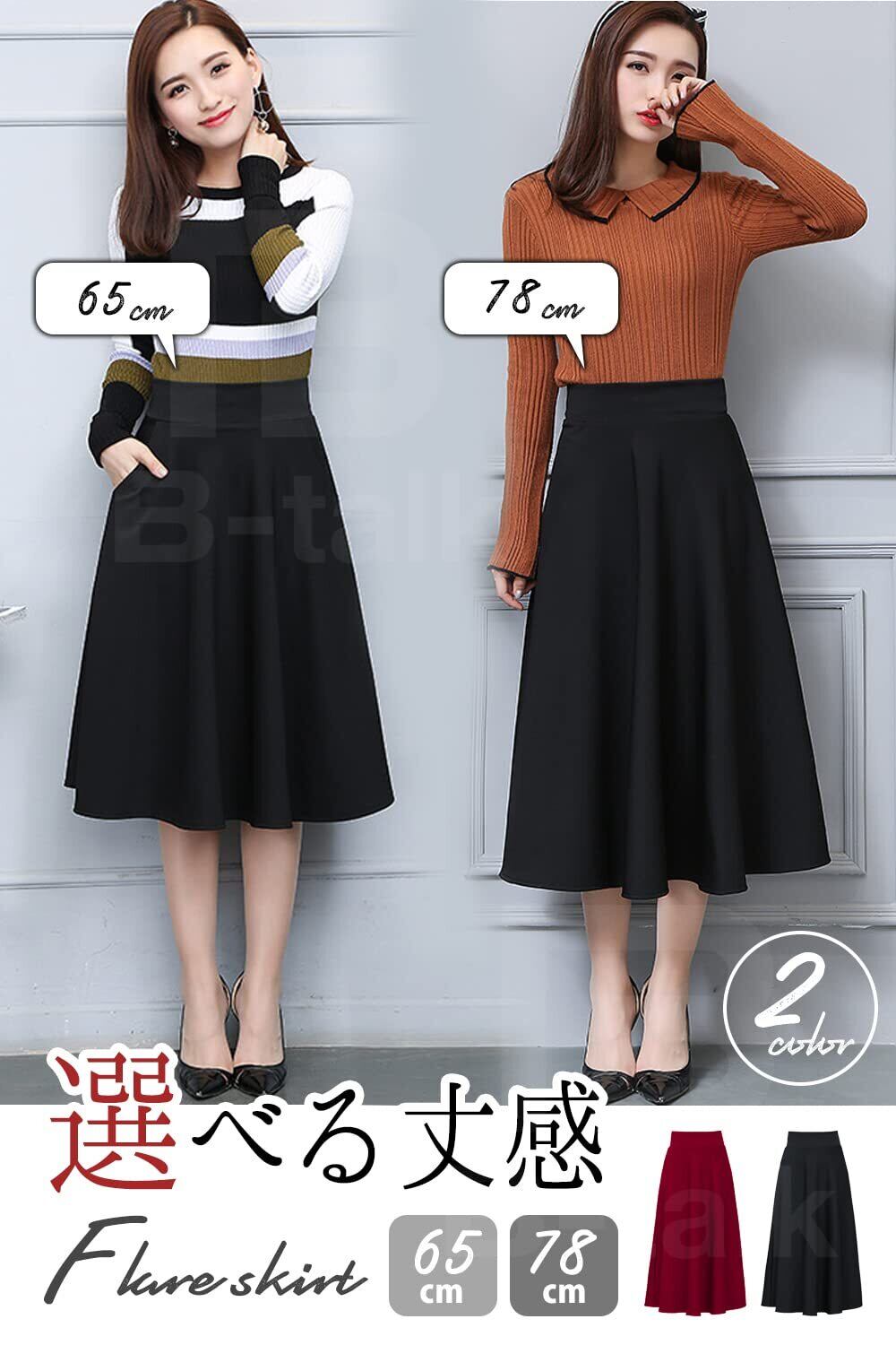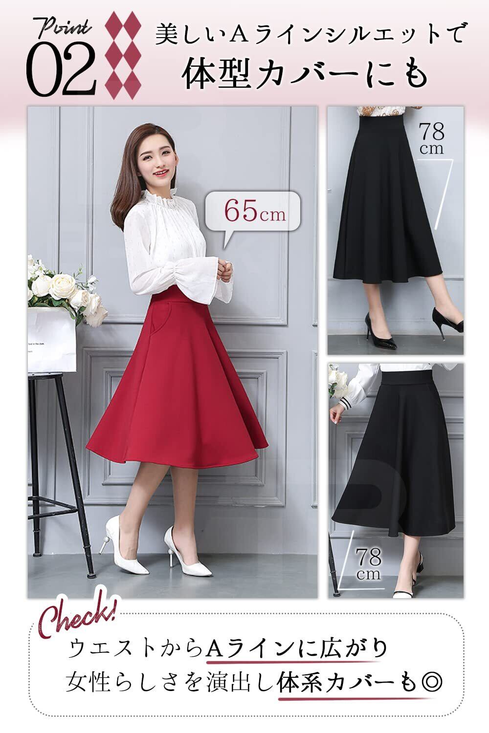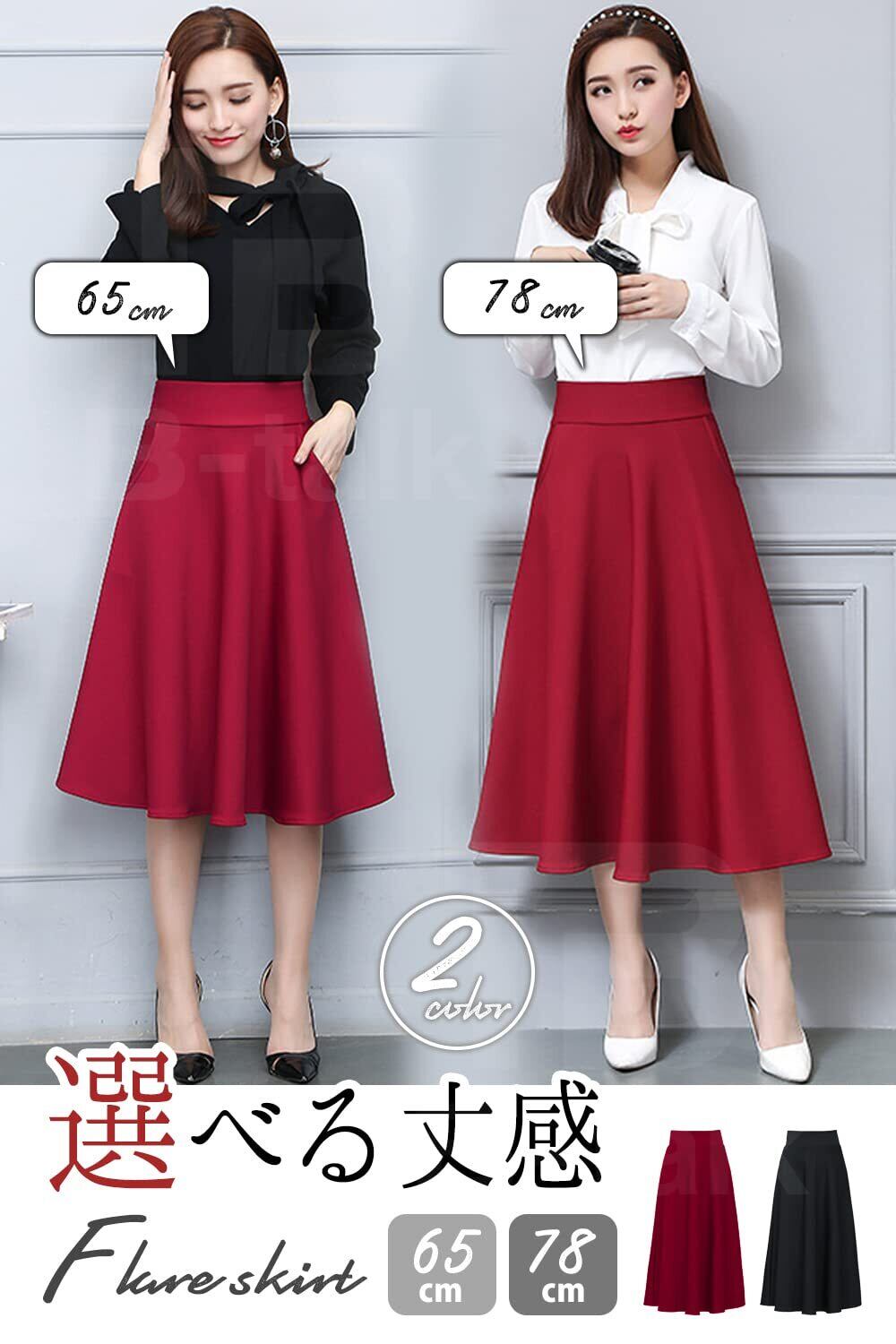 肌ざわりの良い、素材を使用したエレガントな雰囲気のあるフレアスカートです。選べる丈感!丈が65cm、78cmの2種類をご用意致しました。