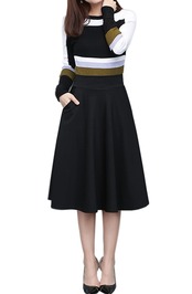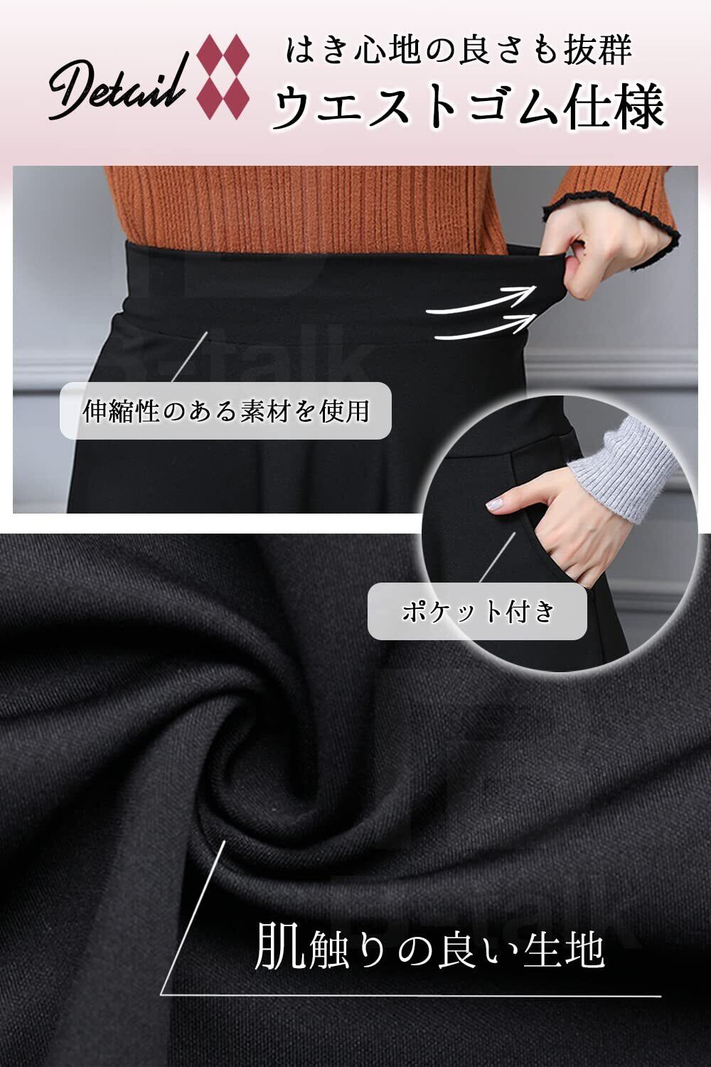 ウエストからAラインに広がるフレアなシルエットが、美しい女性らしさを演出し体系カバーにも一役買います程よい伸縮性のある素材を使用し、ウエストゴム仕様ではき心地の良さも抜群です。