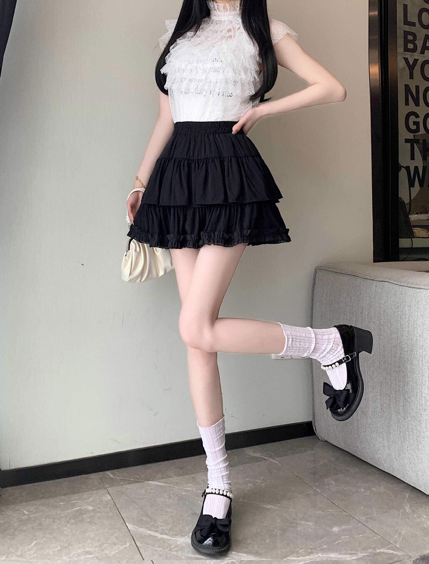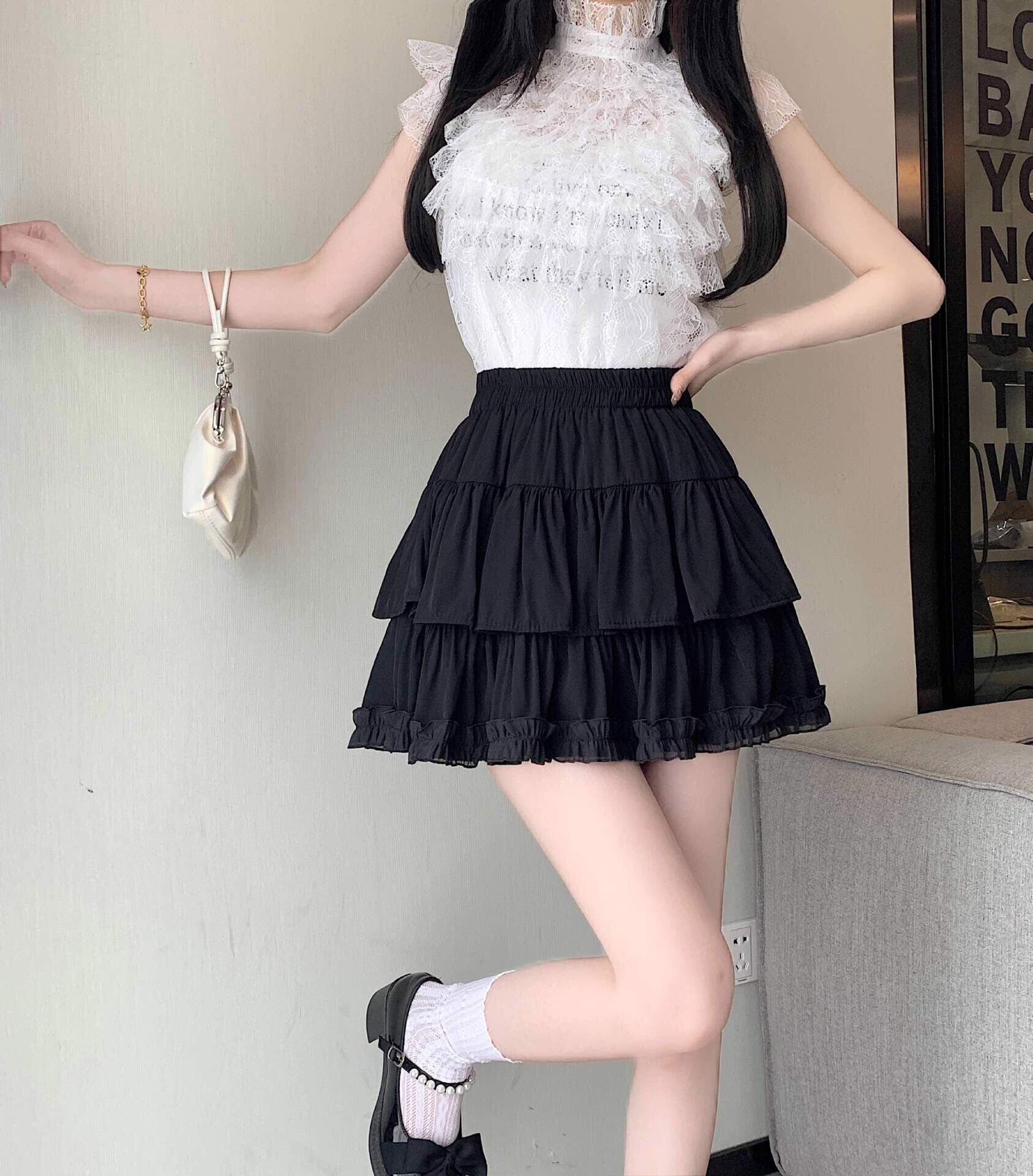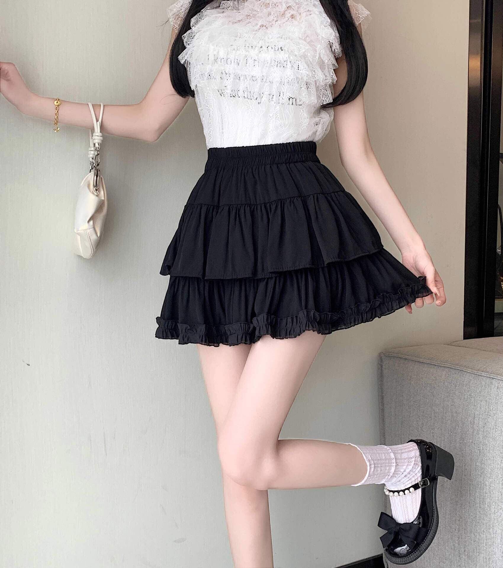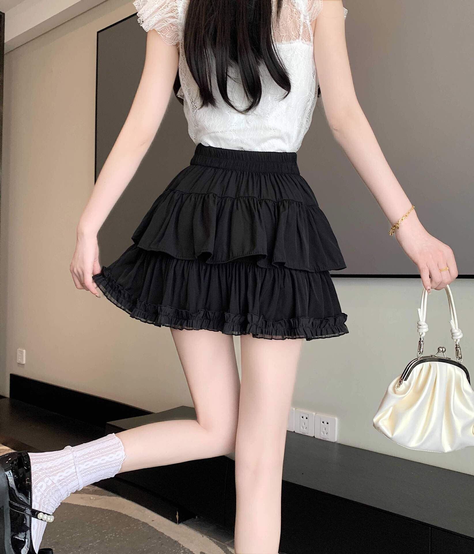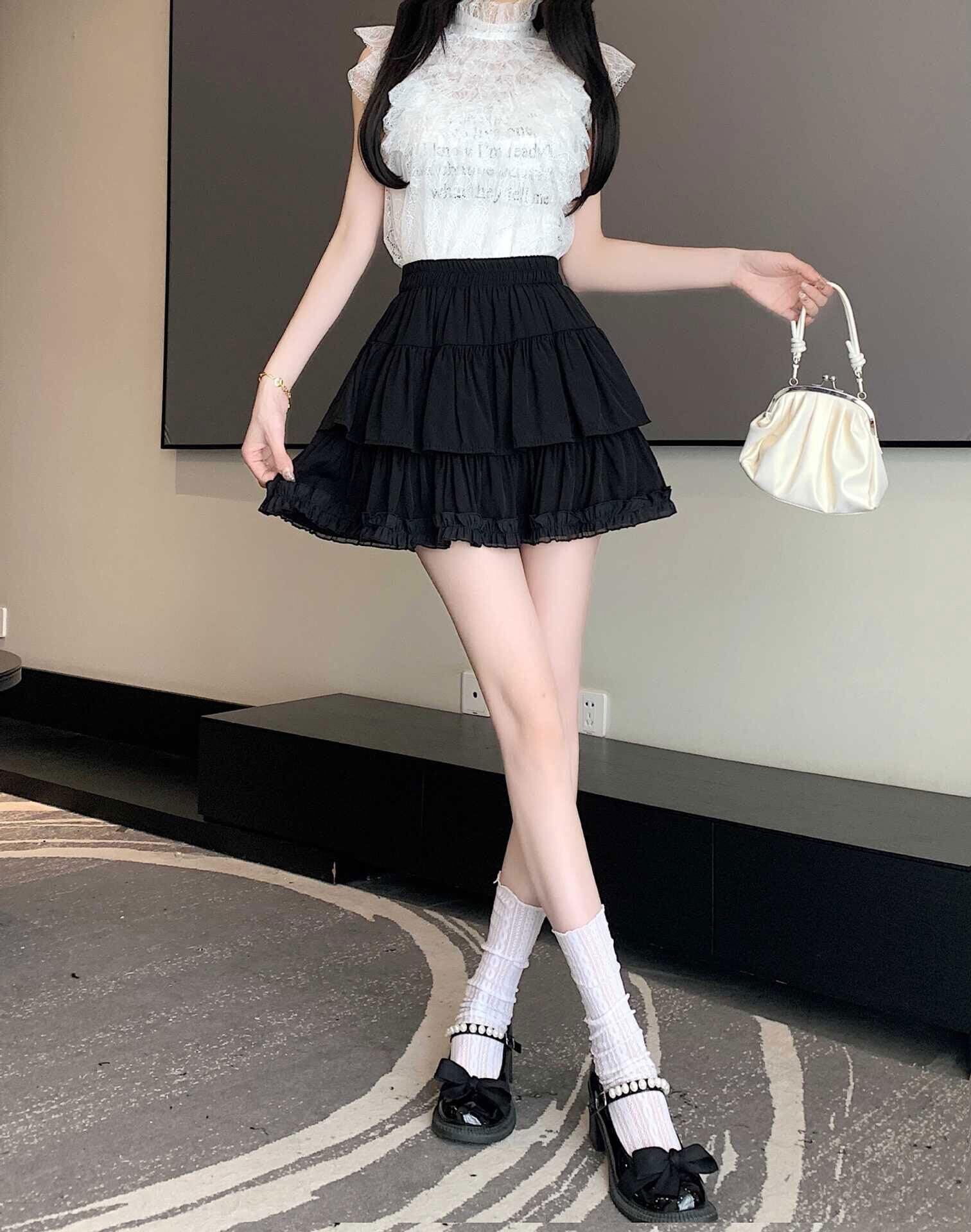 [eigenn] スカート ミニスカート フリル インナーパンツ付き レディース ティアード ふんわり ハイウェスト 可愛い 少女 aライン ミニ丈 黒 白 杏