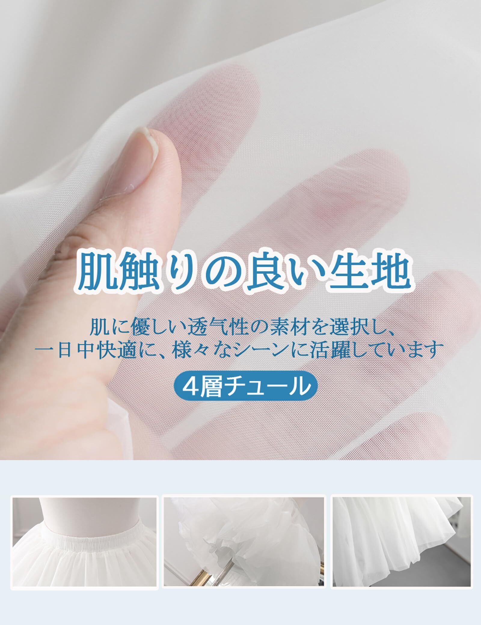 【肌触りが良いパニエ】裾のふわふわとしたフリルがポイント、ボリューム感たっぷりなパニエ。 メイン素材は柔らかい生地を採用しているため、チュール部分はチクチクしないので、着心地が快適、パニエを1日着用しても、肌が痒くない。