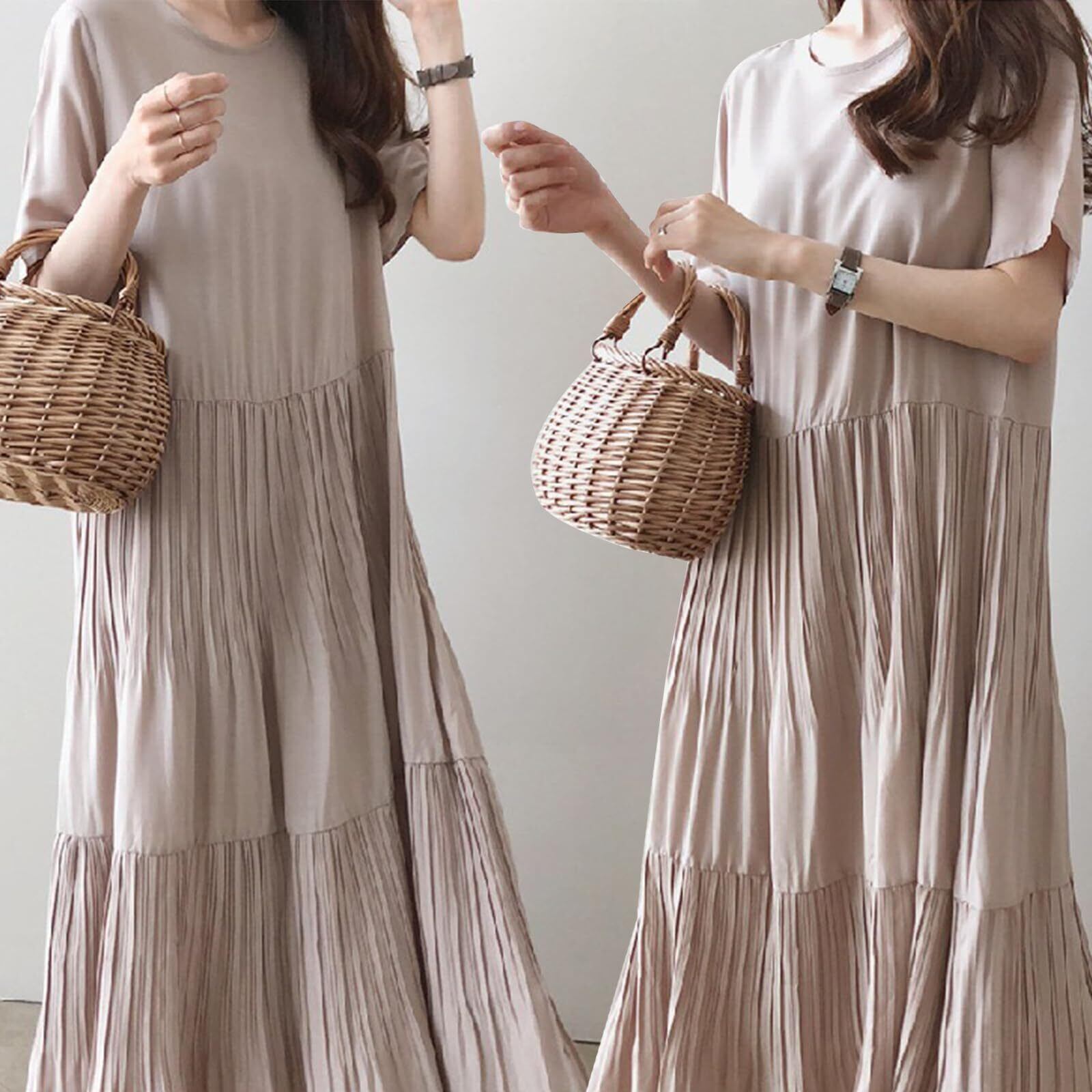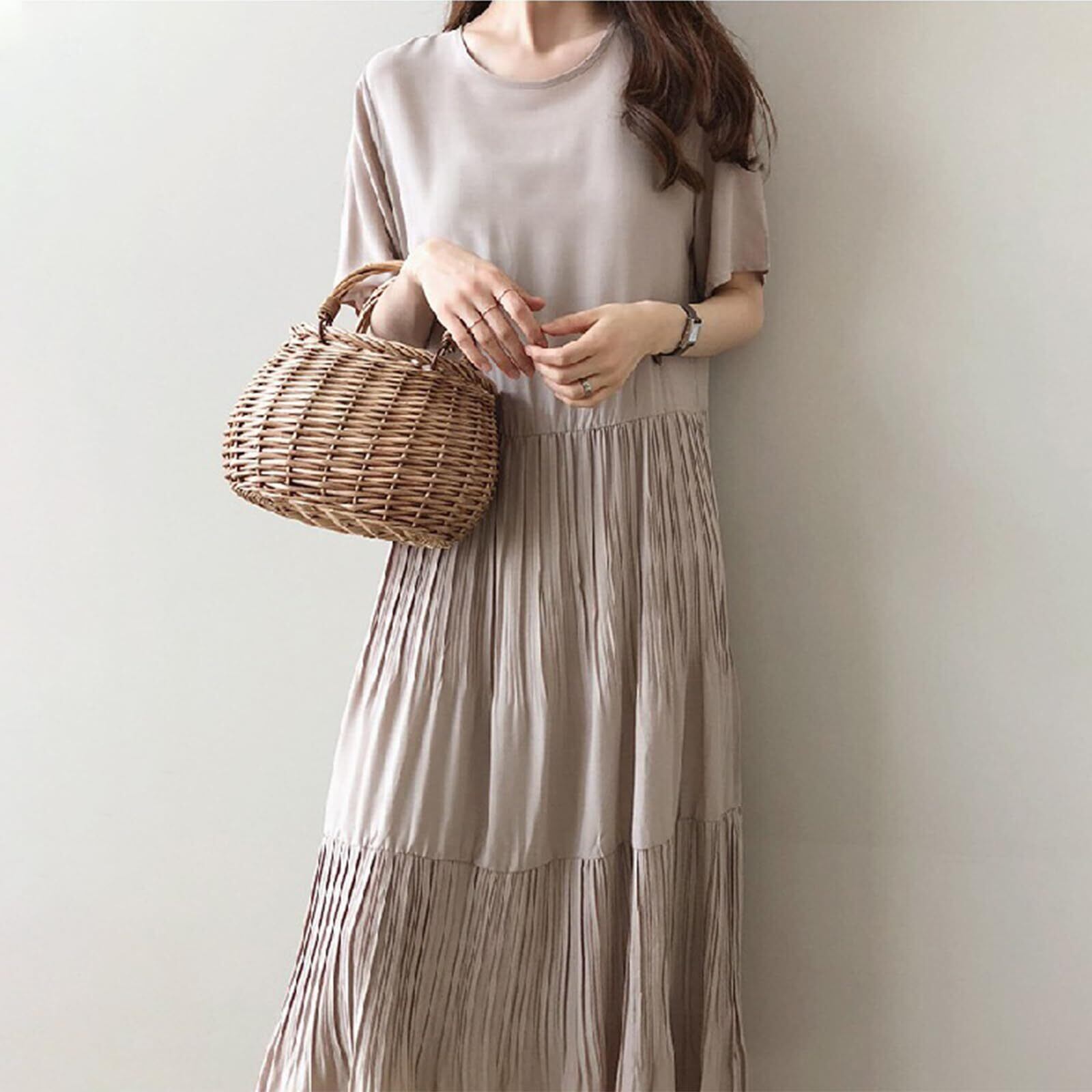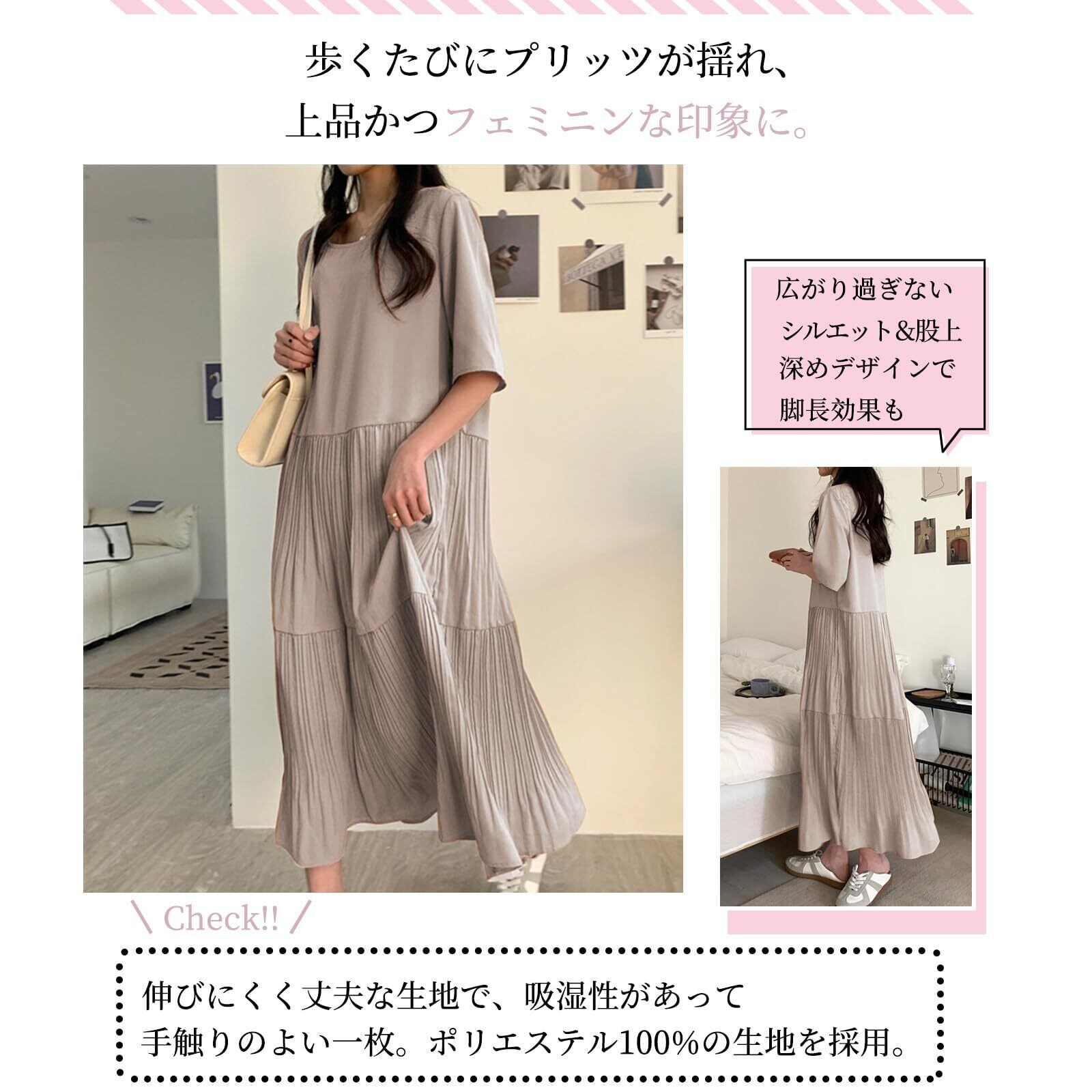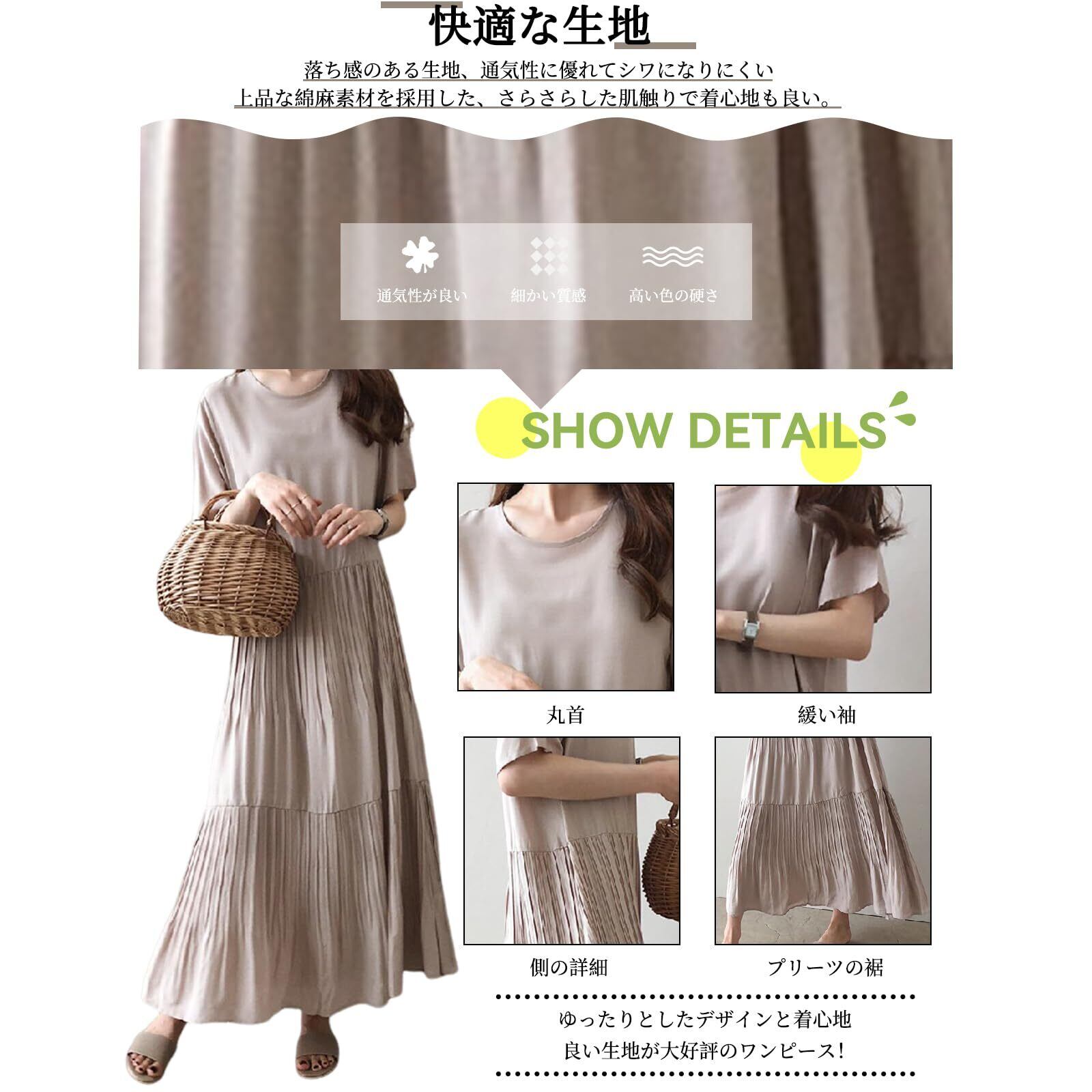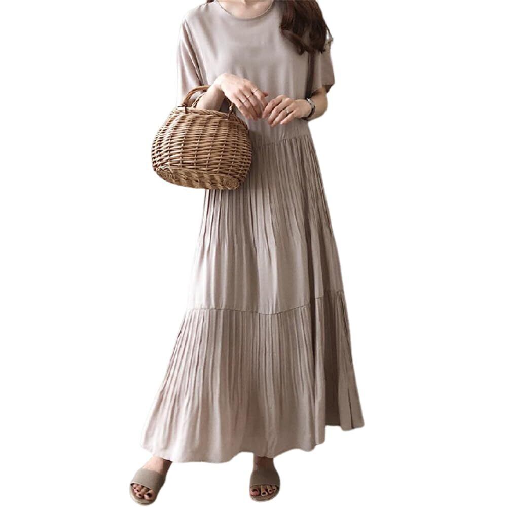[FEISEDY] ワンピース レディース 大きいサイズ ゆったり 知的 丸首半袖 無地 着瘦せ ロング ワンピース おしゃれ カジュアル エレガント シフォン ドレス 夏 A8107