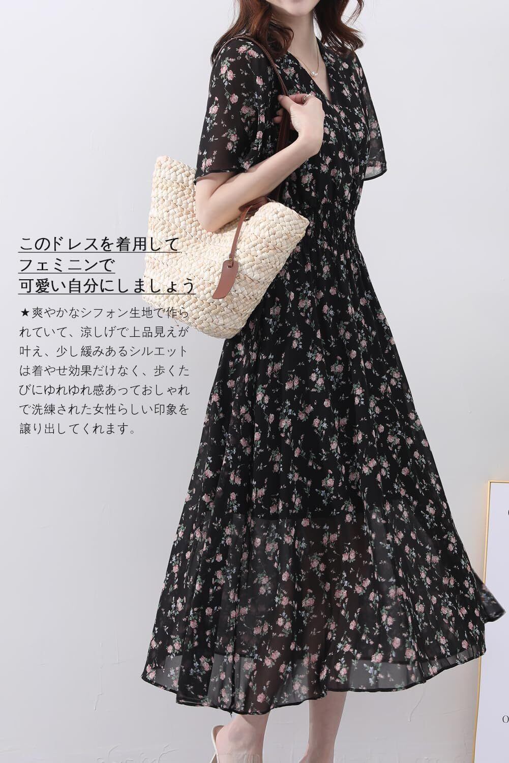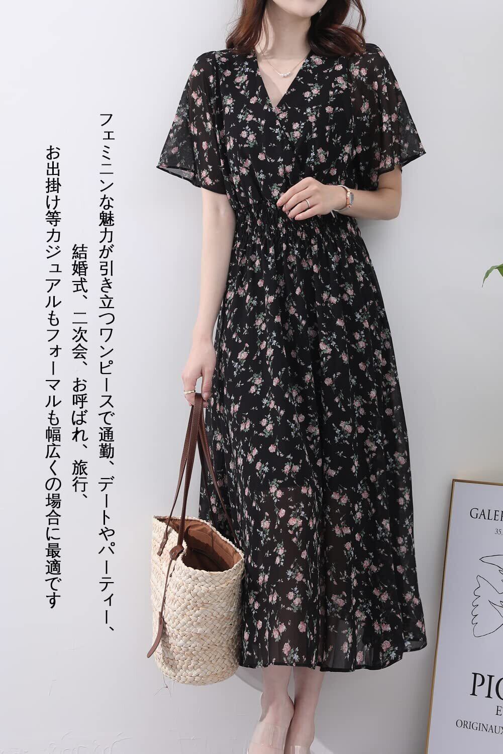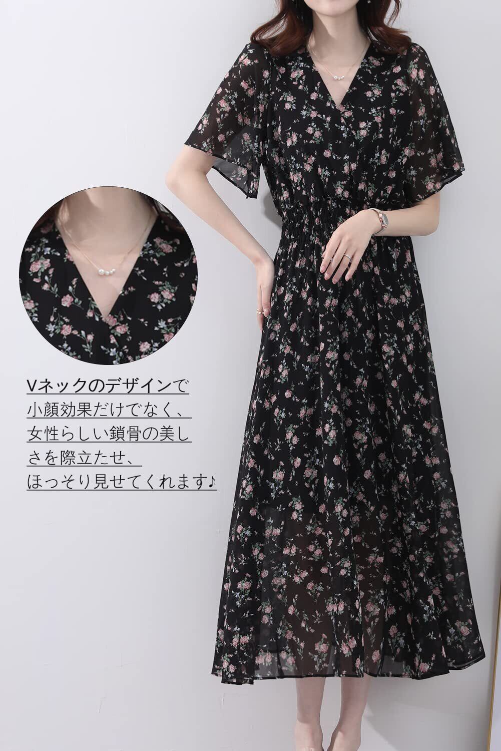 本商品のブラックカラーは花柄の異なる2バリエーションがございます。ご注文前に必ず商品詳細画像にてご確認くださいますようお願いいたします。全体に散りばめられた花柄とシックなカラーの組み合わせ、可愛い雰囲気に溢れていて、1枚で主役級の半袖のワンピースが新登場しました。胸元と背中はVネックのデザインで小顔効果だけでなく、女性らしい鎖骨の美しさを際立たせ、ほっそり見せてくれます。華やかなやや透け感のあるフレア袖で気になる二の腕をカバーでき、絶妙な女性らしさを表現したレディースのロングワンピースです。ご注意:バックバンドを自由に調整することで胸元と背中の開き方を変えられますので、お気になる方はご了承ください。