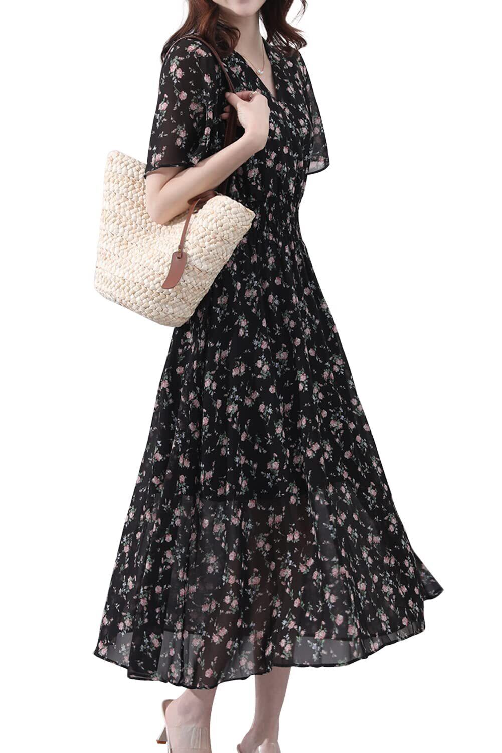 【2022最新】[Yino] 花柄 ロング ワンピース 半袖 レディース シフォン マキシワンピース Vネック フレア袖 裏地付き ウエストゴム 着痩せ おしゃれ 可愛い お呼ばれ お出かけ 通勤 普段着 夏 | 無意味ステッカー
