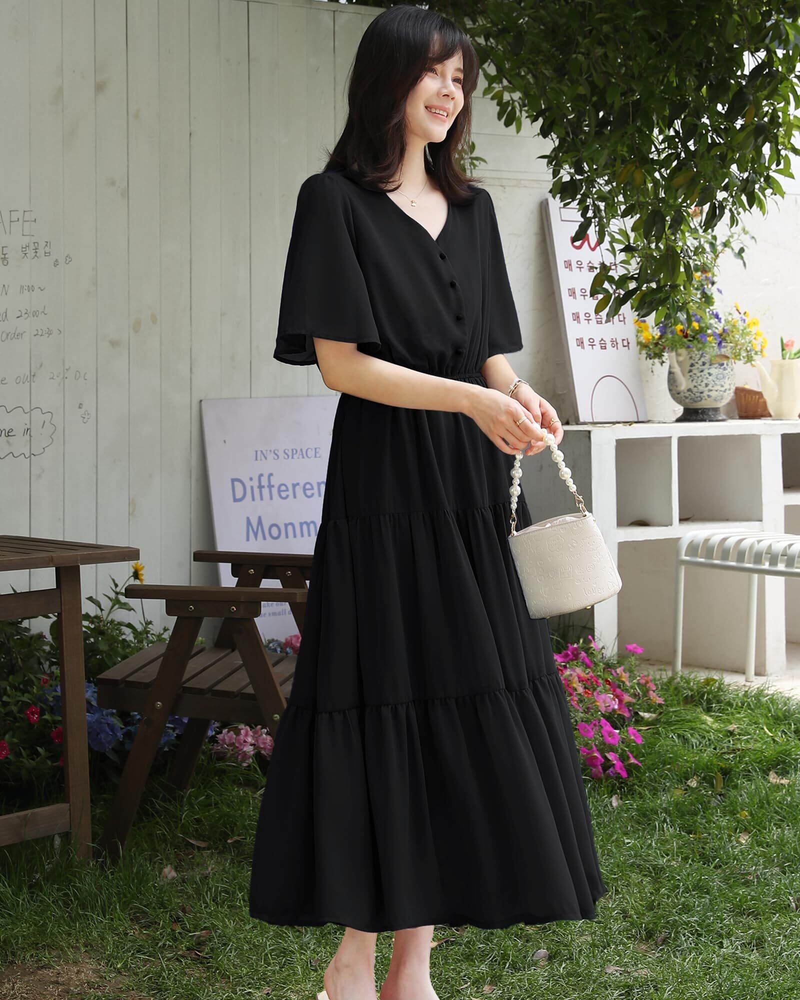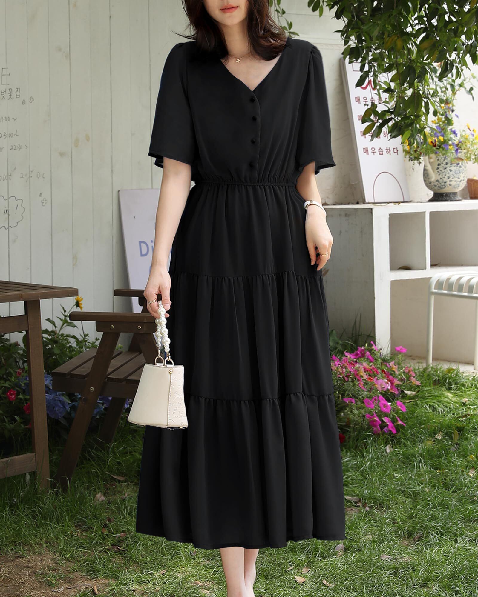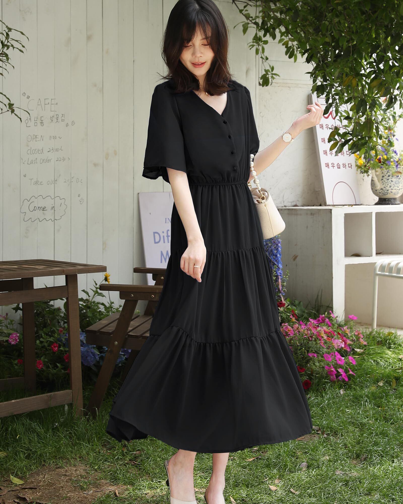 ふんわりしたおしゃれなスタイリングを楽しませるレディースロングワンピースがこの季節に新登場しました。胸元のボタンが目を惹く、レトロ感があってシャツワンピースに見えるのもユニークなポイントです。可愛くておしゃれなフレアスリープで、お気になる腕をしっかりとカバーしてくれます。下半分は3段落ち感があるティアードで組み合わせており、動くたびにふんわりと揺れ女性らしさを引き立たせるレディース半袖ワンピースです。