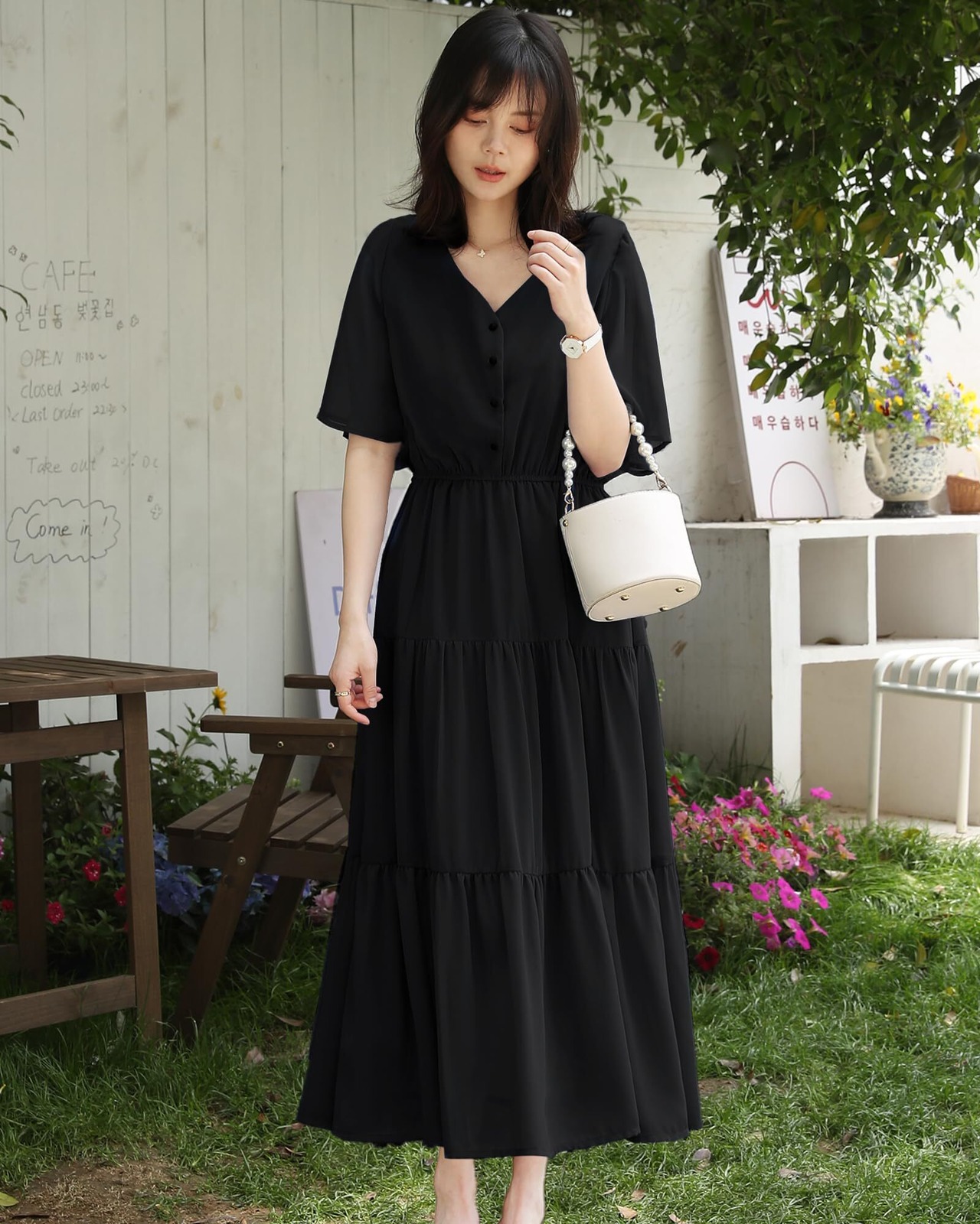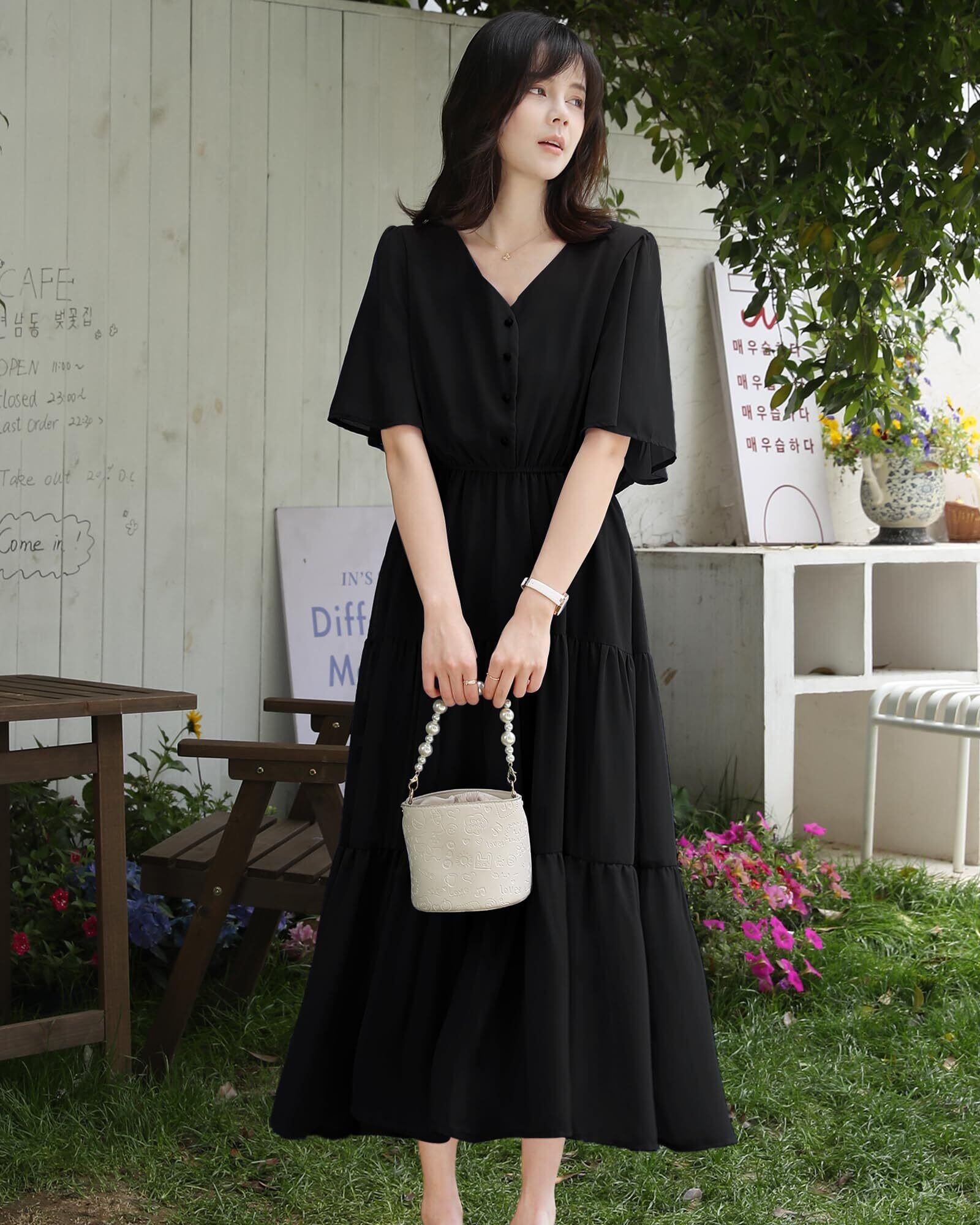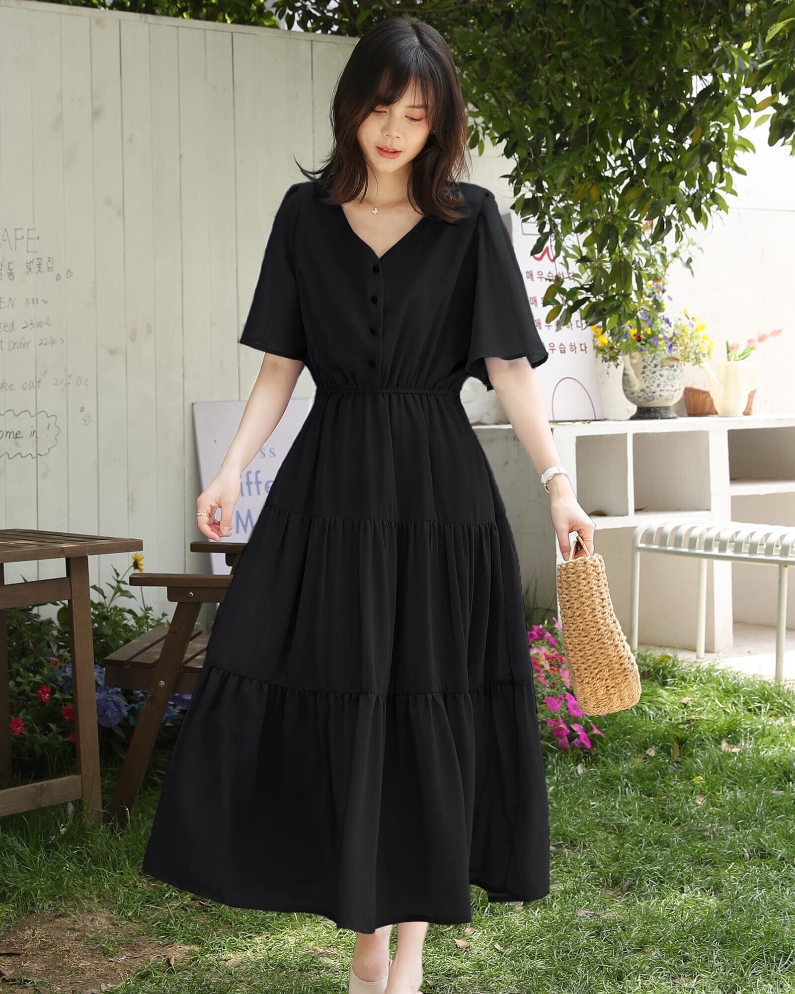 ふんわりしたおしゃれなスタイリングを楽しませるレディースロングワンピースがこの季節に新登場しました。胸元のボタンが目を惹く、レトロ感があってシャツワンピースに見えるのもユニークなポイントです。可愛くておしゃれなフレアスリープで、お気になる腕をしっかりとカバーしてくれます。下半分は3段落ち感があるティアードで組み合わせており、動くたびにふんわりと揺れ女性らしさを引き立たせるレディース半袖ワンピースです。