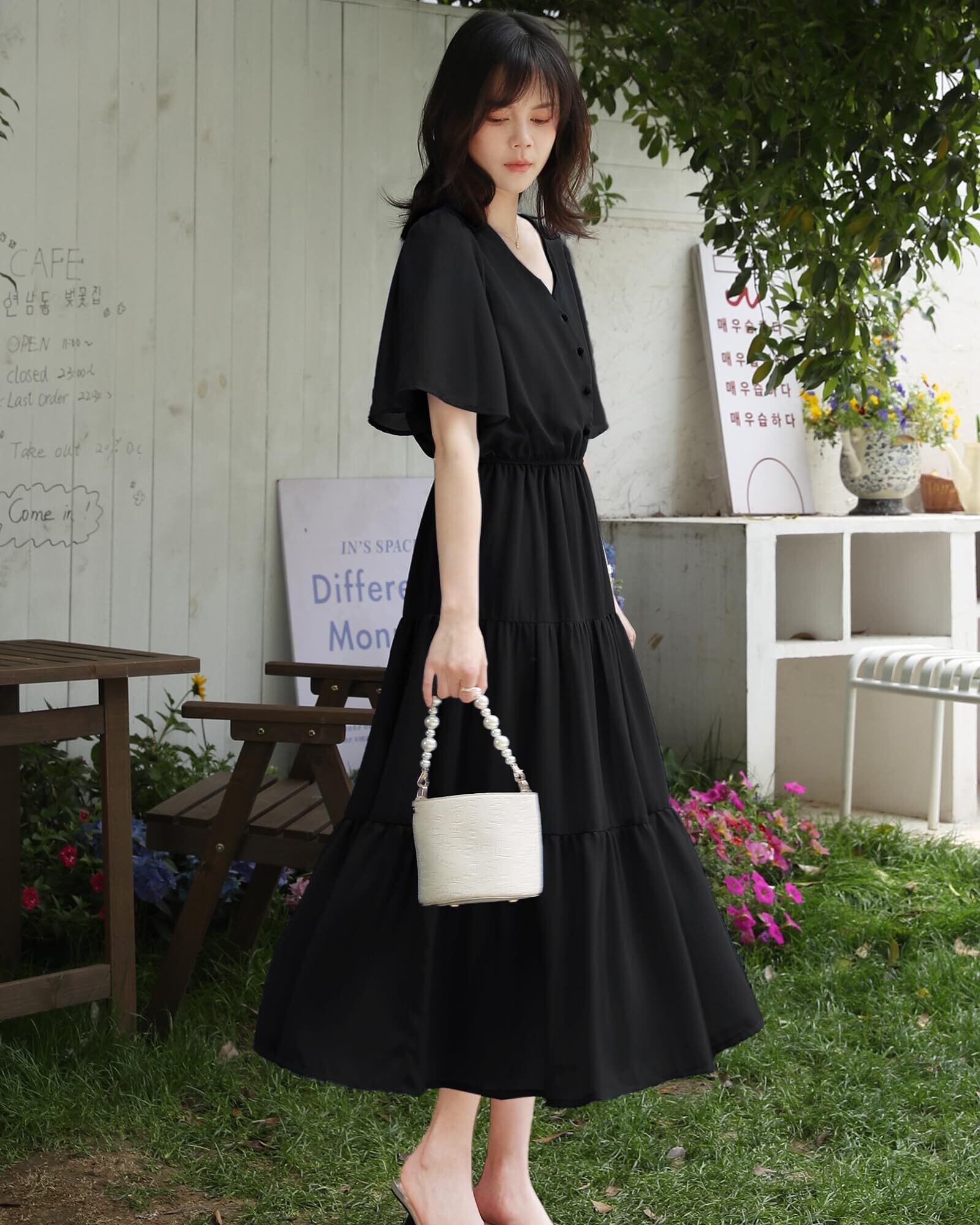 イノ ワンピース レディース ロングワンピース 半袖 フレアスリープ Ⅴネック ハイウエスト 裏地 落ち感 体型カバー 着瘦せ おしゃれ 女性らしい 可愛い 普段着 旅行 カジュアル 夏