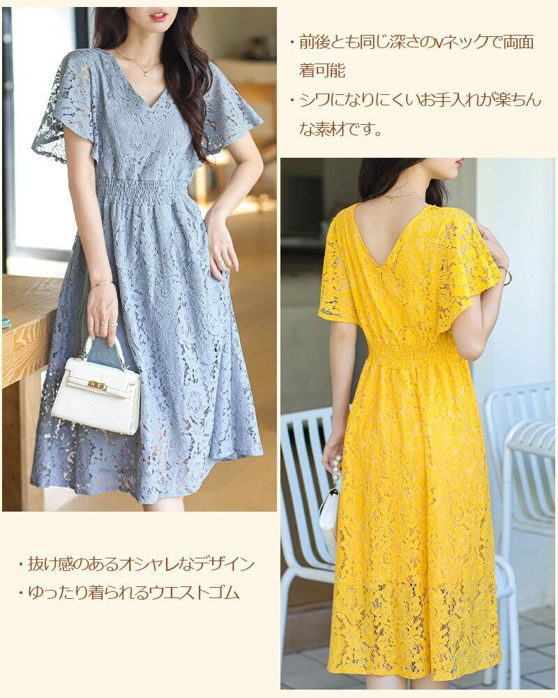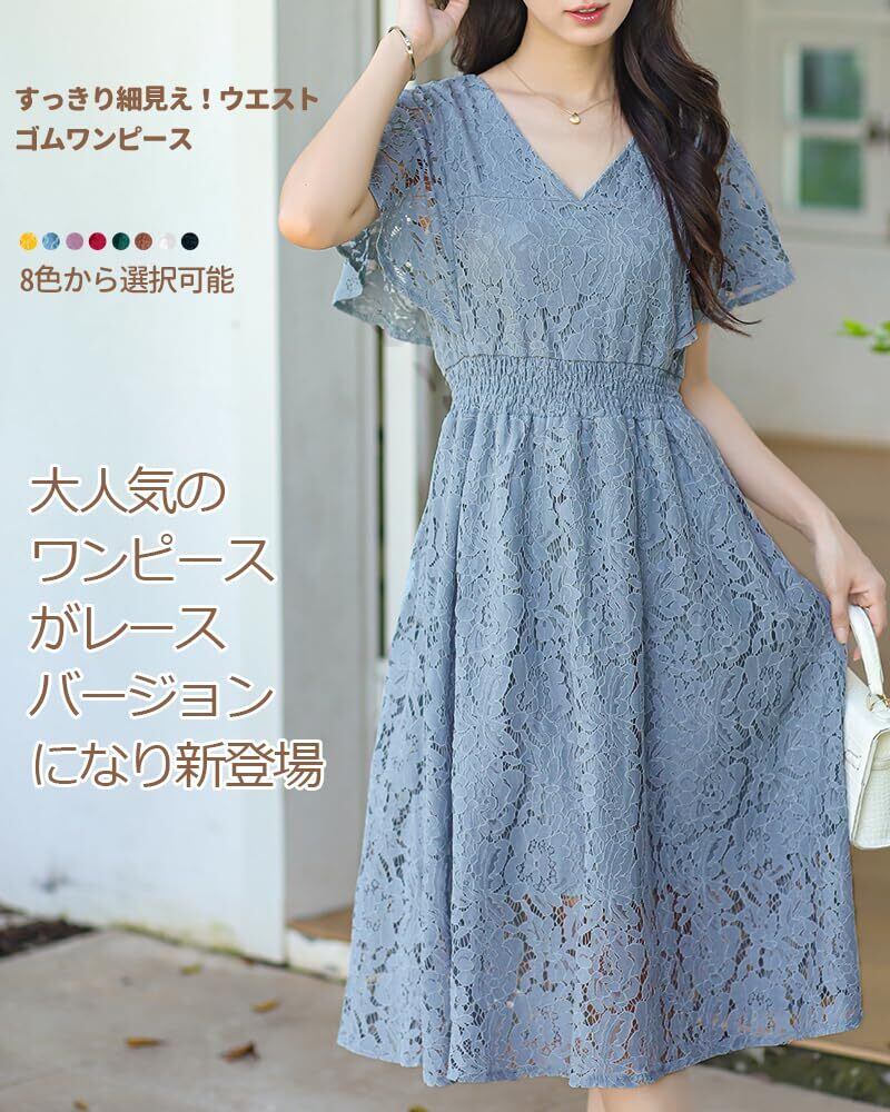 【2022最新】[Collecala] ワンピース 夏チュニックレースワンピー 可愛い 夏 レディース レトロ夏服 ハイウエスト着痩せ ワンピース サマーレースドレス Vネック花柄ウエストゴム 腰が括れたデザインおしゃれ服 | 無意味ステッカー
