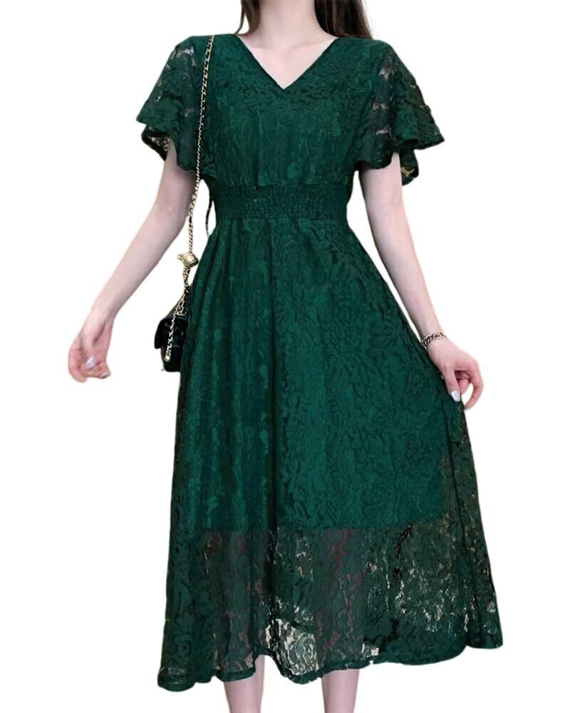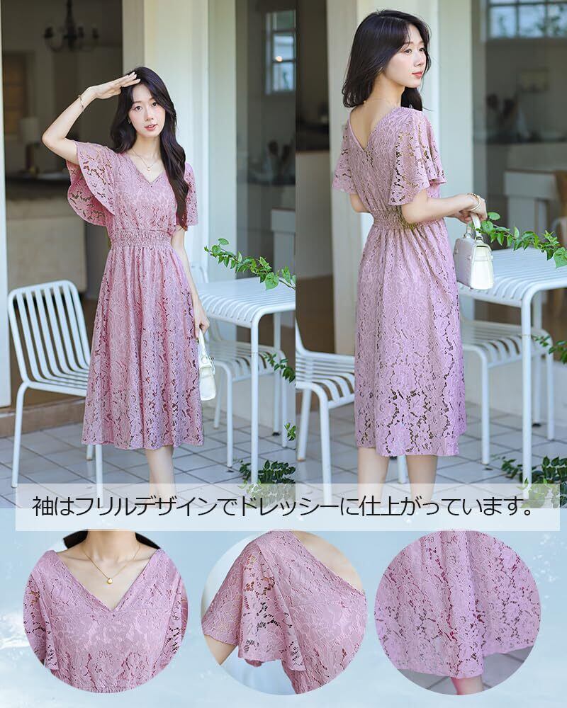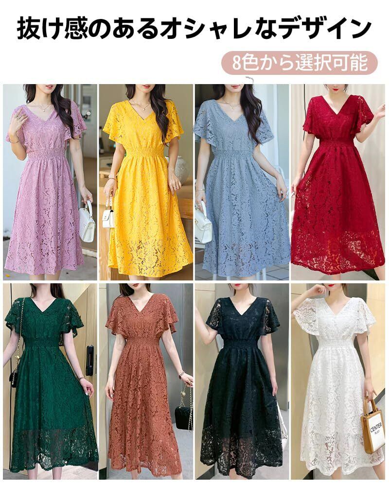 [Collecala] ワンピース 夏チュニックレースワンピー 可愛い 夏 レディース レトロ夏服 ハイウエスト着痩せ ワンピース サマーレースドレス Vネック花柄ウエストゴム 腰が括れたデザインおしゃれ服