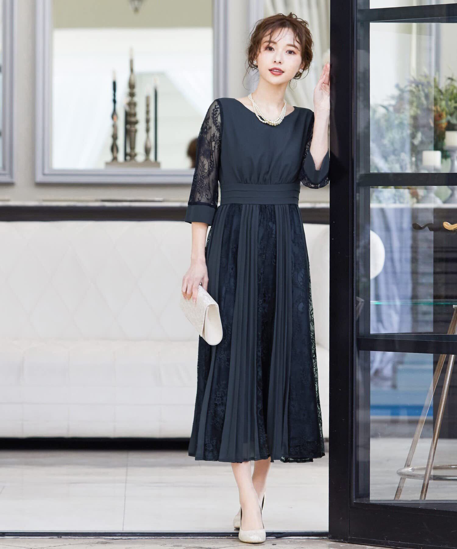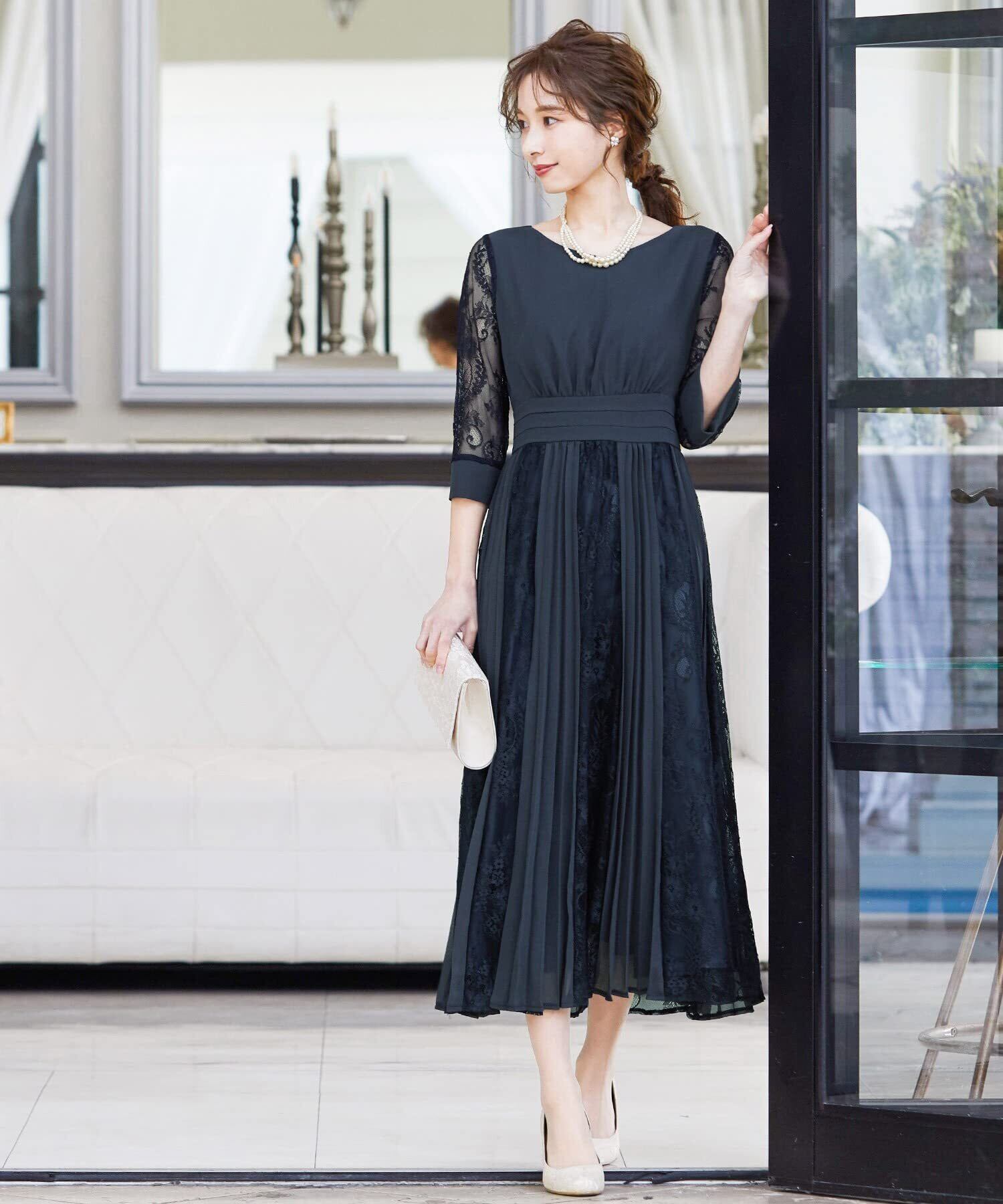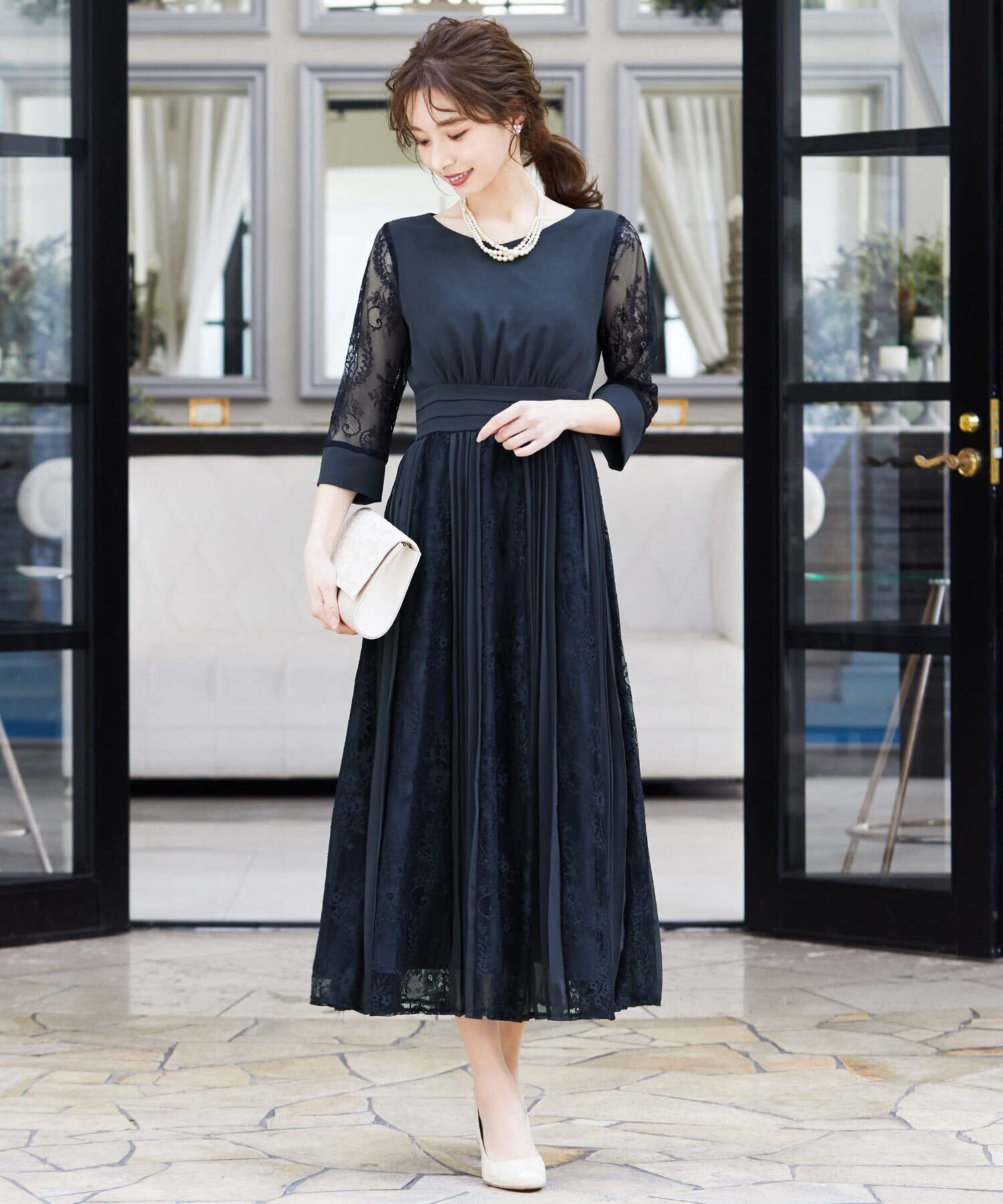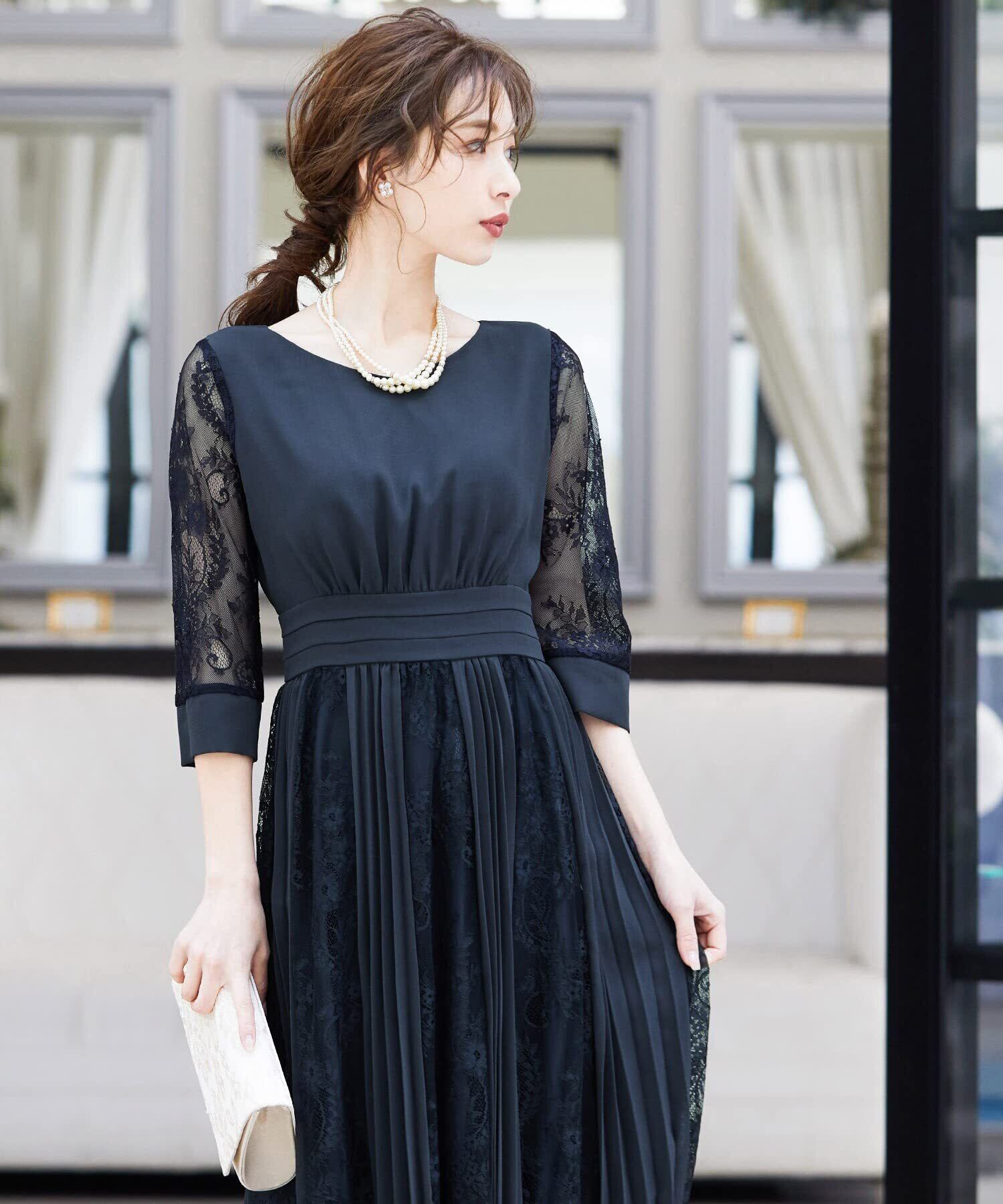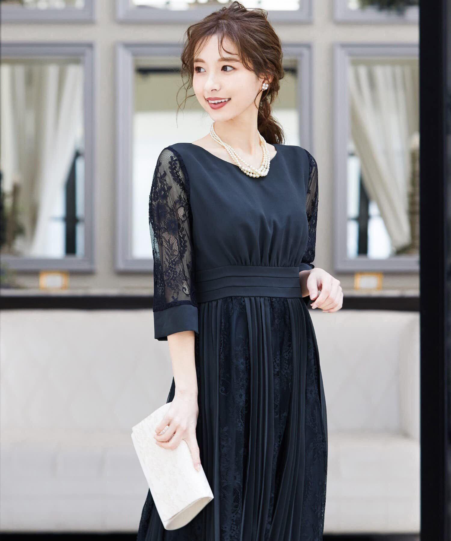 程よい透け感のレーススリーブが二の腕をさりげなくカバー。