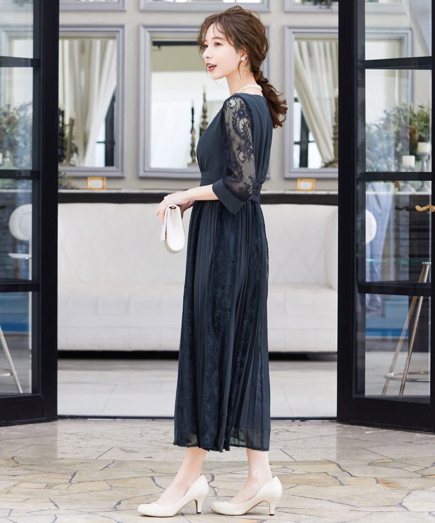 レースとプリーツをミックスさせたロングスカートが動くたびに揺れ、エレガントな余韻を残す。