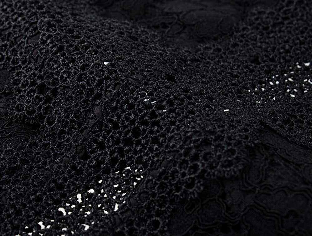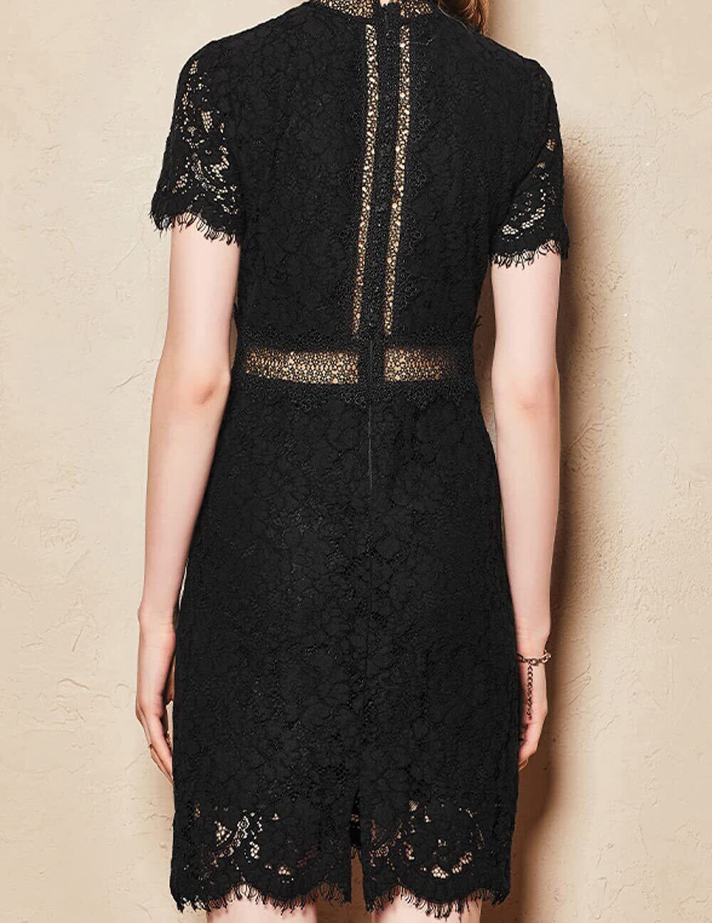 首元とウエストにブラックの透かしレースがライン状に嵌め込まれた凝った作りで、全体を引き締めつつ優美なセクシーさと抜け感を演出しますタイトなシルエット、高めのウエスト切り替えや大きすぎない柄など、小柄さんがスタイル良く見えるよう計算し尽くしたレースワンピースです。