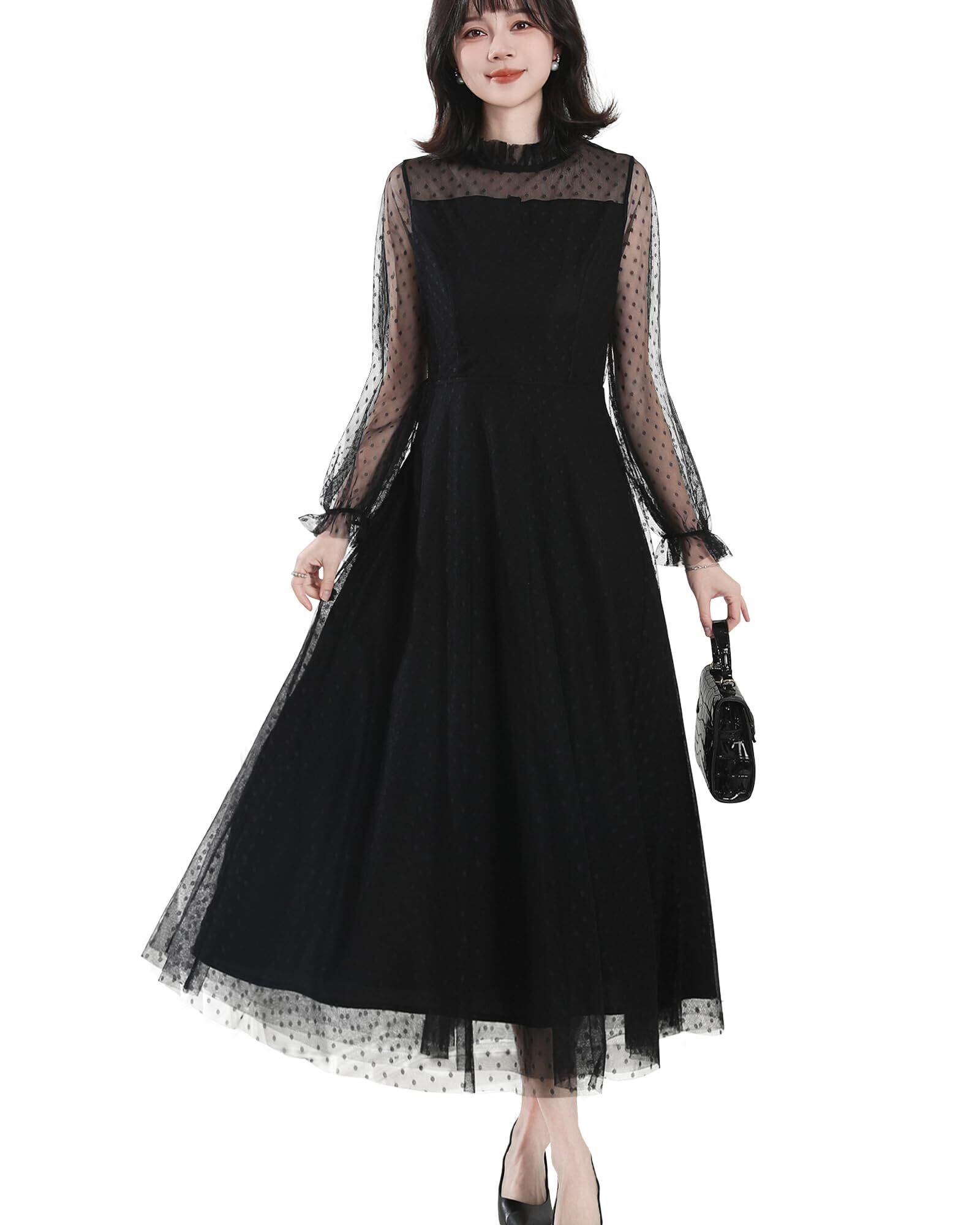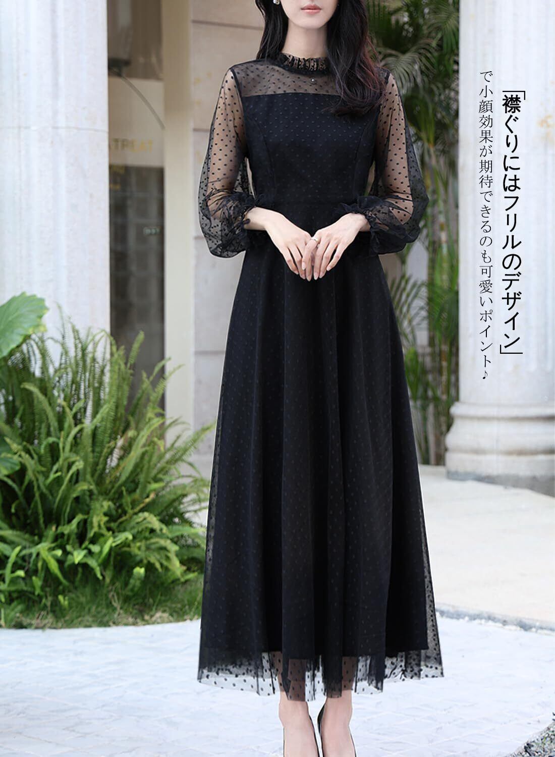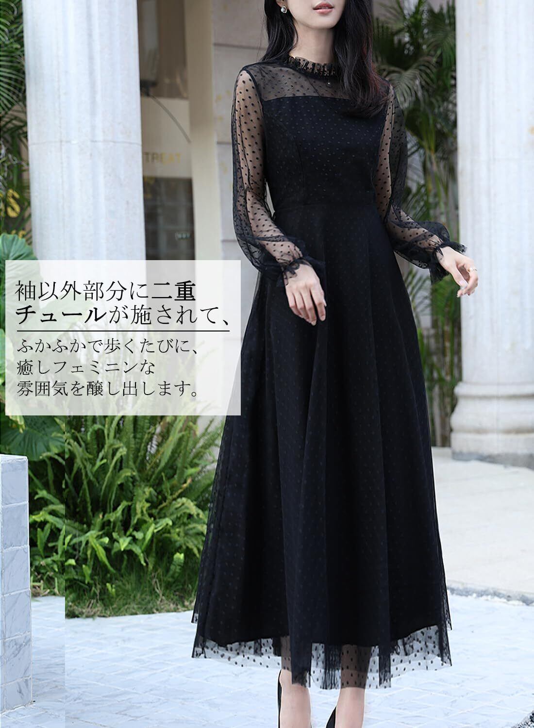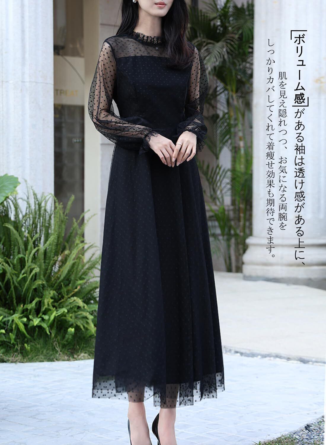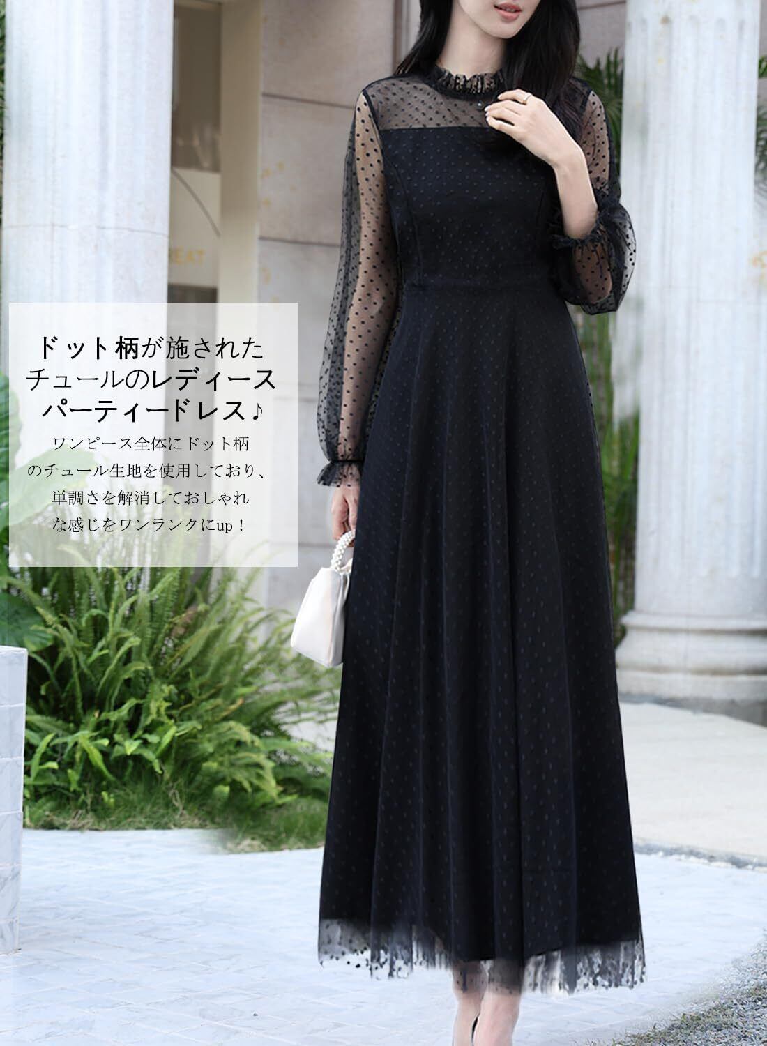 [Yino] パーティードレス チュール レディース ワンピース ドット 長袖 フリル 裏地付き 着痩せ ロング丈 女性らしい 可愛い フォーマル 結婚式 二次会 披露宴 同窓会 お呼ばれ
