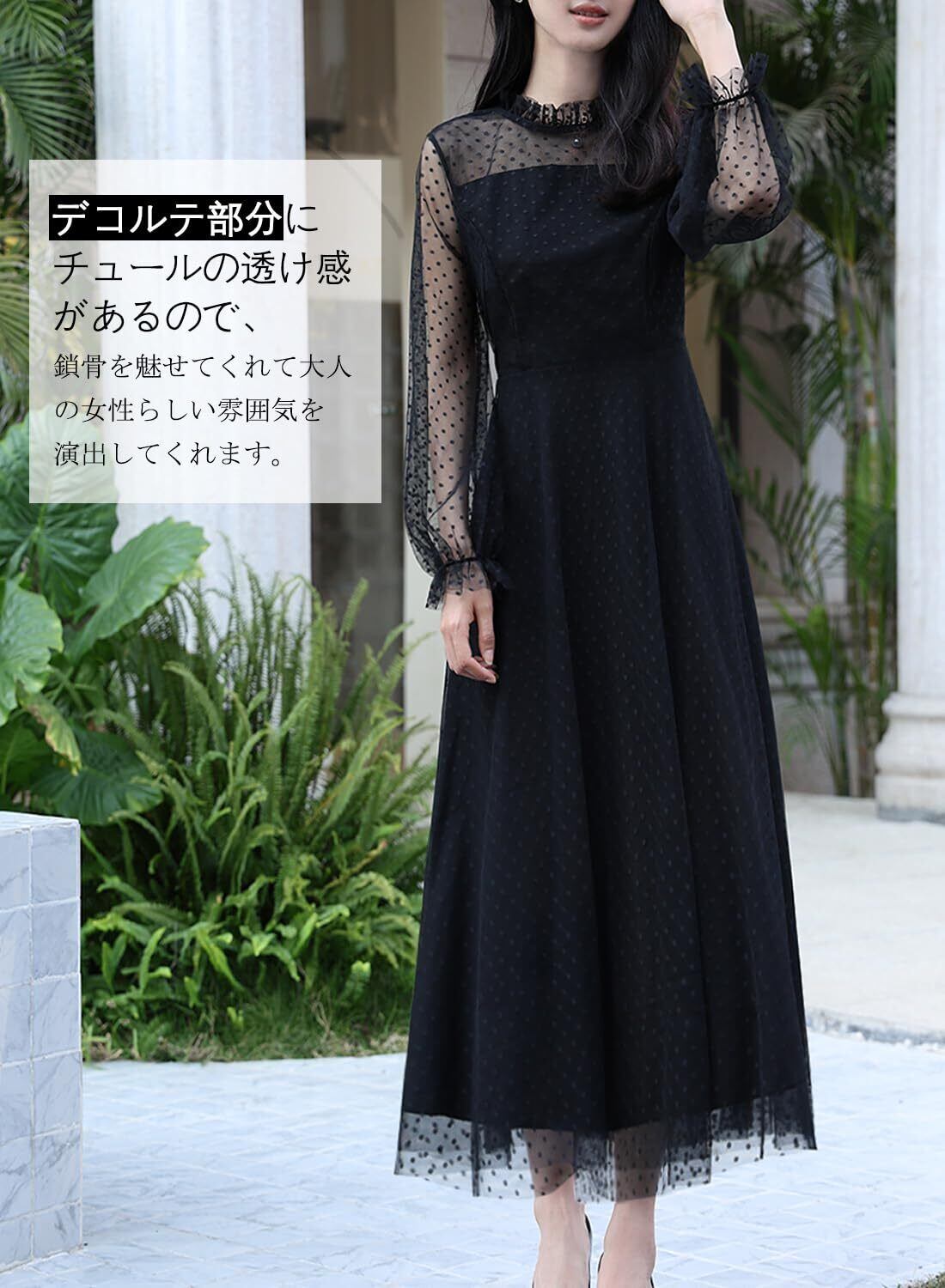 ドット柄が施されたチュールのレディースパーティードレス。ワンピース全体にドット柄のチュール生地を使用しており、単調さを解消しておしゃれな感じをワンランクにup!襟ぐりにはフリルのデザインで小顔効果が期待できるのも可愛いポイント。デコルテ部分にチュールの透け感があるので、鎖骨を魅せてくれて大人の女性らしい雰囲気を演出してくれます。ボリューム感がある袖は透け感がある上に、肌を見え隠れつつ、お気になる両腕をしっかりカバしてくれて着痩せ効果も期待できます。