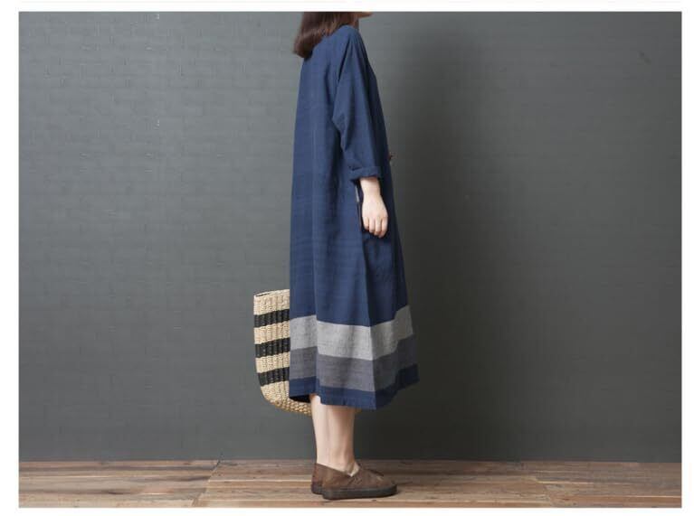 [JINJUDUO] ワンピース レディース 綿麻 長袖 ロングスリーブ Aライン ルーズフィット ミディ丈 カラーブロック ゆったり リラックス デザインM~2XL 着痩せ おしゃれ カジュアル オフィス 春 夏 秋