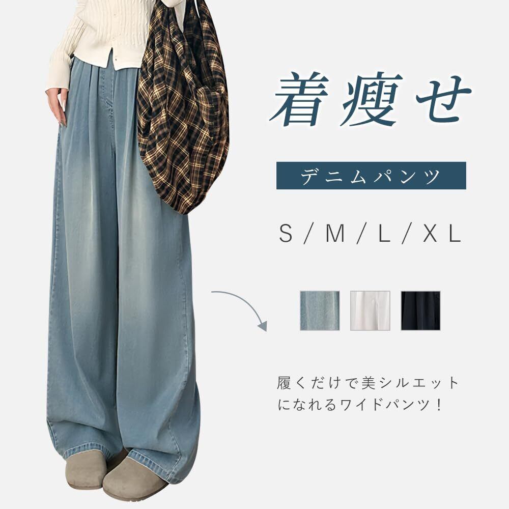 【着瘦せデニムパンツ】ハイウェストでゆったりしたデニムワイドパンツ。体のラインを隠れて、履くだけでスラッと美脚こうかを達成する。