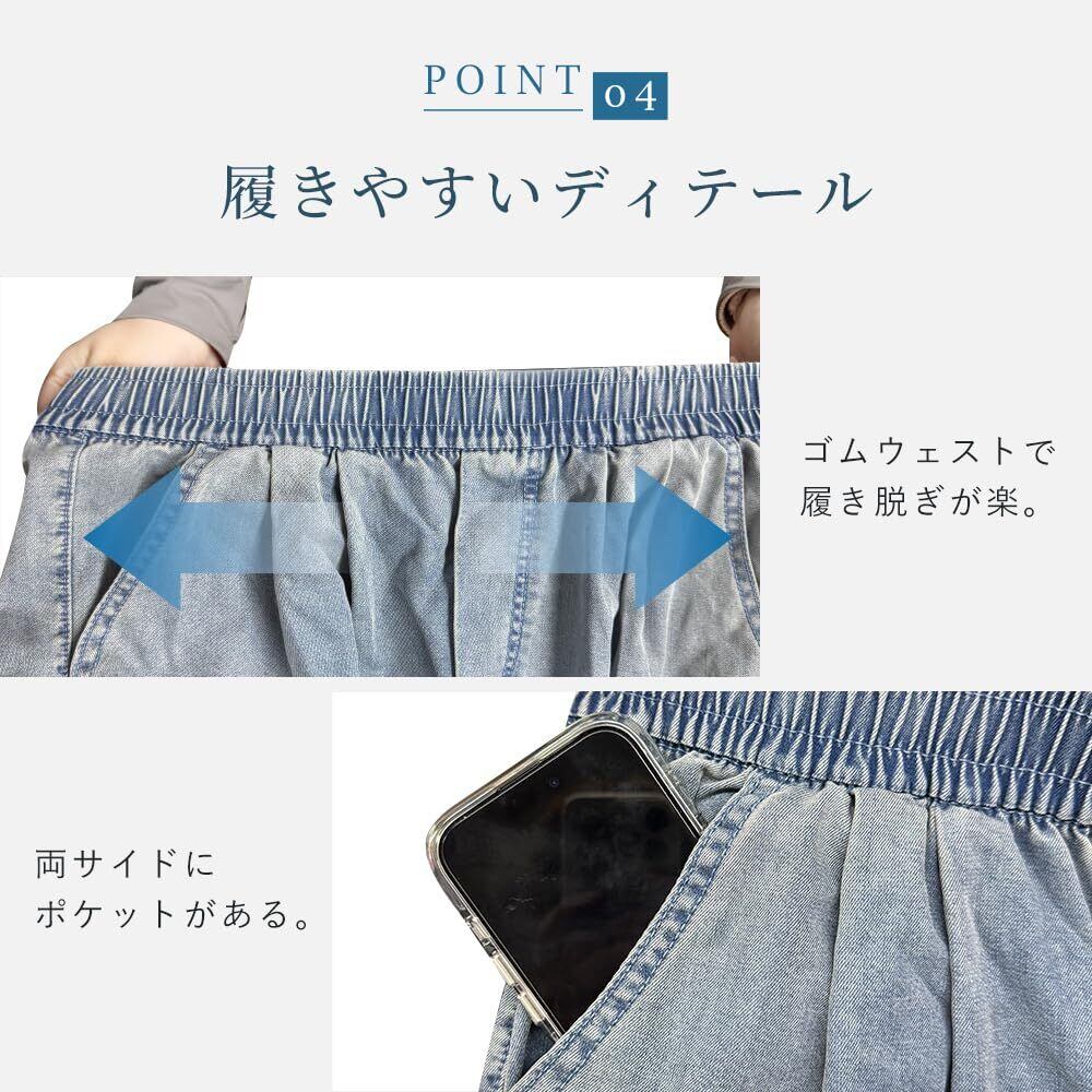【履きやすいディテール】ゴムウェストで履き脱ぎが楽。両サイドにポケットがある。ワイドシルエットでストレスフリー。