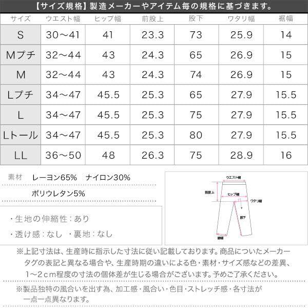 【S】ウエスト幅 30-41、ヒップ幅 41、裾幅 14、股下 73、ワタリ幅 25.9、前股上 23.3【Mプチ】ウエスト幅 32-44、ヒップ幅 43、裾幅 15、股下 65、ワタリ幅 26.9、前股上 24.3【M】ウエスト幅 32-44、ヒップ幅 43、裾幅 15、股下 74、ワタリ幅 26.9、前股上 24.3【Lプチ】ウエスト幅 34-47、ヒップ幅 45.5、裾幅 15.5、股下 65、ワタリ幅 27.9、前股上 25.3