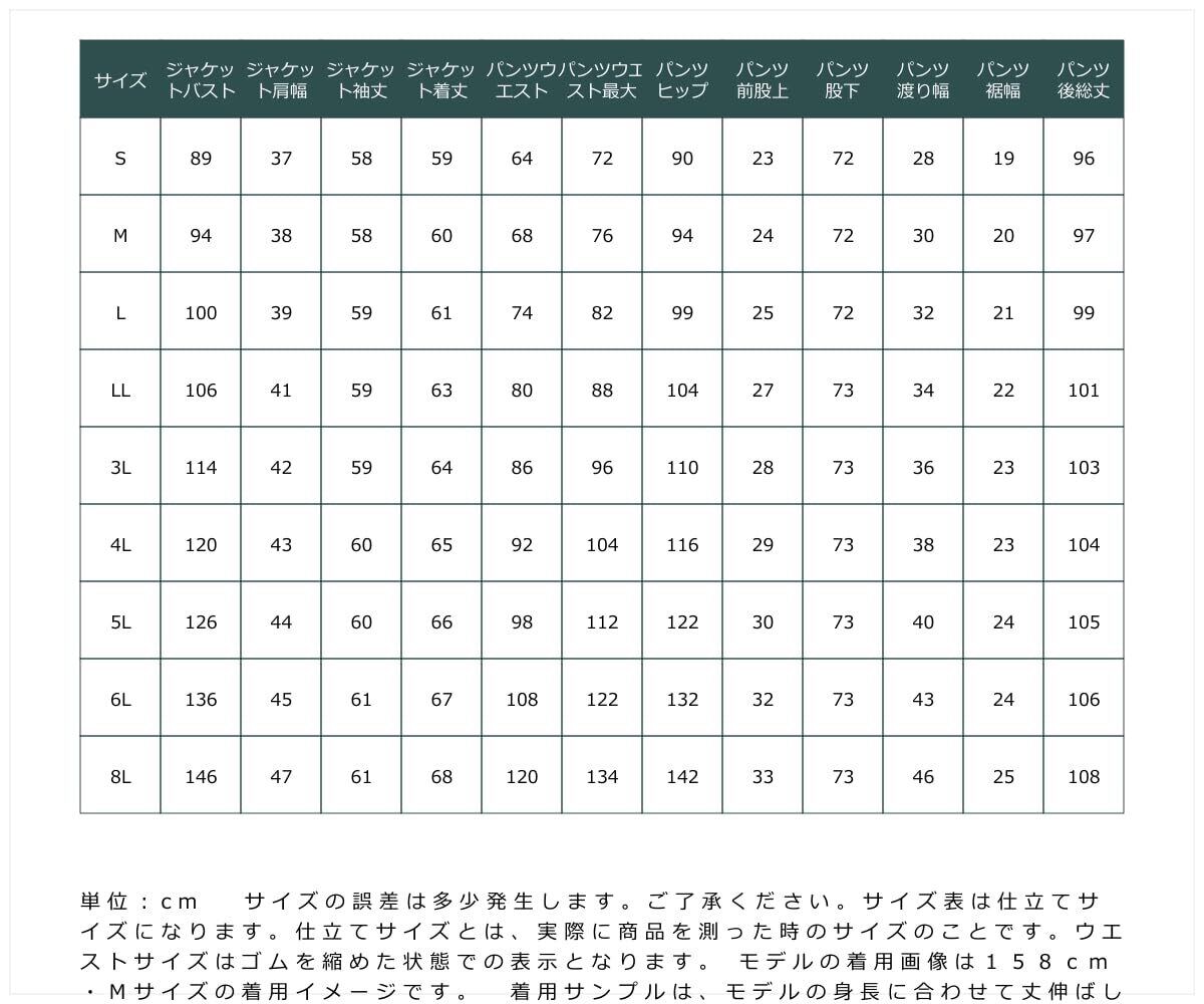 [裏地]有(ジャケット:背抜き パンツ:無) ジャケット:肩パッド有(取外し不可) 前ボタン開 ポケット前2・左胸・内 袖口スリット 後ベンツ パンツ:前ファスナー内ボタン付ホック開 ウエスト後ゴム入 ポケット両脇・後飾り