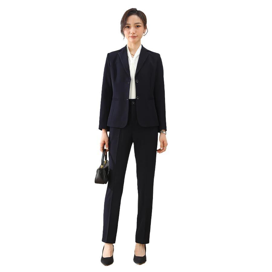【きちんと感と上品さを両立したパンツスーツ】テーラードジャケット×ストレートパンツのセットアップ。シンプルかつ美シルエットで、通勤・オフィス・ビジネススーツとしてはもちろん、フォーマルな場にも幅広く対応。