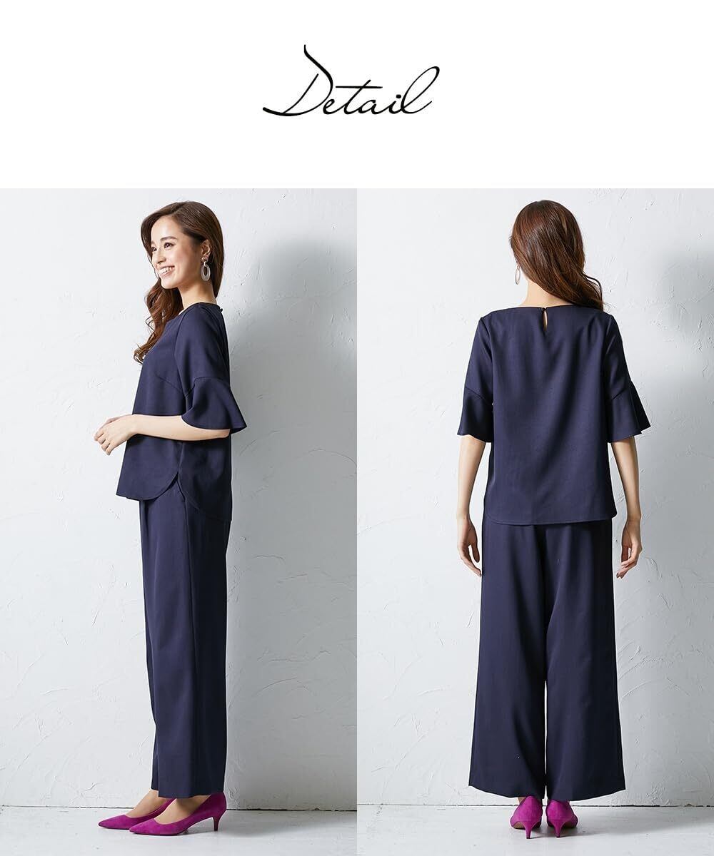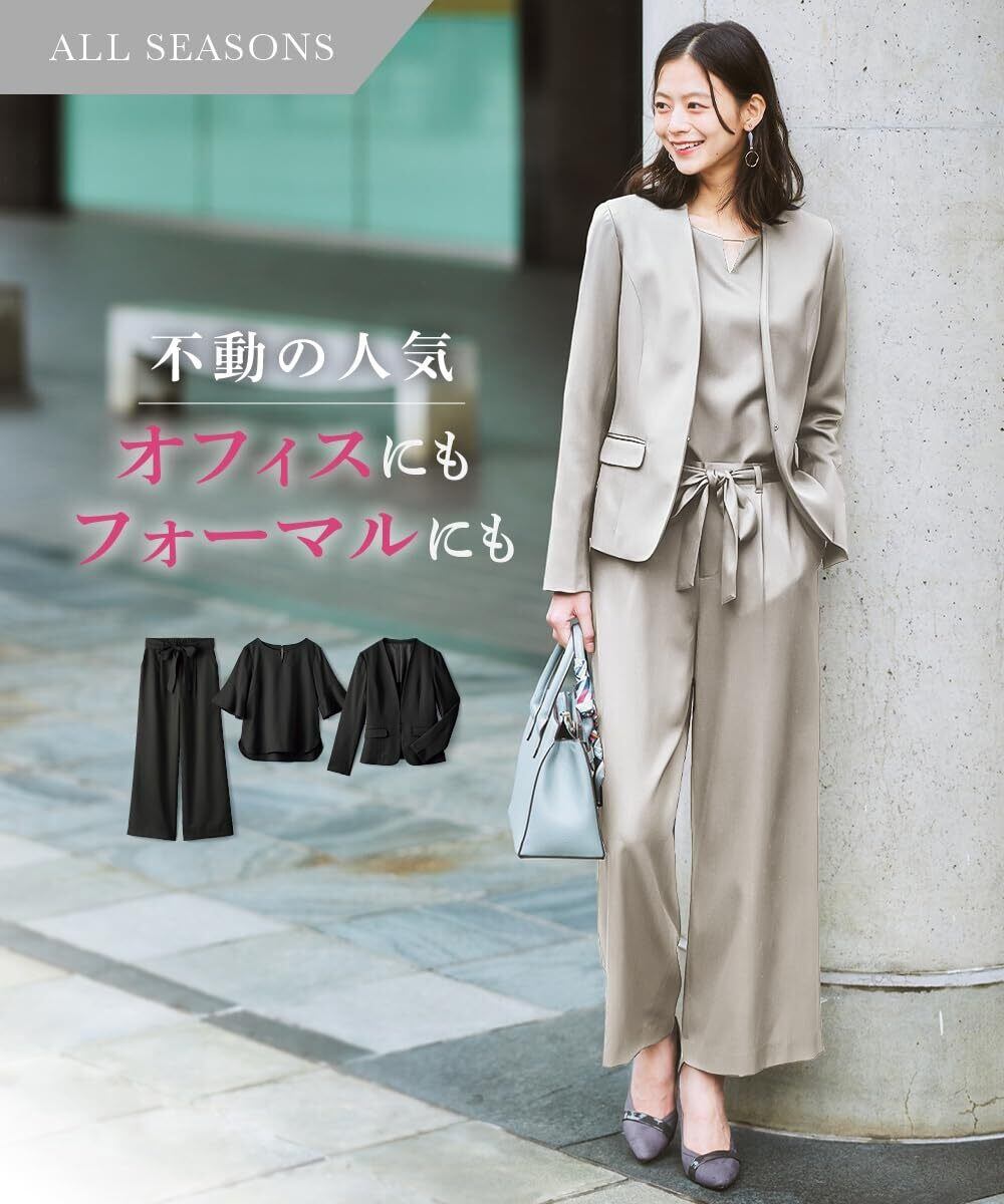 [ニッセン] パンツスーツ 【レディーススーツ】 ドビー素材セットアップパンツスーツ3点セット(ノーカラージャケット+フレア袖ブラウス+リボン付ワイドパンツ)