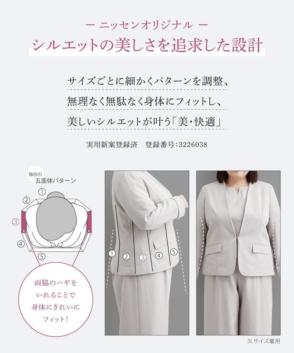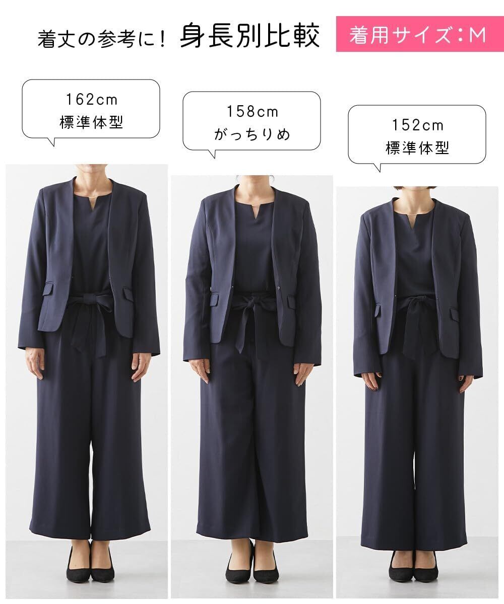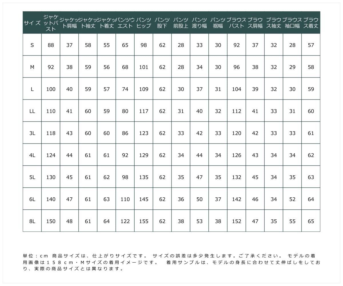 透け感:なし 伸縮性:なし 生地の厚み:やや薄手 光沢感:なし 裏地:ジャケット:有(背抜き)ブラウス・パンツ:無 季節:春・秋 シルエット:ジャケット:普通 ブラウス・パンツ:ゆったり ※ジャケットはLLサイズから五面体仕様です。
