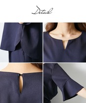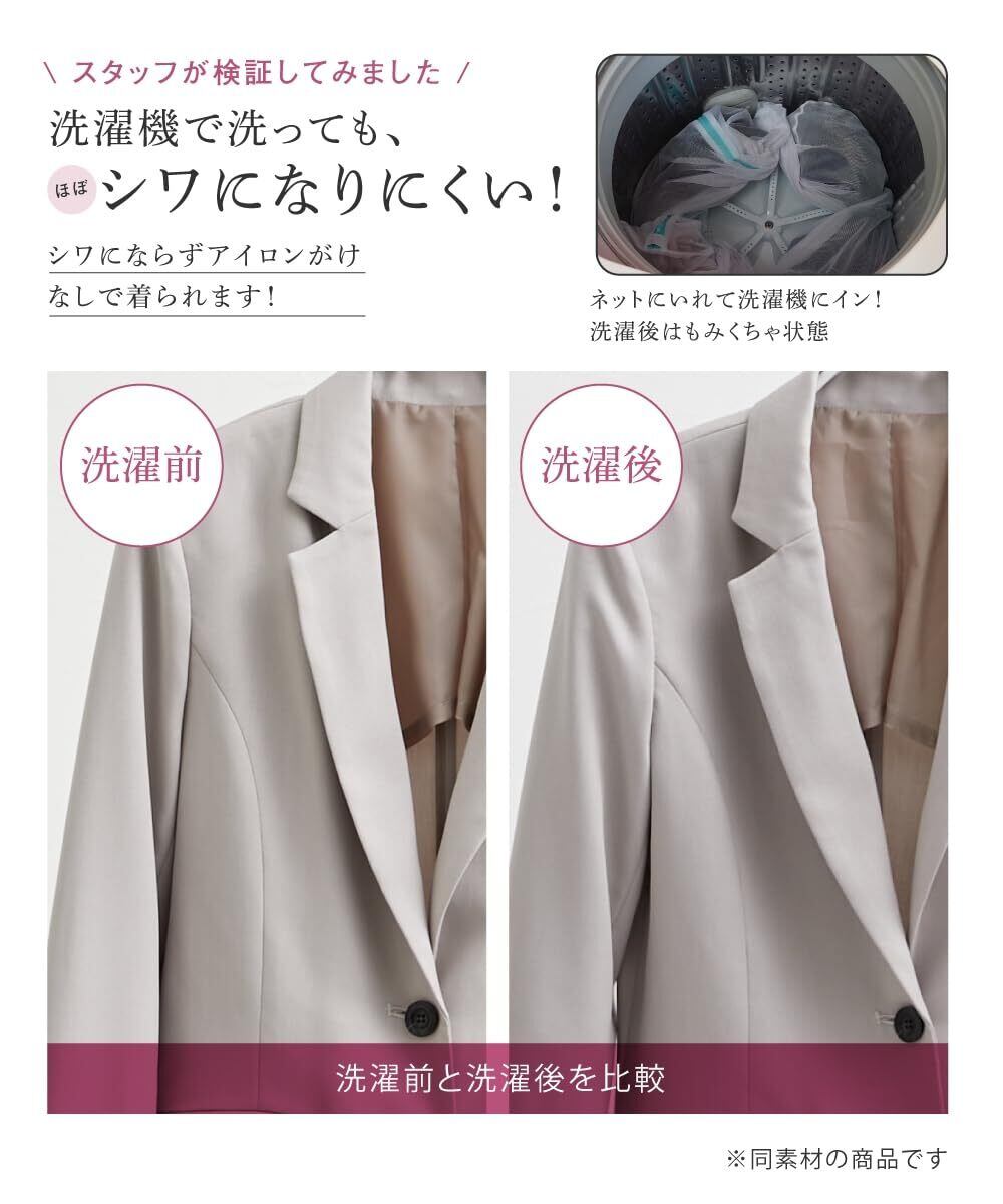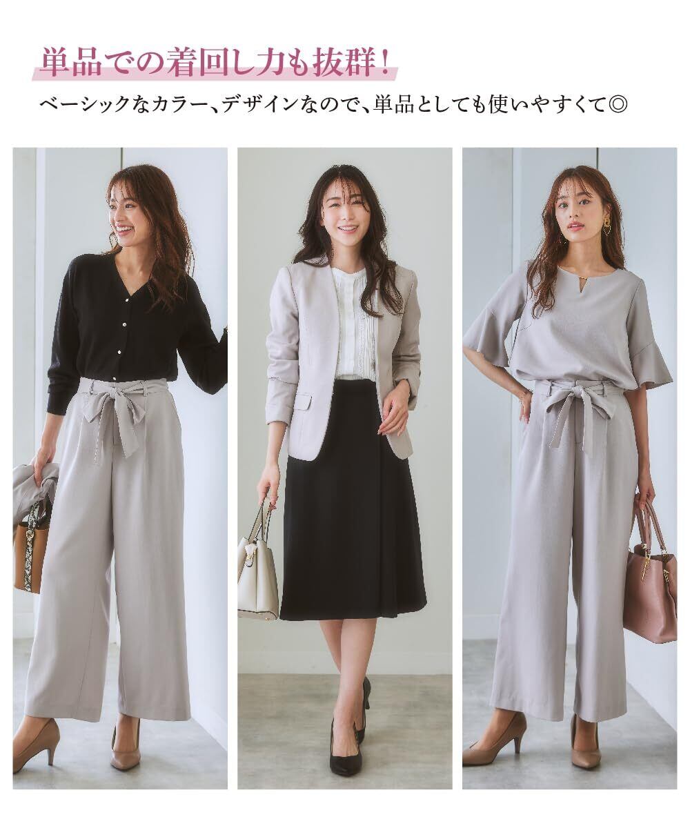 <生産国>中国製 <洗濯・お手入れ方法>洗濯機OK ネット使用 ※共布リボンは取り外しできます。 ※淡色は透けやすいので、ベージュ系のインナーをご着用ください。 ※この商品はジャケット・ブラウス・パンツの3点同サイズのみで販売します。