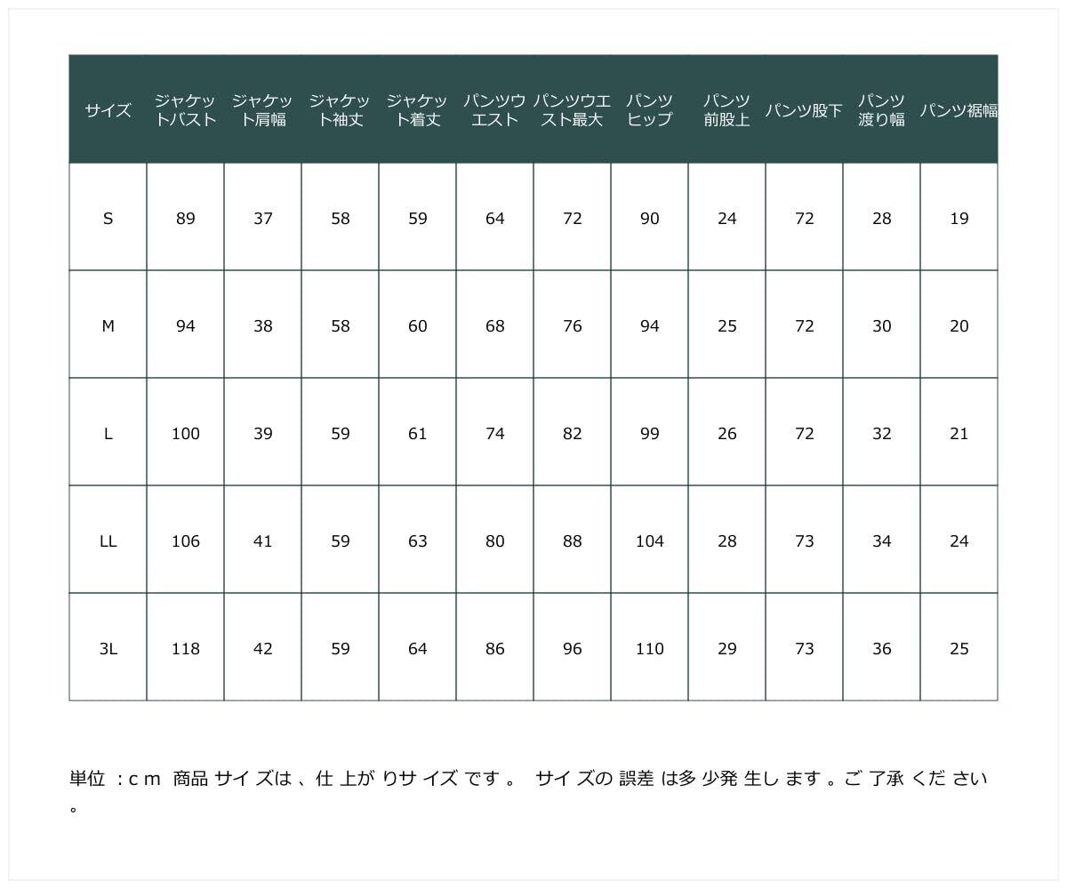 <仕様>品質=[表地]ポリエステル100% [裏地]有(ジャケット:総裏)パンツ無 ジャケット:肩パッド有(取外し不可) 前ボタン開 ポケット両脇 パンツ:前ファスナー内ホック開 ウエスト両脇ゴム入 ポケット両脇