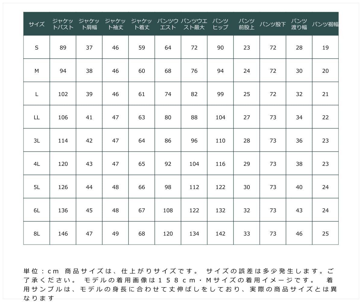 <仕様>品質=[表地]ポリエステル65%・レーヨン30%・ポリウレタン5% [裏地]有(ジャケット:背抜き・袖裏なし パンツ:無)ジャケット:肩パッド無 前ボタン開 袖口スリット ポケット両脇・左胸・左内 後ベンツパンツ:ウエスト後ゴム入 前ホック内ボタン付ファスナー開 ポケット両脇・後飾り